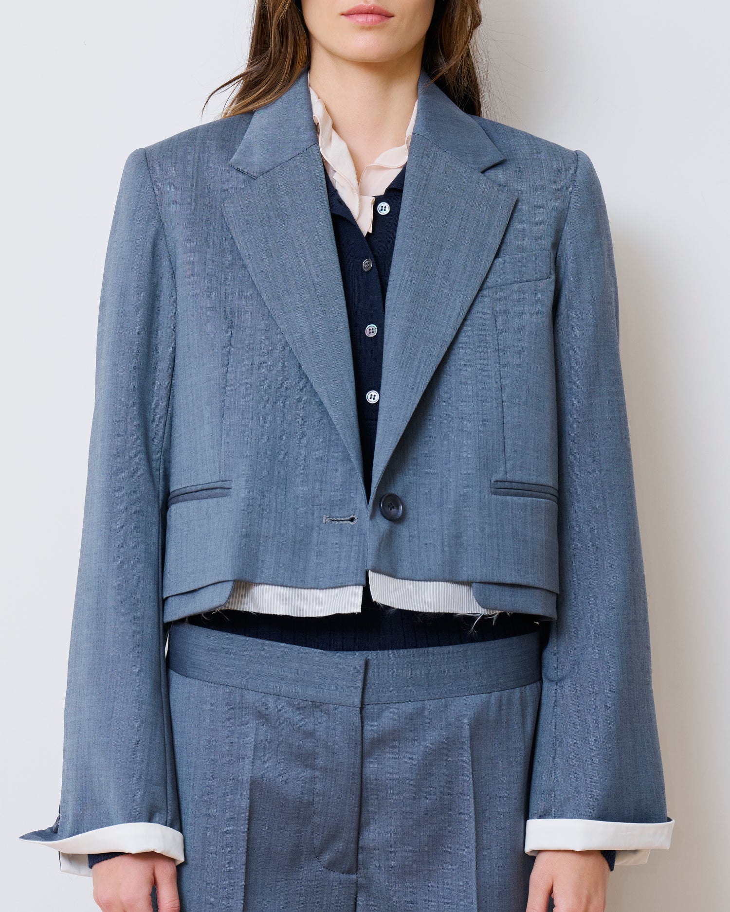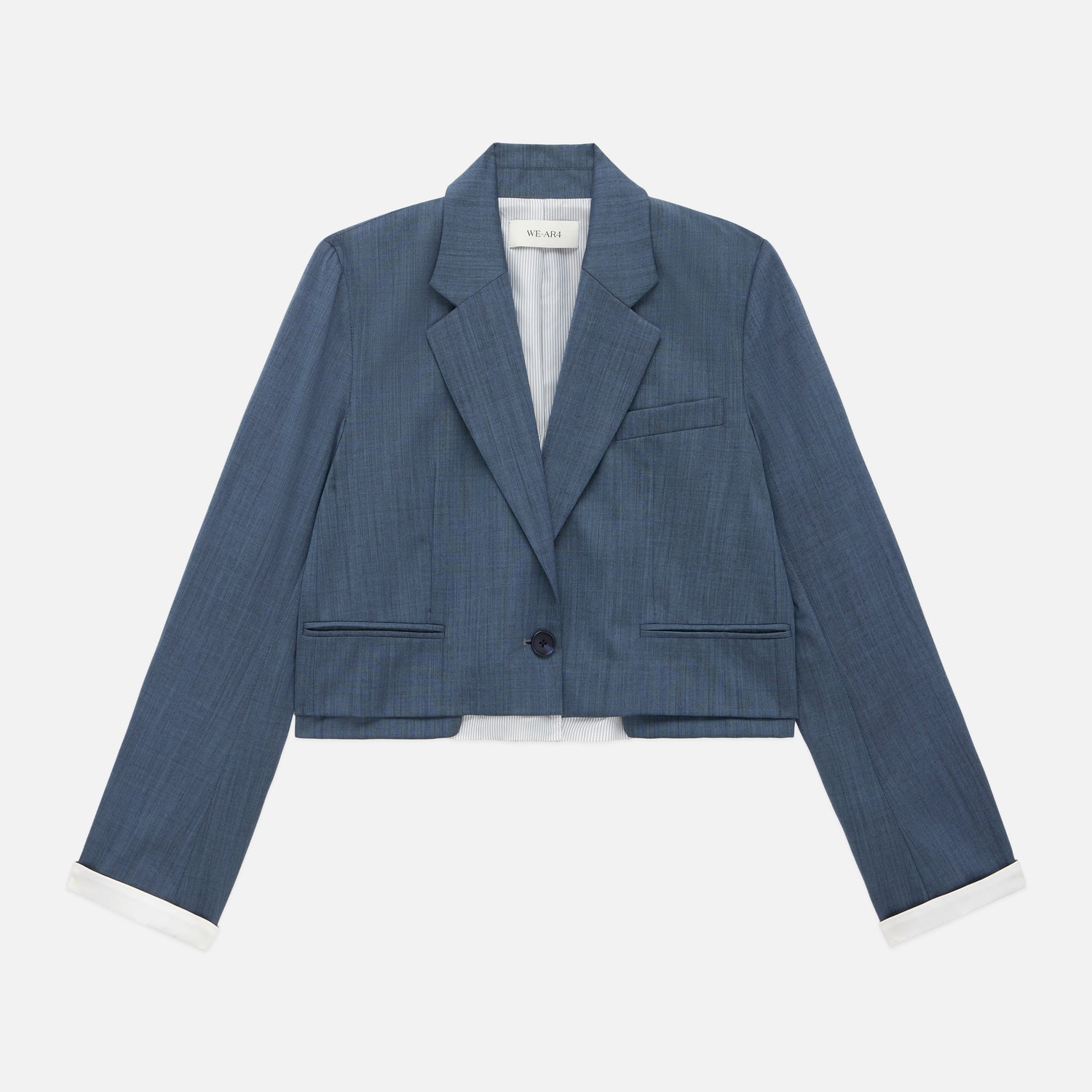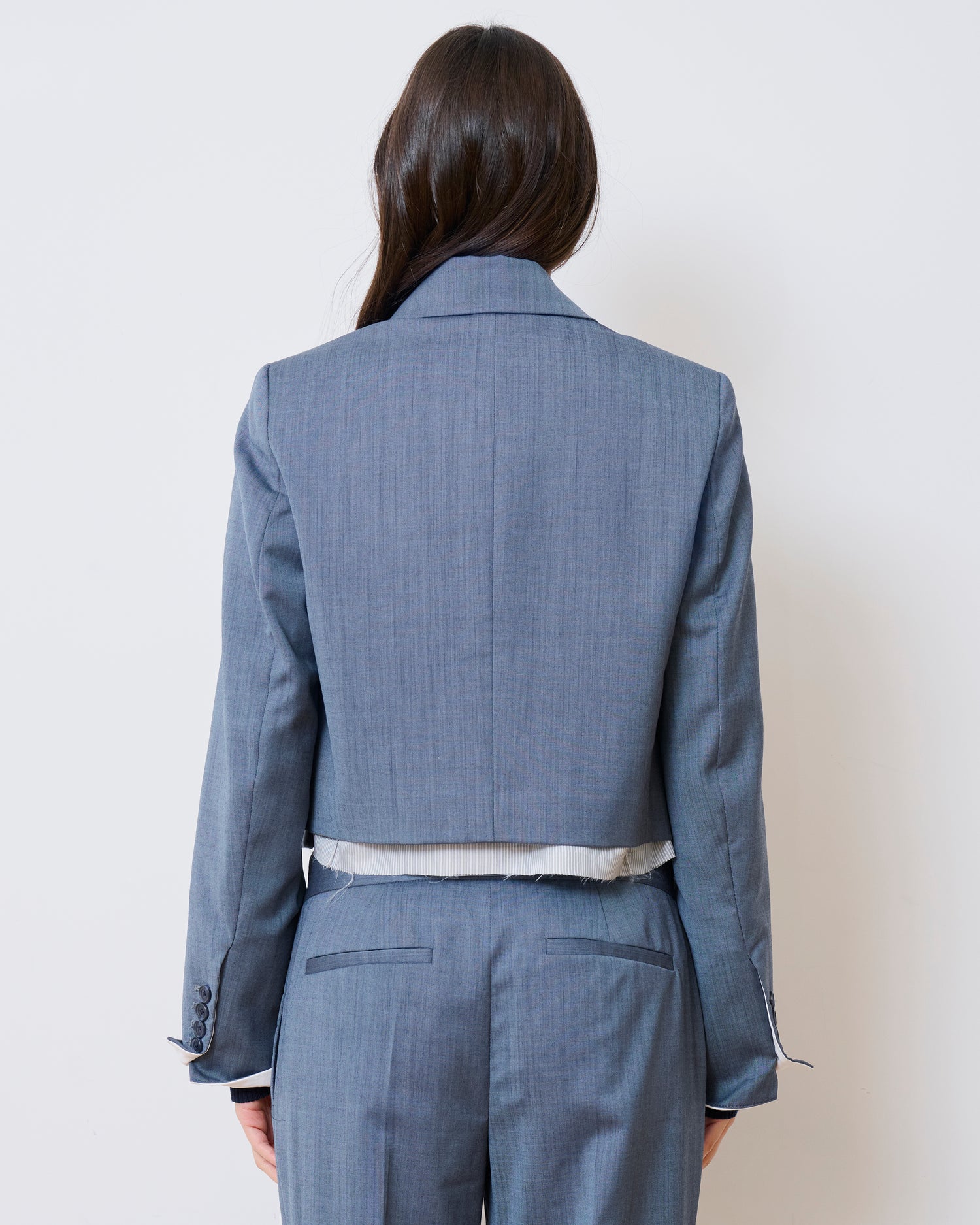 The Cocktail Blazer is a study in refined contrasts. Crafted from luxurious wool, its tailored, cropped fit redefines the classic silhouette with a clean, modern aesthetic. The unexpected touch of raw-edge lining at the hem adds a subtle note of effortless sophistication, making this piece an essential for any curated wardrobe.