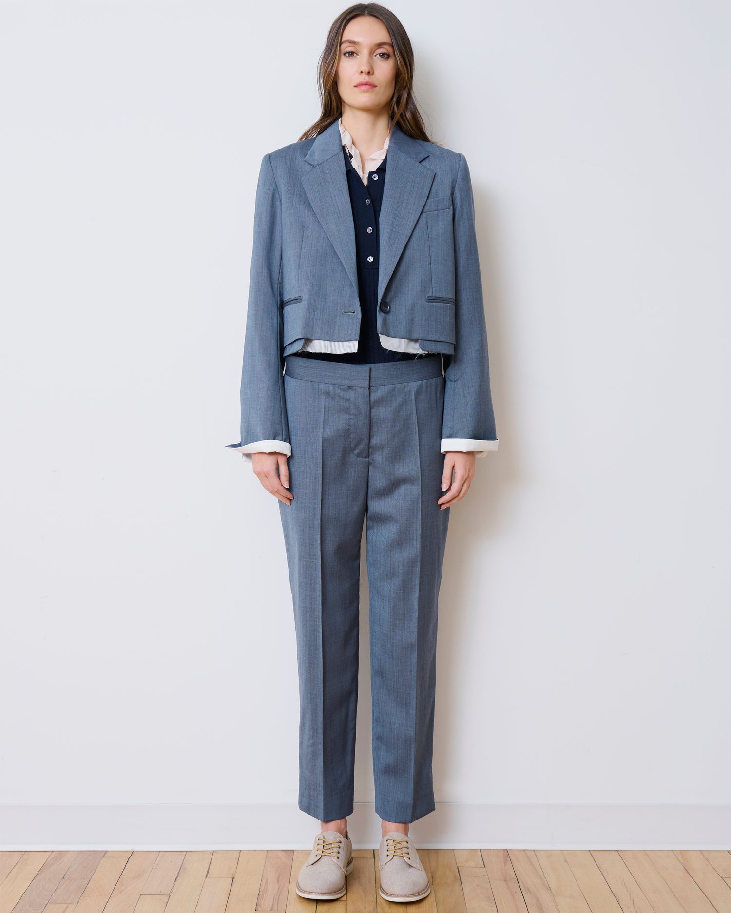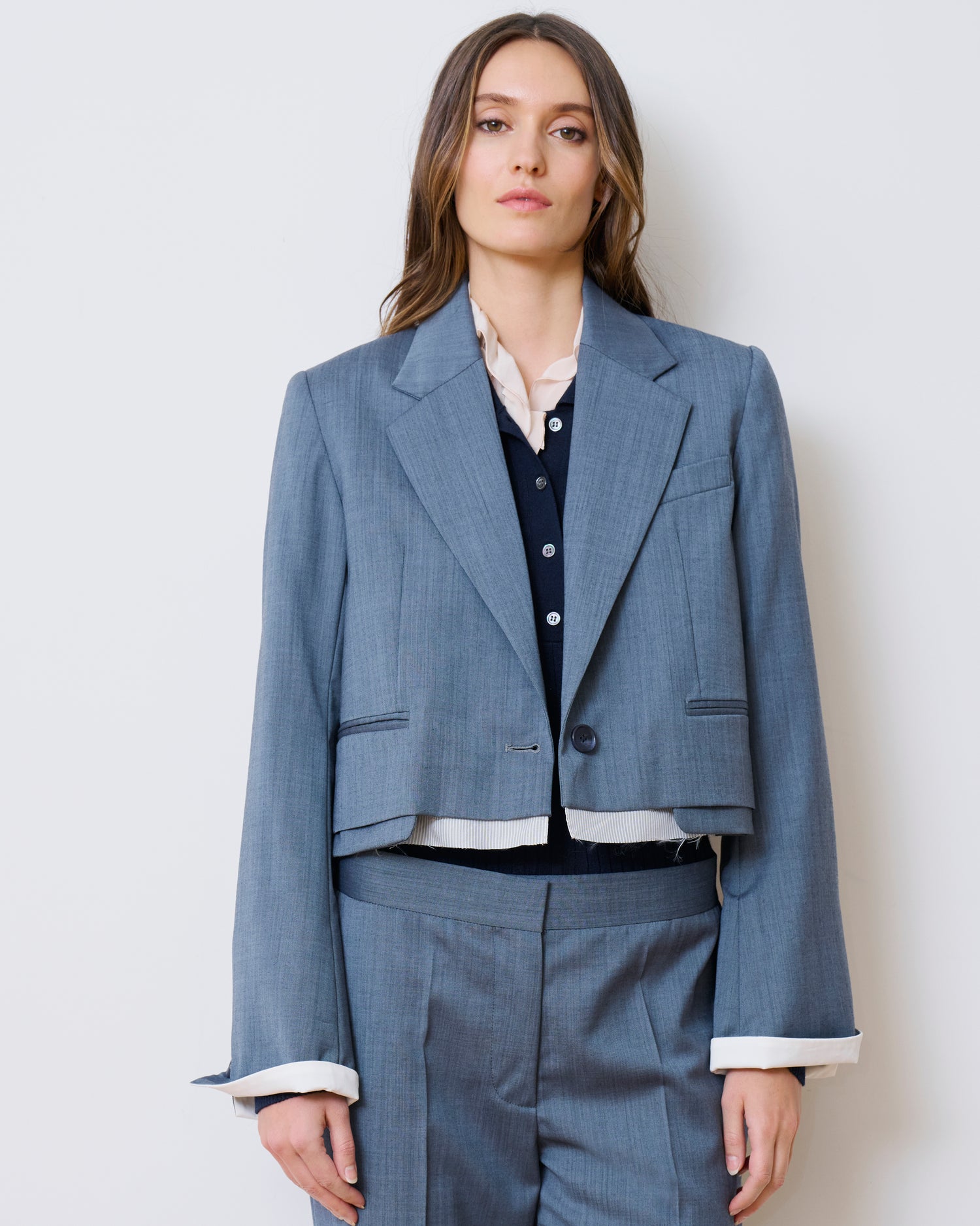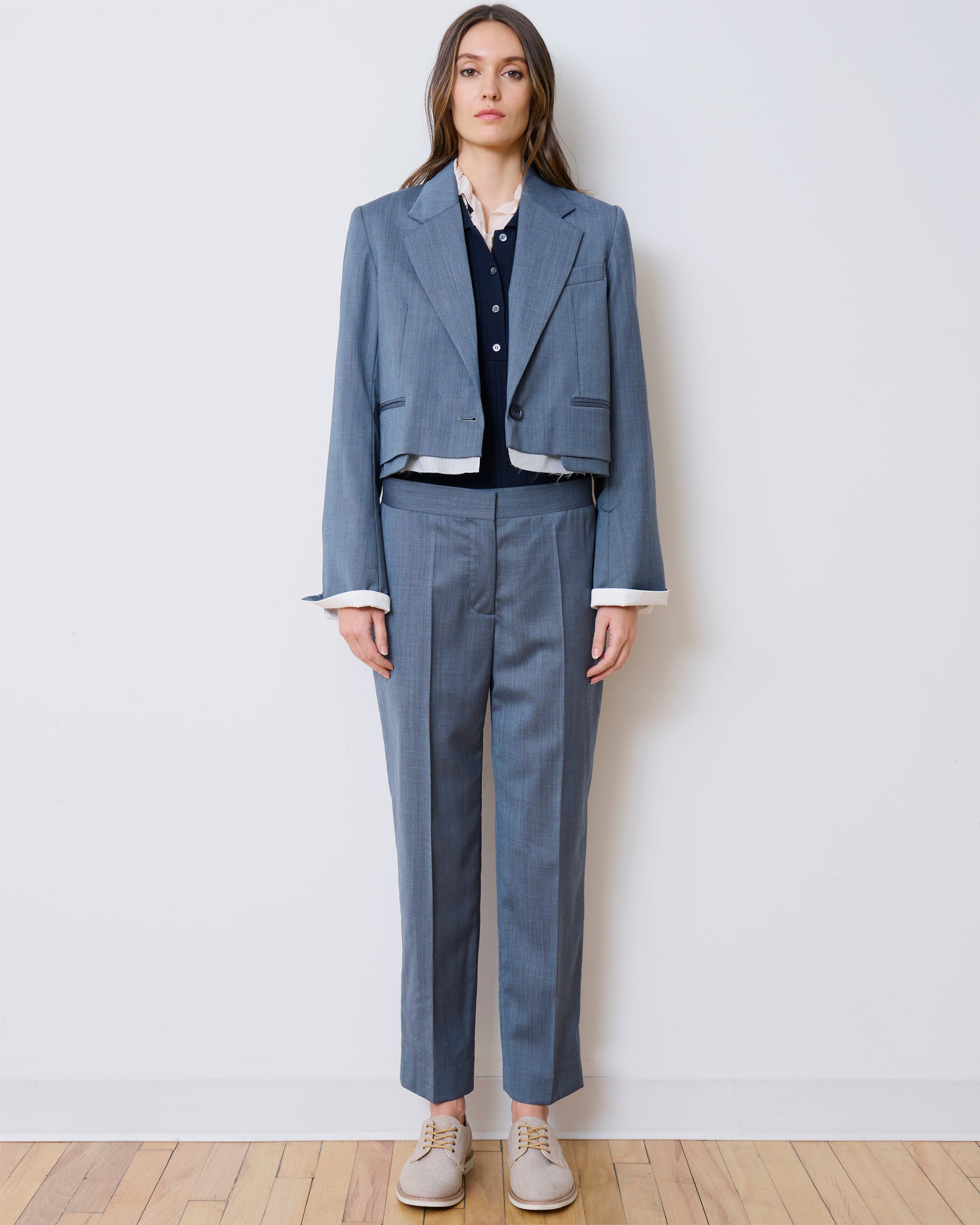 The Cocktail Blazer is a study in refined contrasts. Crafted from luxurious wool, its tailored, cropped fit redefines the classic silhouette with a clean, modern aesthetic. The unexpected touch of raw-edge lining at the hem adds a subtle note of effortless sophistication, making this piece an essential for any curated wardrobe.