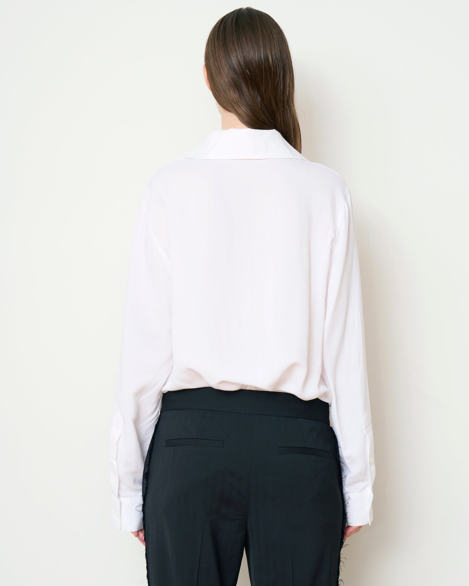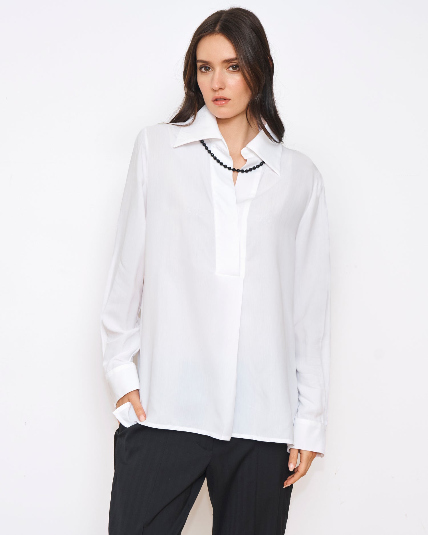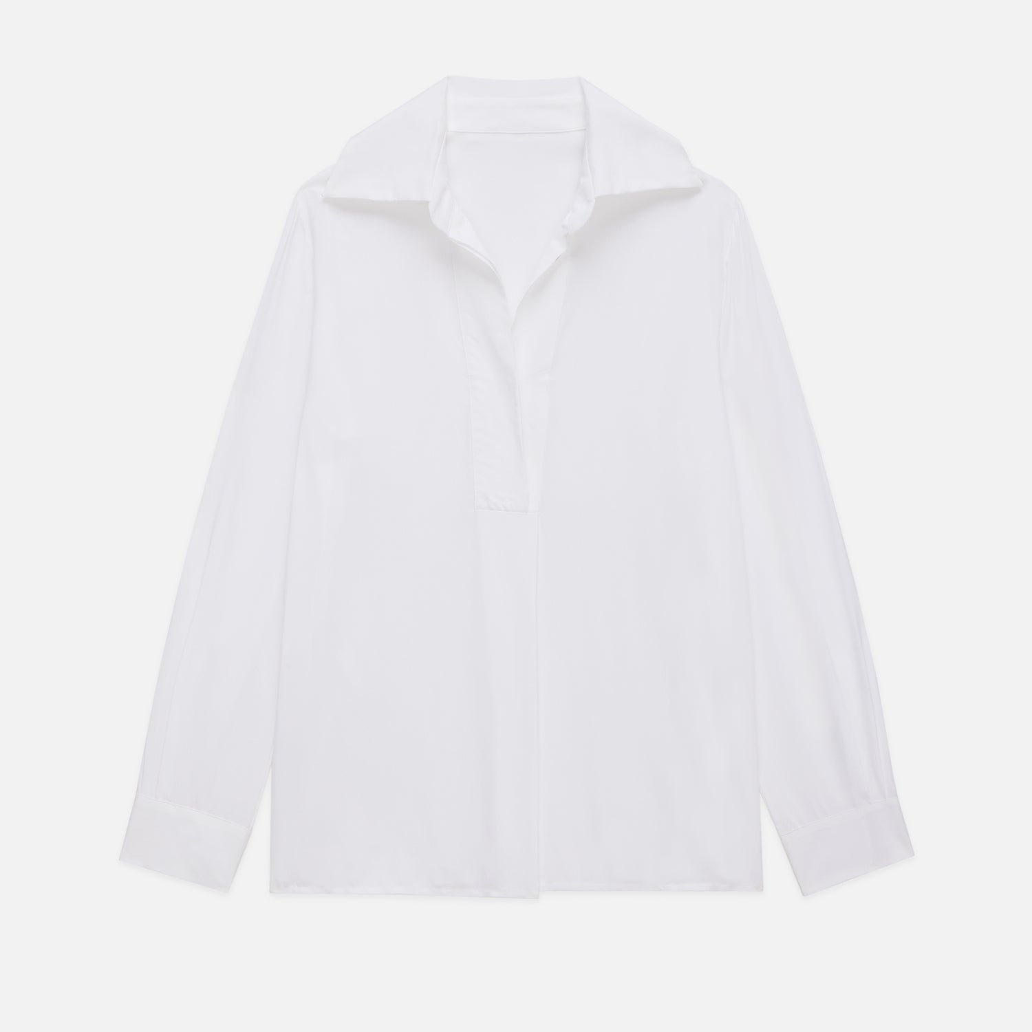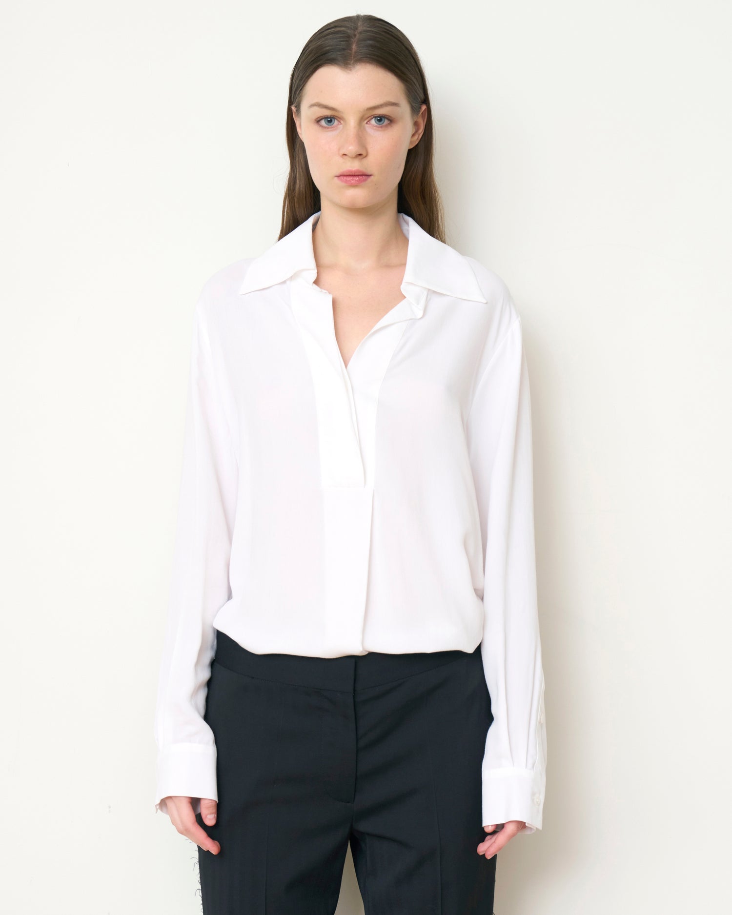 A light layer of femininity, the Standard Blouse has an exaggerated front placket with a concealed button closure that softens a tailored look. An unexpected asymmetric front pleat sets this classic top delightfully askew.