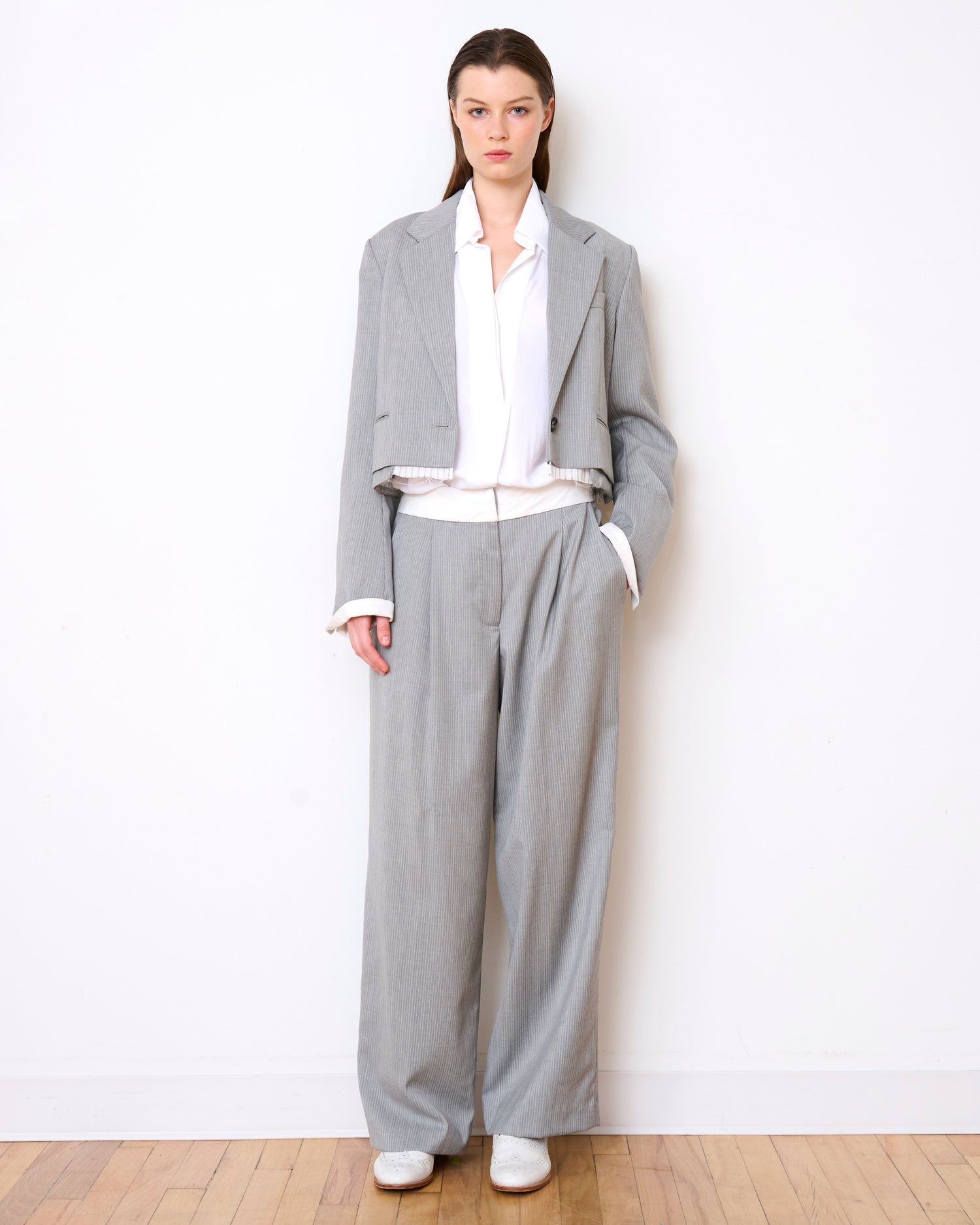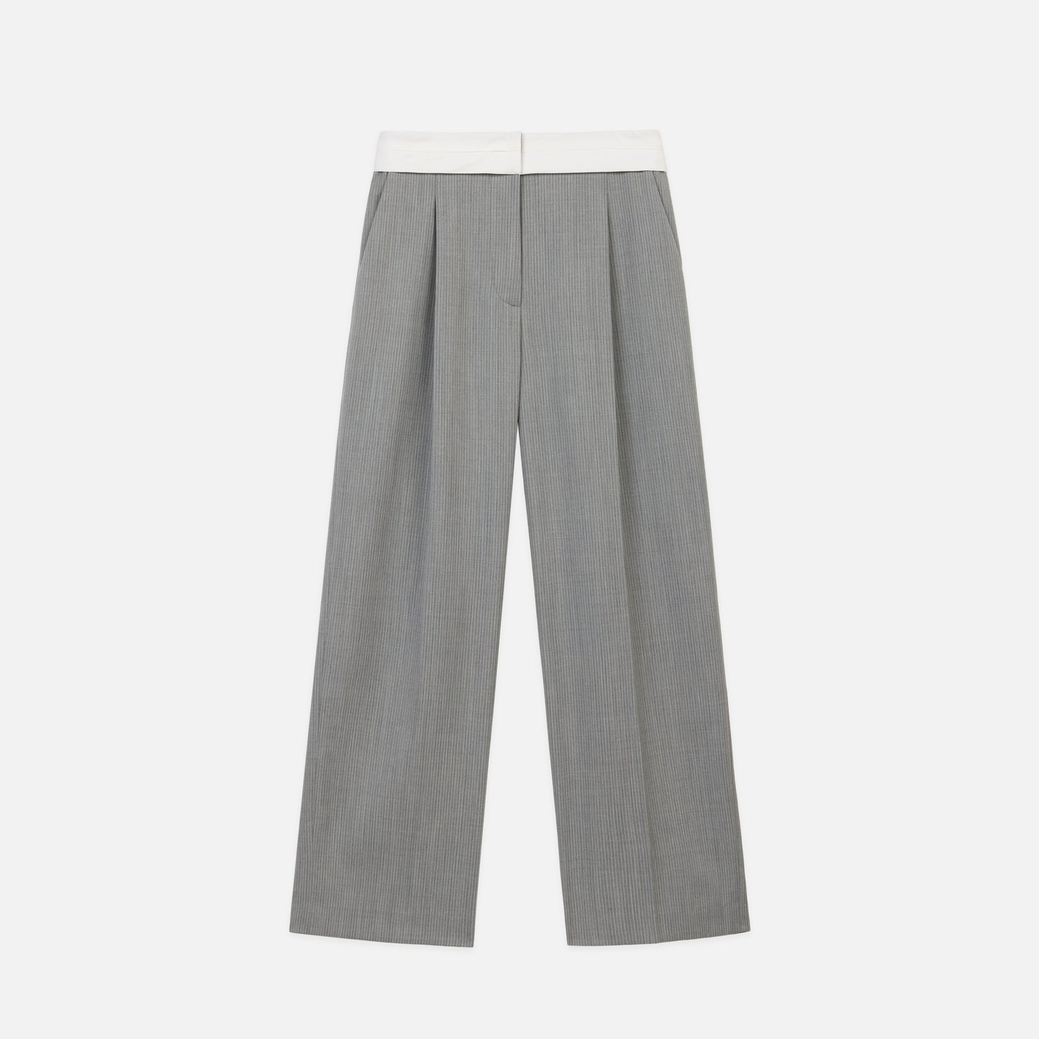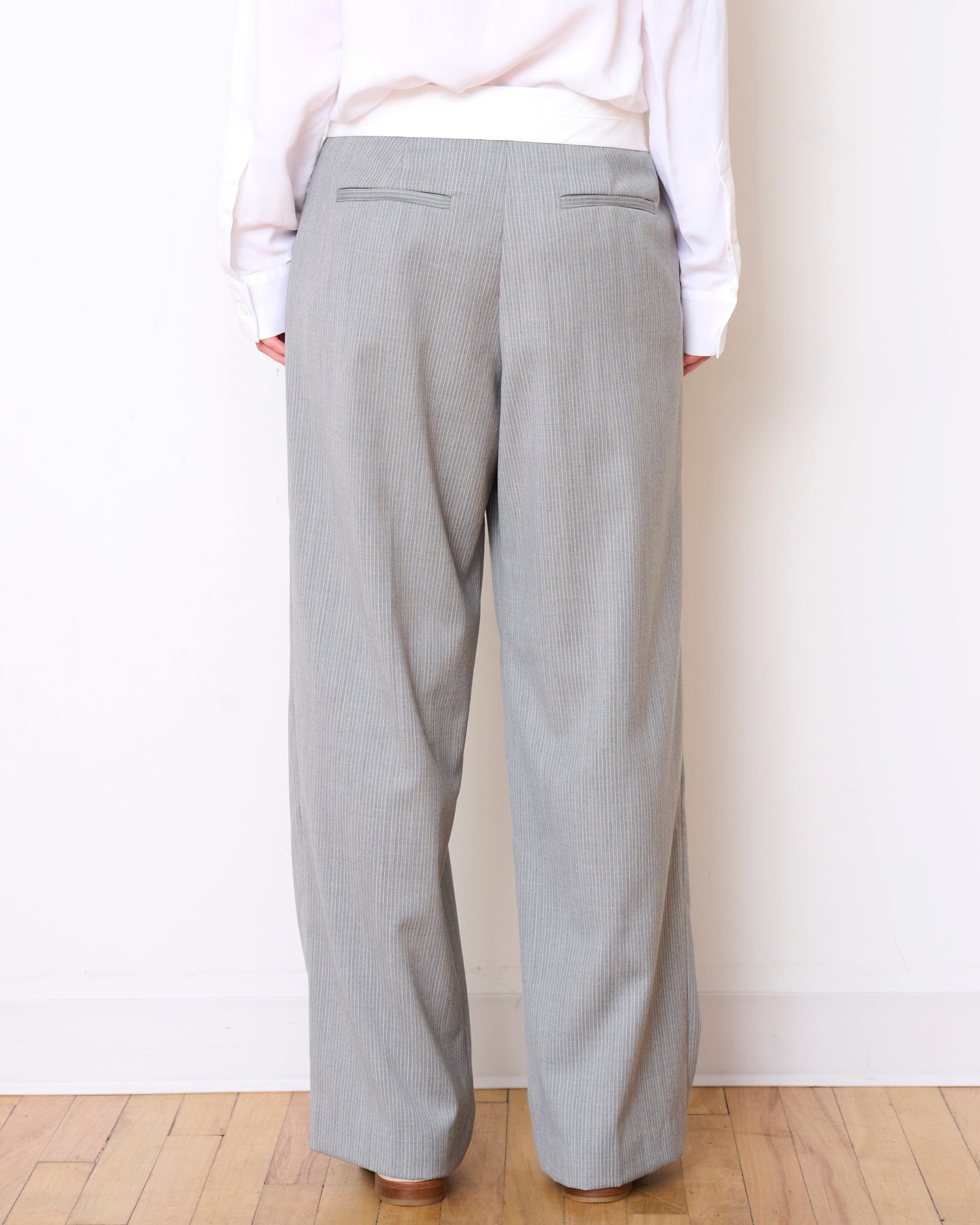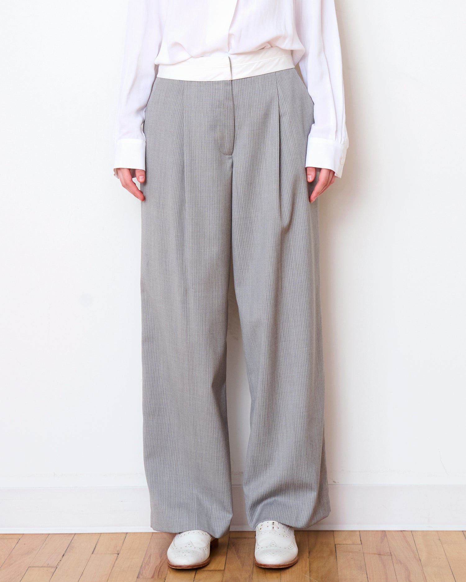 The menswear-inspired, Tribeca Trouser, is crafted in luxurious wool with relaxed clean lines. An exposed waistband curtain and a wide leg silhouette are complemented with feminine pleating.