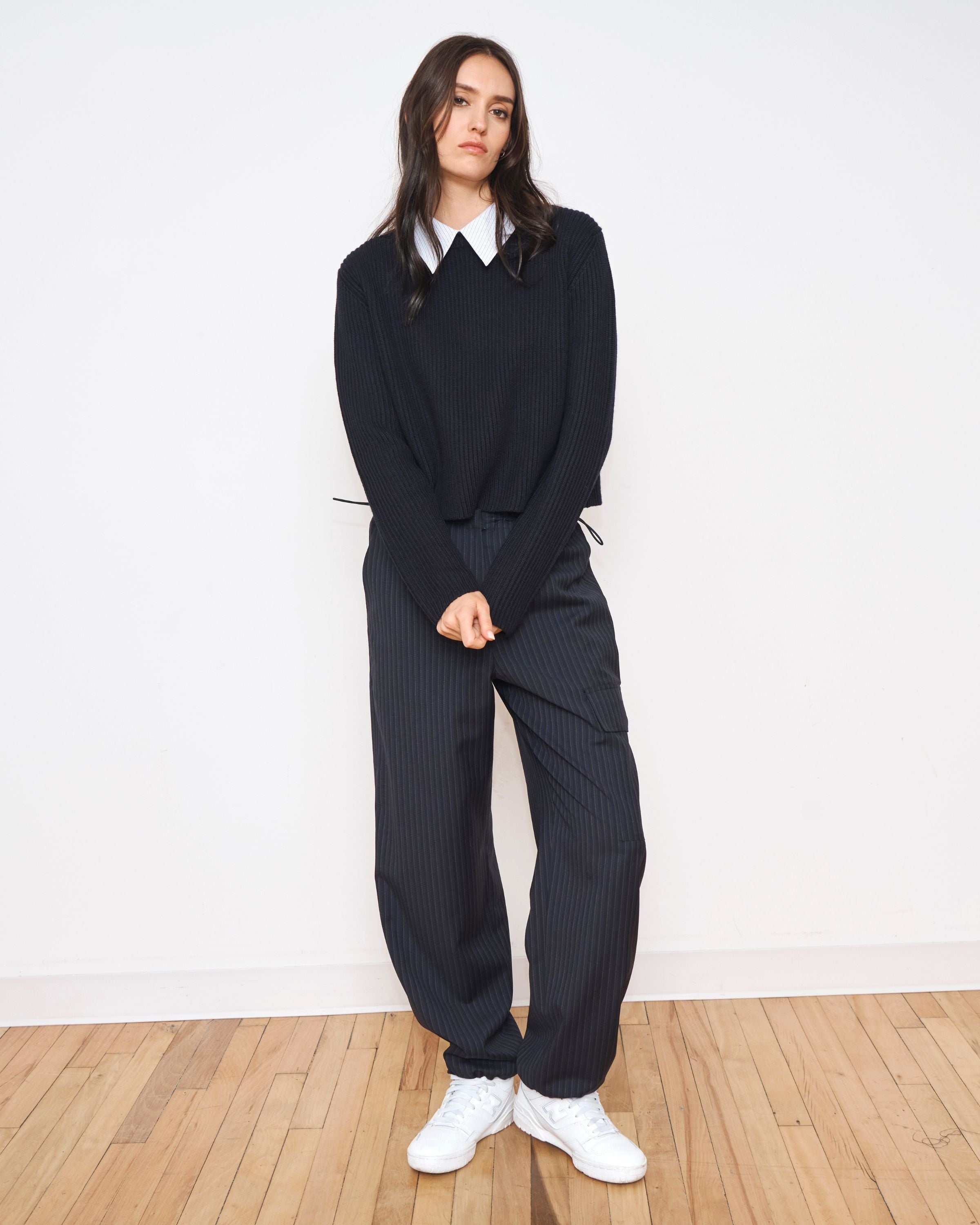 This chunky crewneck is spliced with shirting details and doses of femininity. The Gallery Knit offers an element of modern prep with its contrast detachable poplin collar and exposed button-back closure. An unexpected playfulness and self-expression pull at the edges of this classic silhouette.