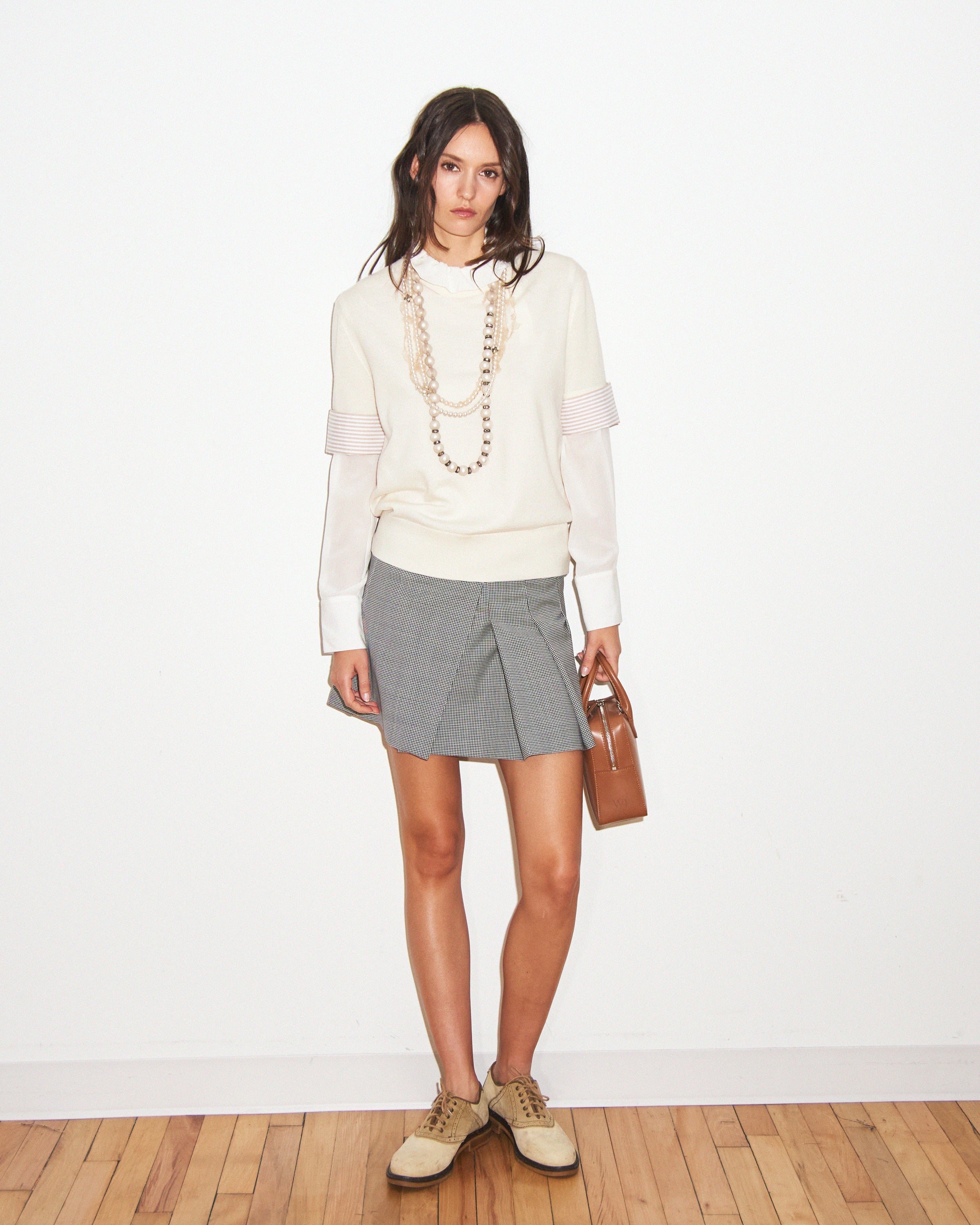 An update to the preppy schoolgirl staple, the Noho Skirt has an asymmetrical front panel with timeless box pleats. Style it with our cropped Ford Blazer for a sporty preppy vibe.