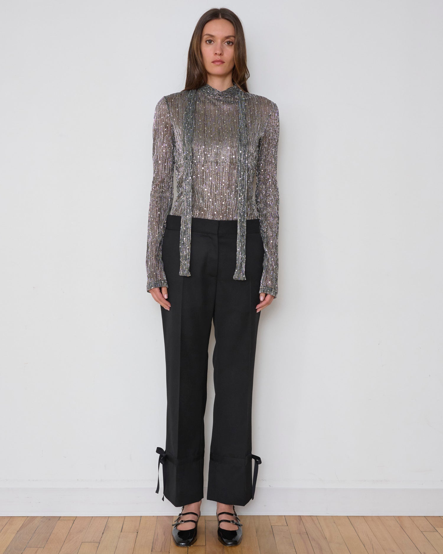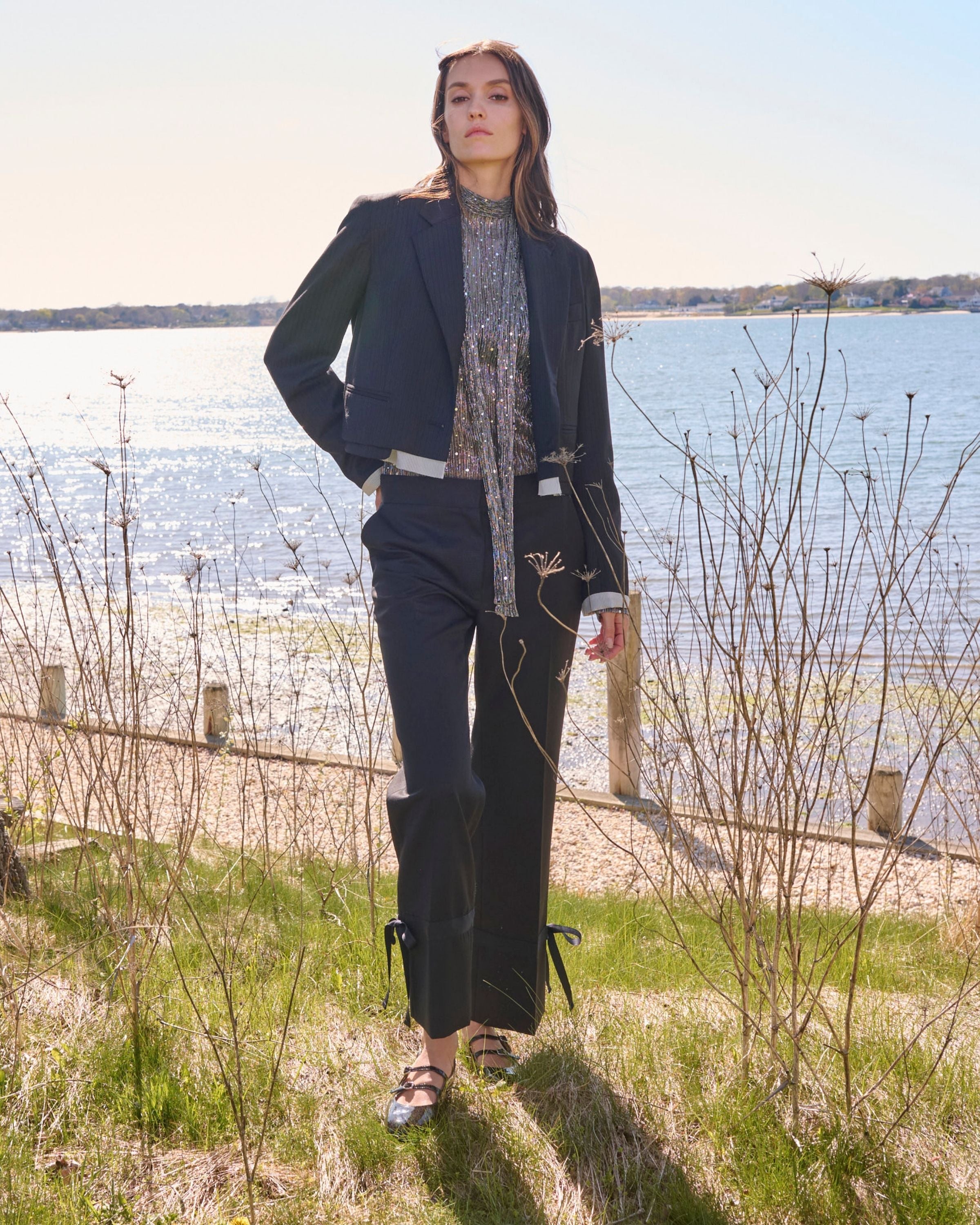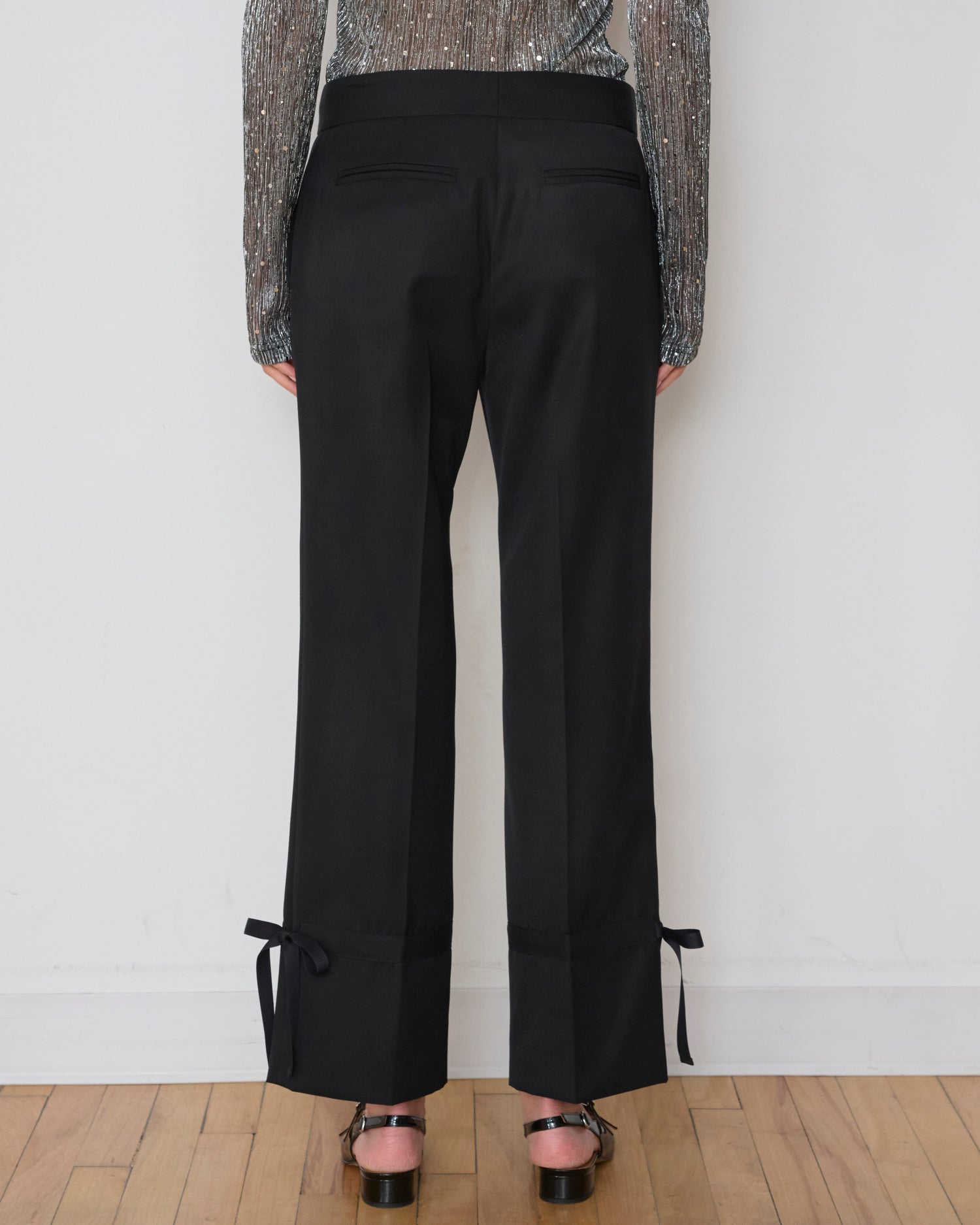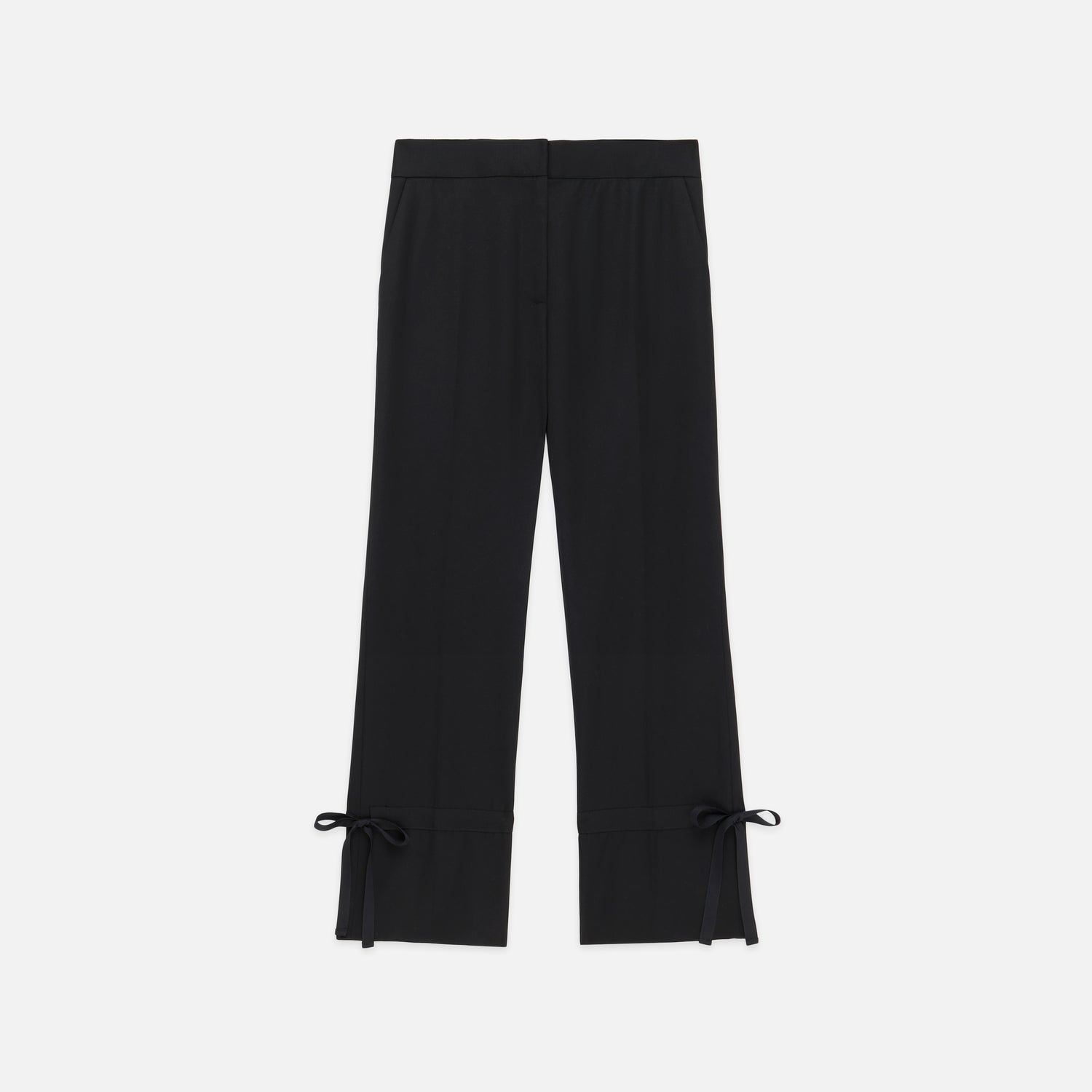 A study in polished rebellion. Our Cigarette Trouser is crafted from luxurious compact wools with a sleek, straight cropped leg that pays homage to timeless Audrey Hepburn style. The tailored fit is softened by a delicate satin ribbon at the hem—a touch of playful defiance for a life lived on your own terms.