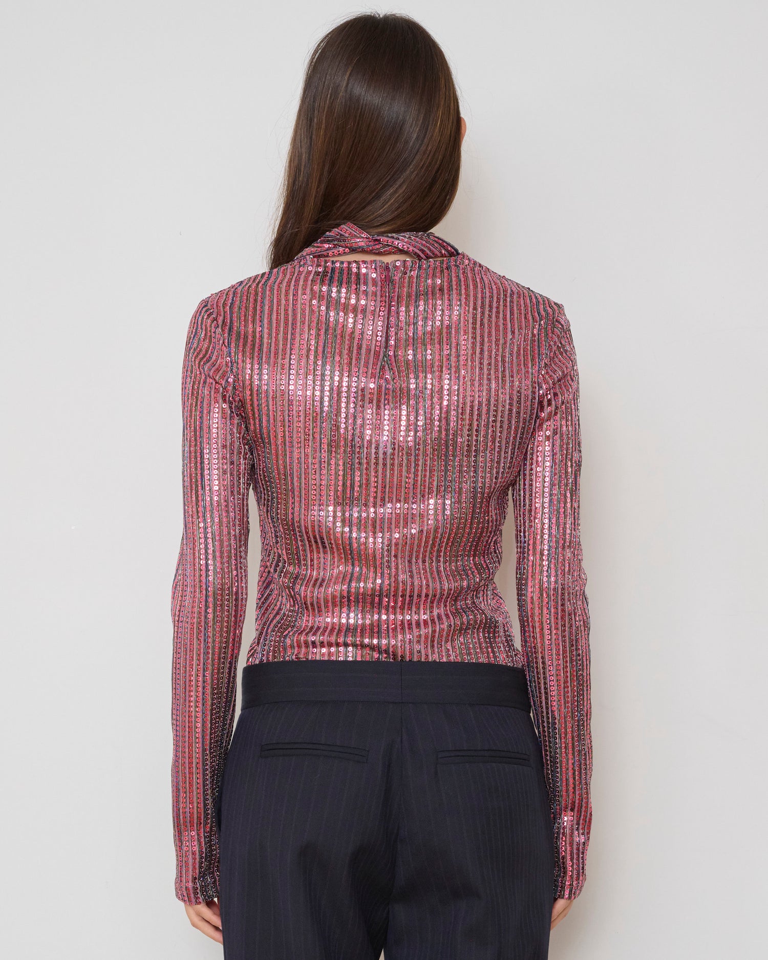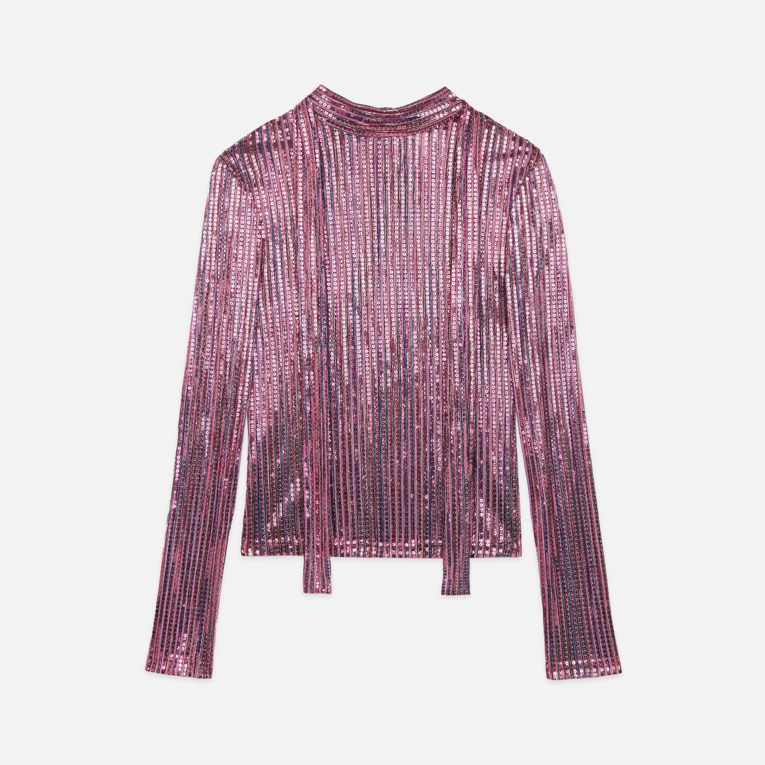A modern rebellion in light. The Disco Top is a sleek statement piece that reinterprets classic sparkle with a modern edge. Its shimmering fabric catches the light with every move, ensuring you command attention without saying a word. Its high-neck silhouette and fluid tie details offer a versatile elegance, allowing you to style it with a feminine bow or a nonchalant knot. It is a piece that blurs the lines between bold glamour and minimalist sophistication.