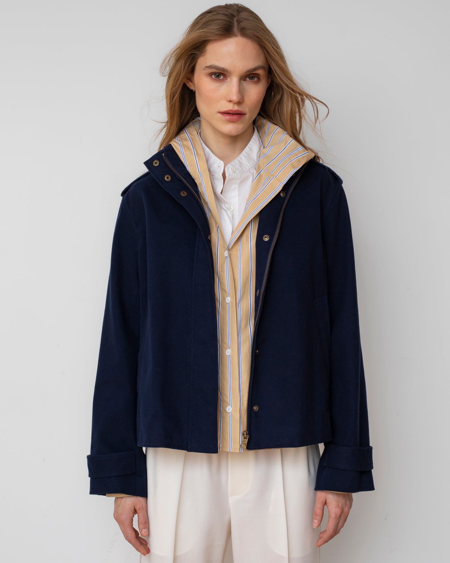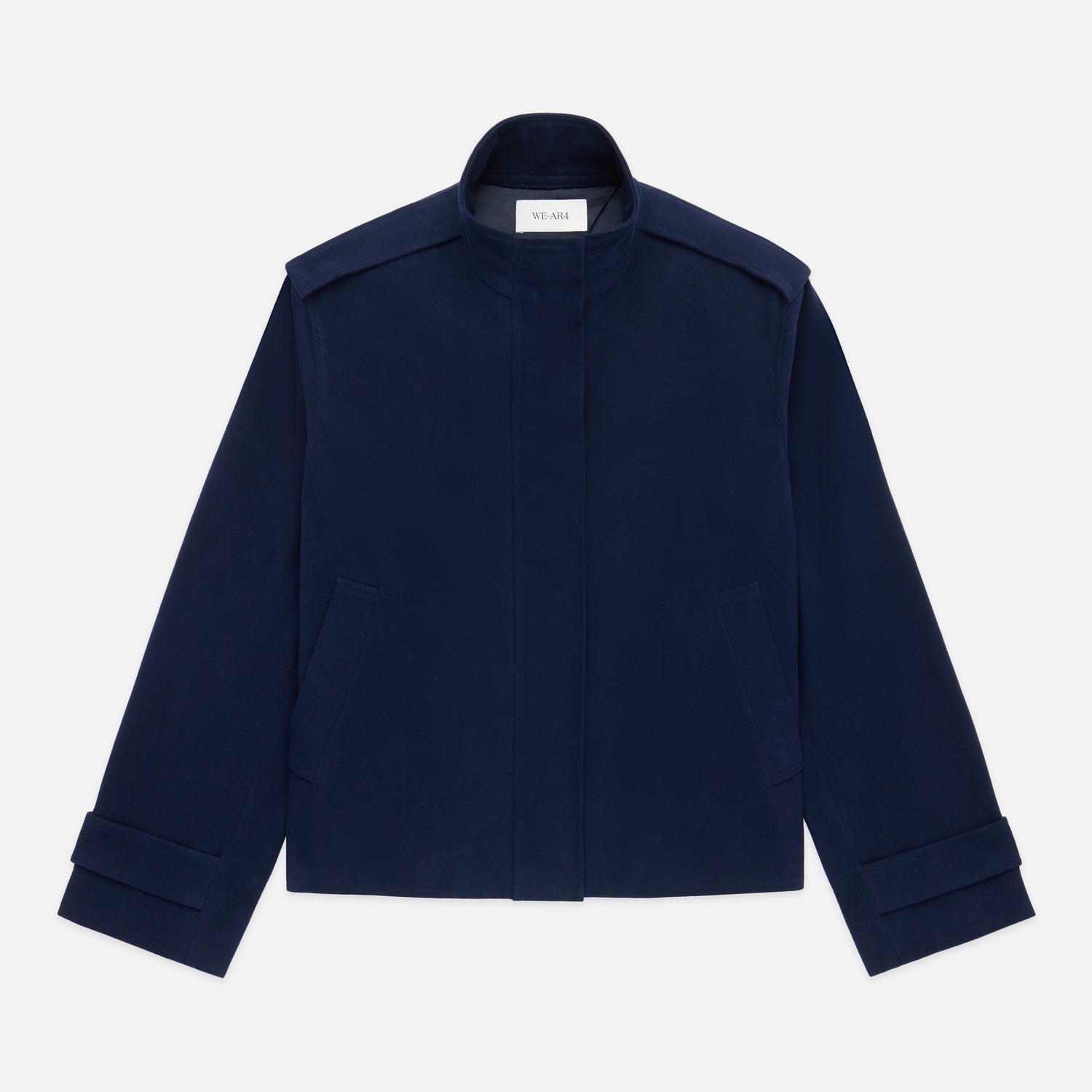 Elevate your city uniform with the Split Jacket. This cotton-crafted piece reimagines structure through a cropped, boxy lens, accented by elegant shoulder epaulets and a sleek concealed closure. Exaggerated side vents offer a dramatic sense of movement, while belted cuffs lend a sophisticated, tomboyish charm.