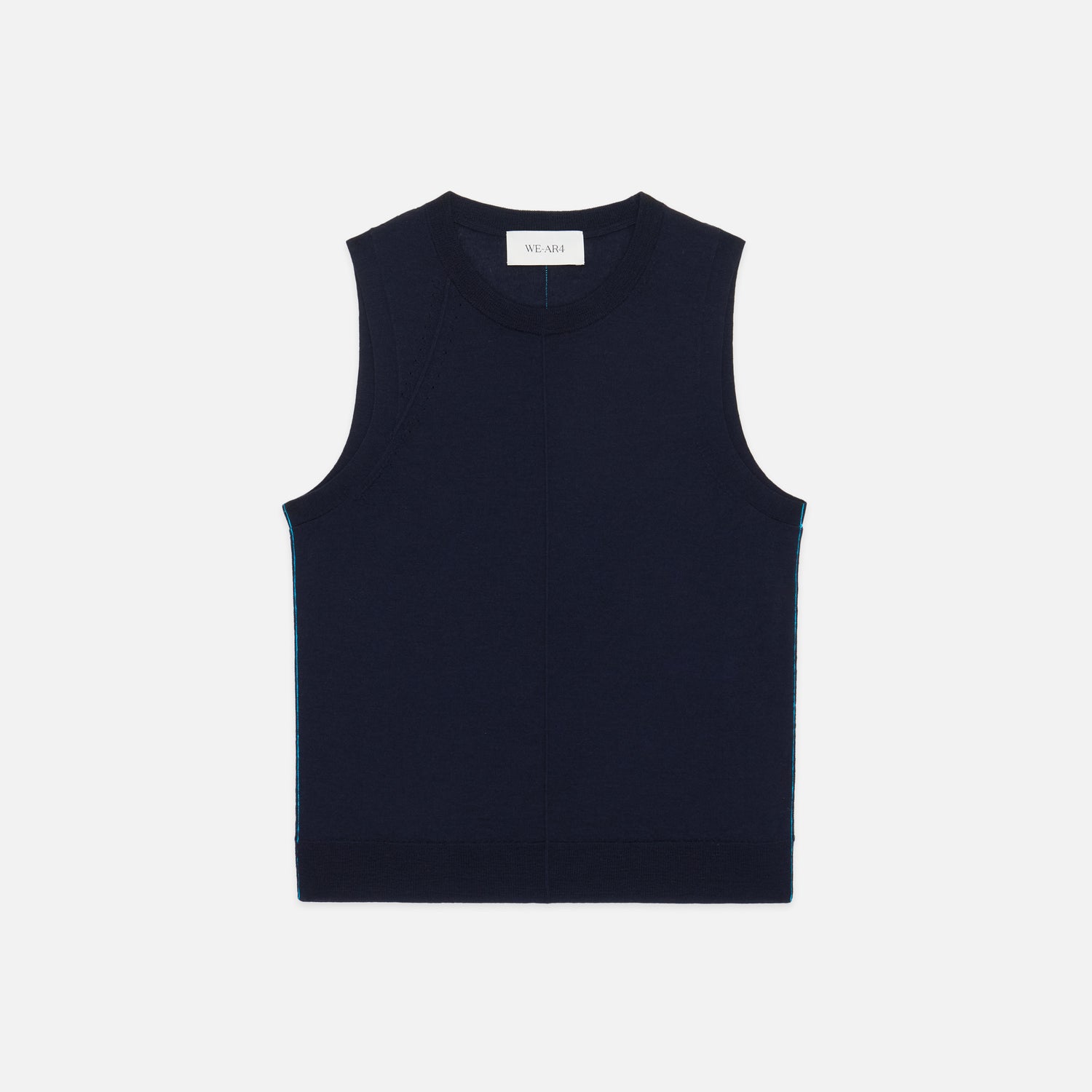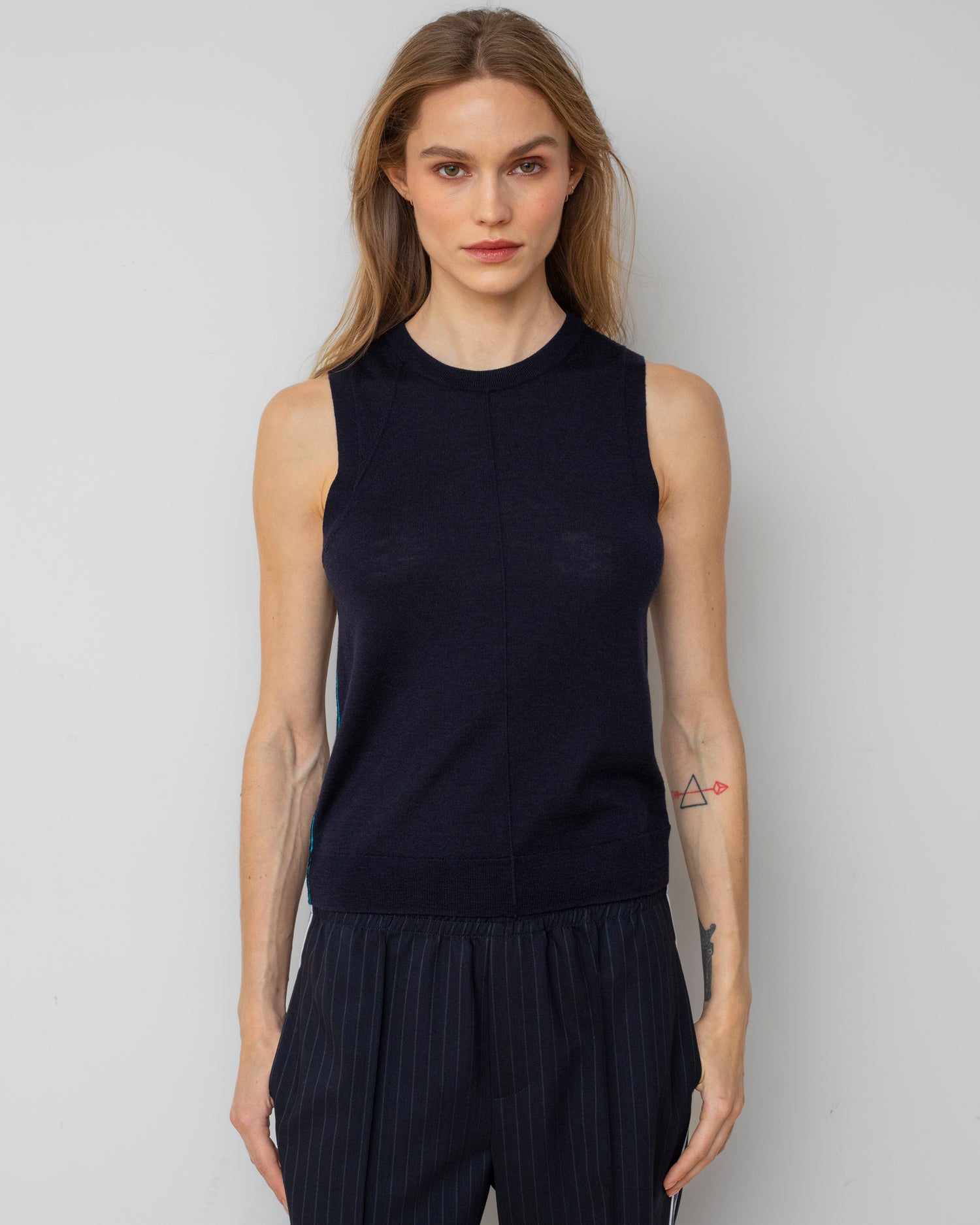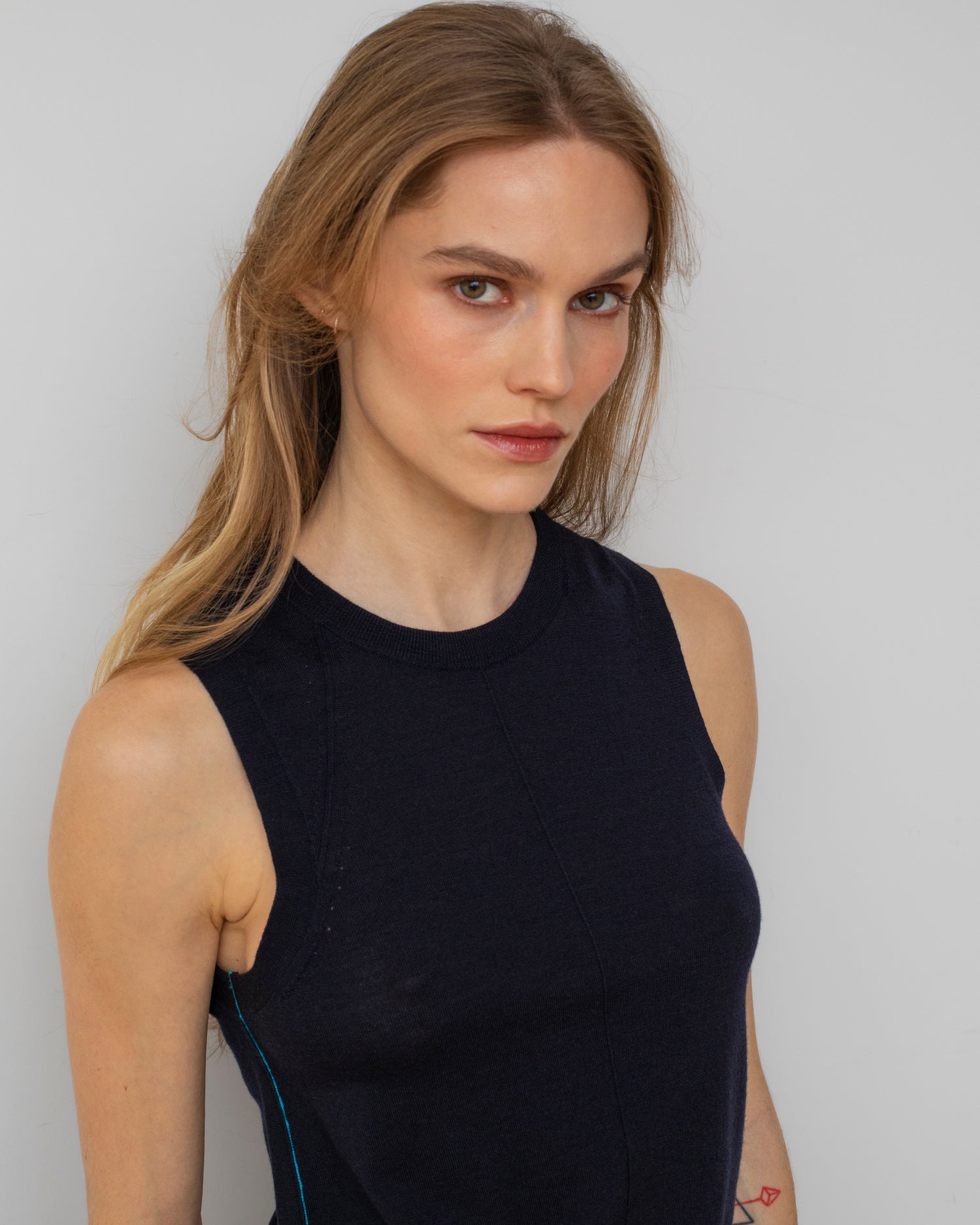The Core Tank provides a sleek, sleeveless silhouette that functions as the perfect staple for any contemporary wardrobe. Knit in a soft, merino wool it features a clean crew neck and graphic topstitching along the back and sides. This piece is specifically designed to be paired with the Core Cardigan as a matching knit set, creating a sophisticated, tonal twin-set that feels both classic and unmistakably modern.