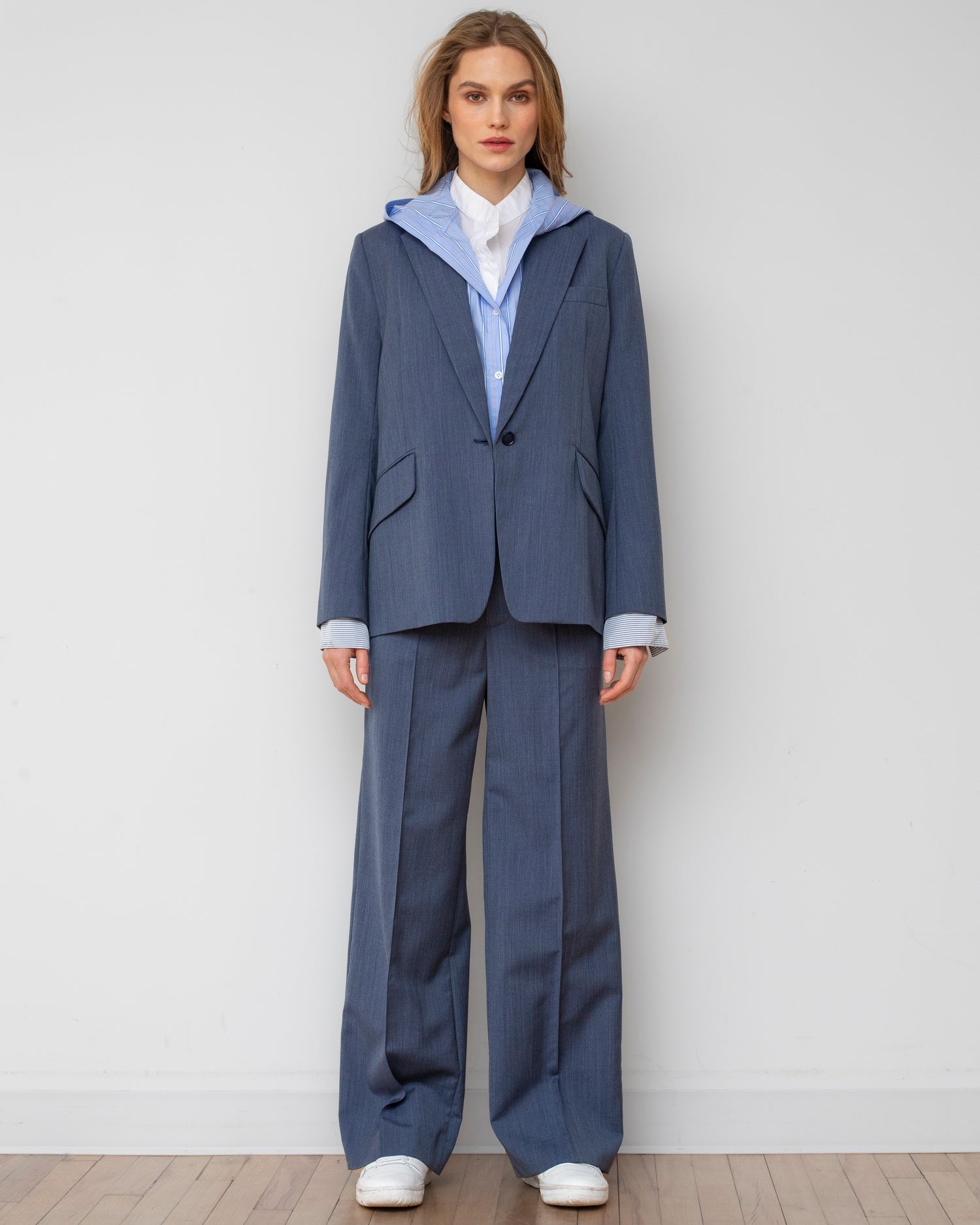 The Venue Blazer is a relaxed, unstructured silhouette crafted with a tomboyish nonchalance. It features built-in styling with a contrasting striped lining that extends through the inside sleeve to create a sharp, graphic layer. Designed with a classic notched lapel and a minimalist one-button closure, this piece is an effortless staple built for the rhythm of the city.