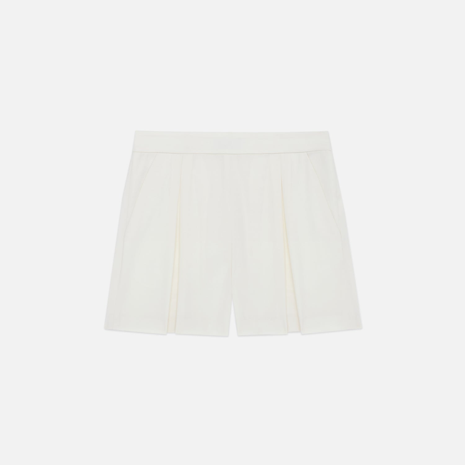 The Ivy Short offers an elegant reimagining of springtime tailoring with a focus on fluid movement. By utilizing a discreet side zipper opening, the design maintains a perfectly clean front finish that highlights the sharp dual knife pleats. These deep pleats provide a graceful drape and intentional volume that feels like a skirt.
