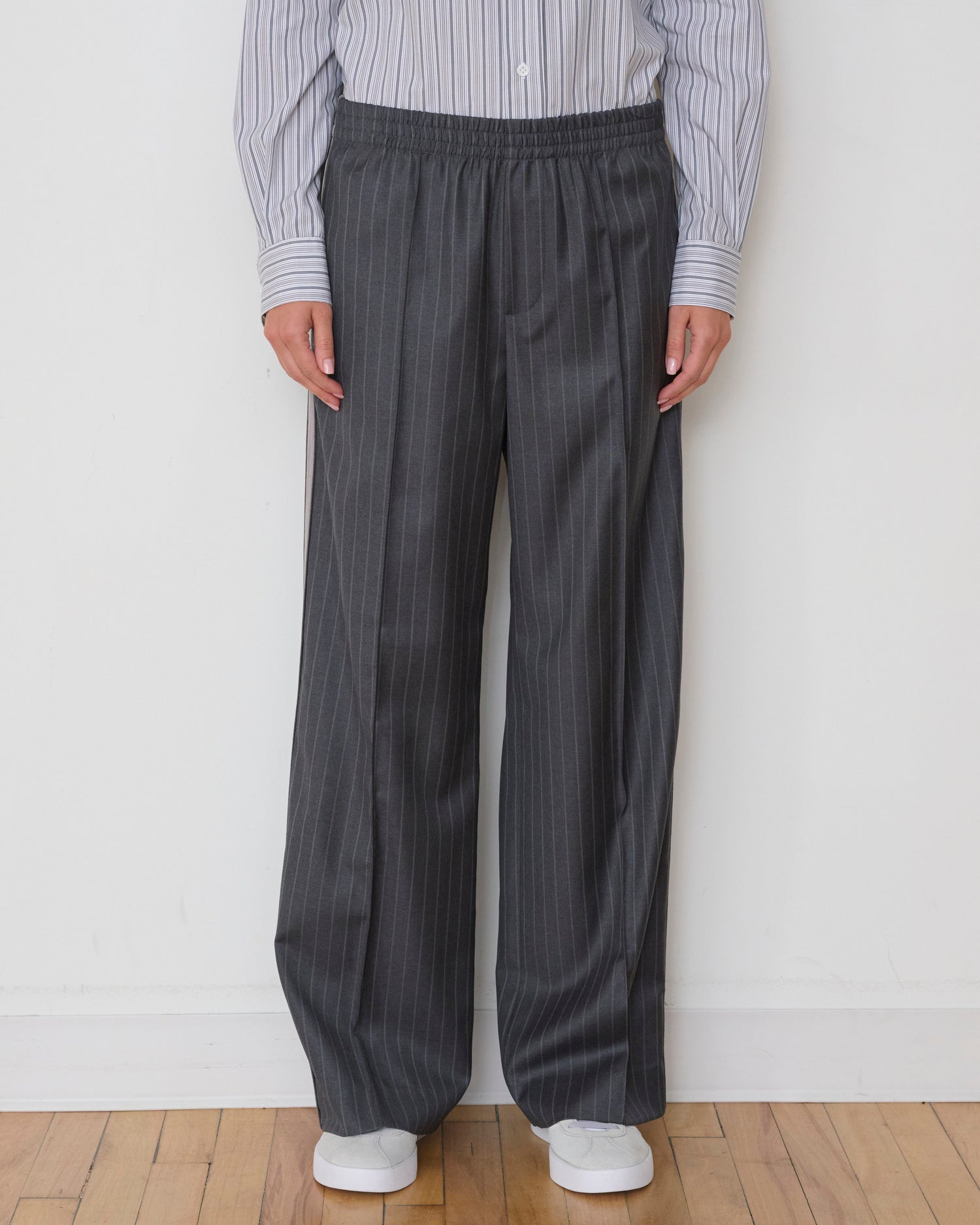 The Chaplin Trouser redefines casual comfort with a sophisticated, tomboy edge. Inspired by the relaxed spirit of a track pant, this key piece seamlessly blends minimalist ease with refined tailoring, defined by a center front pintuck detail, an elastic waistband, and a contrast cotton ribbon running down the outer leg.