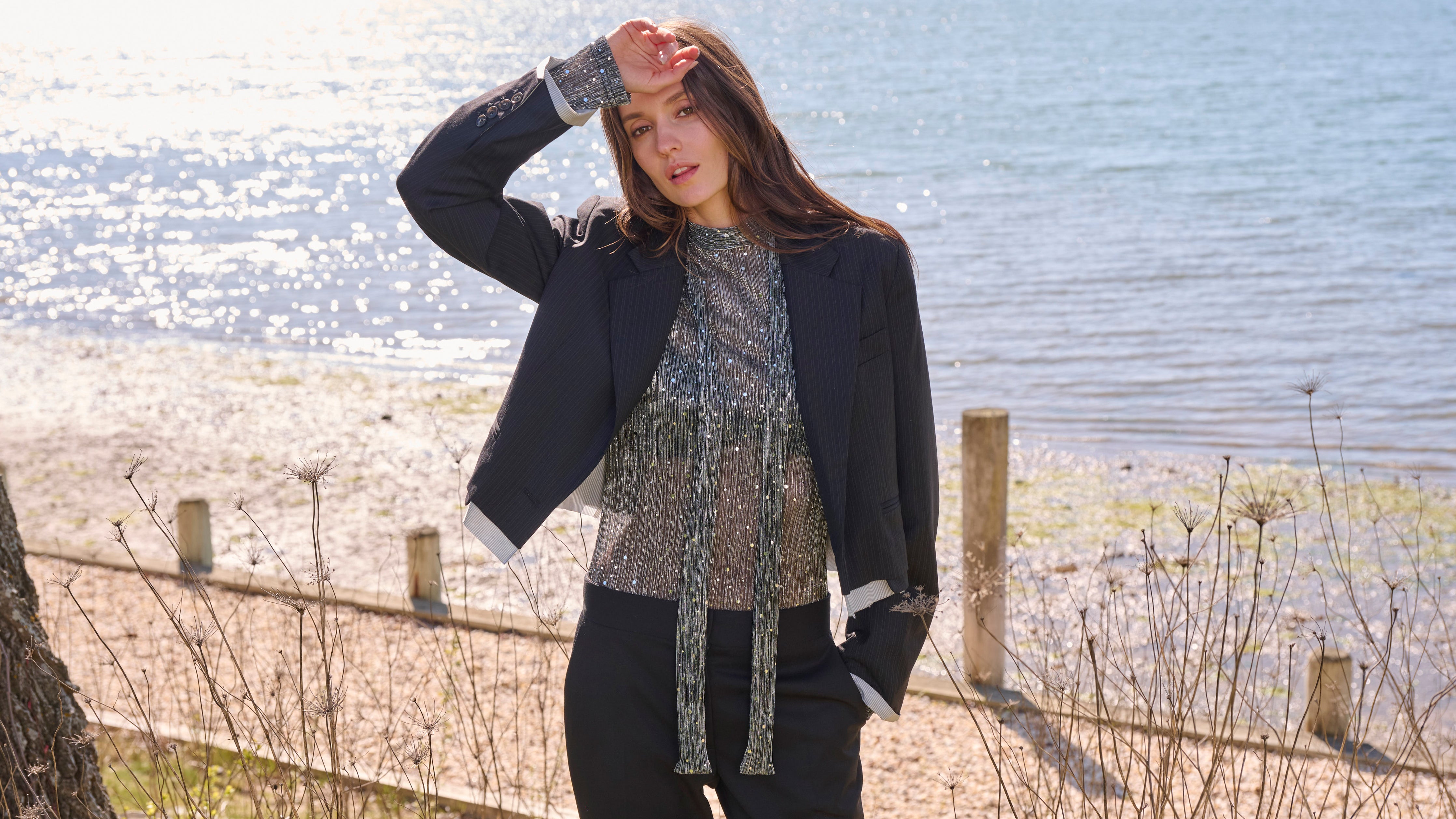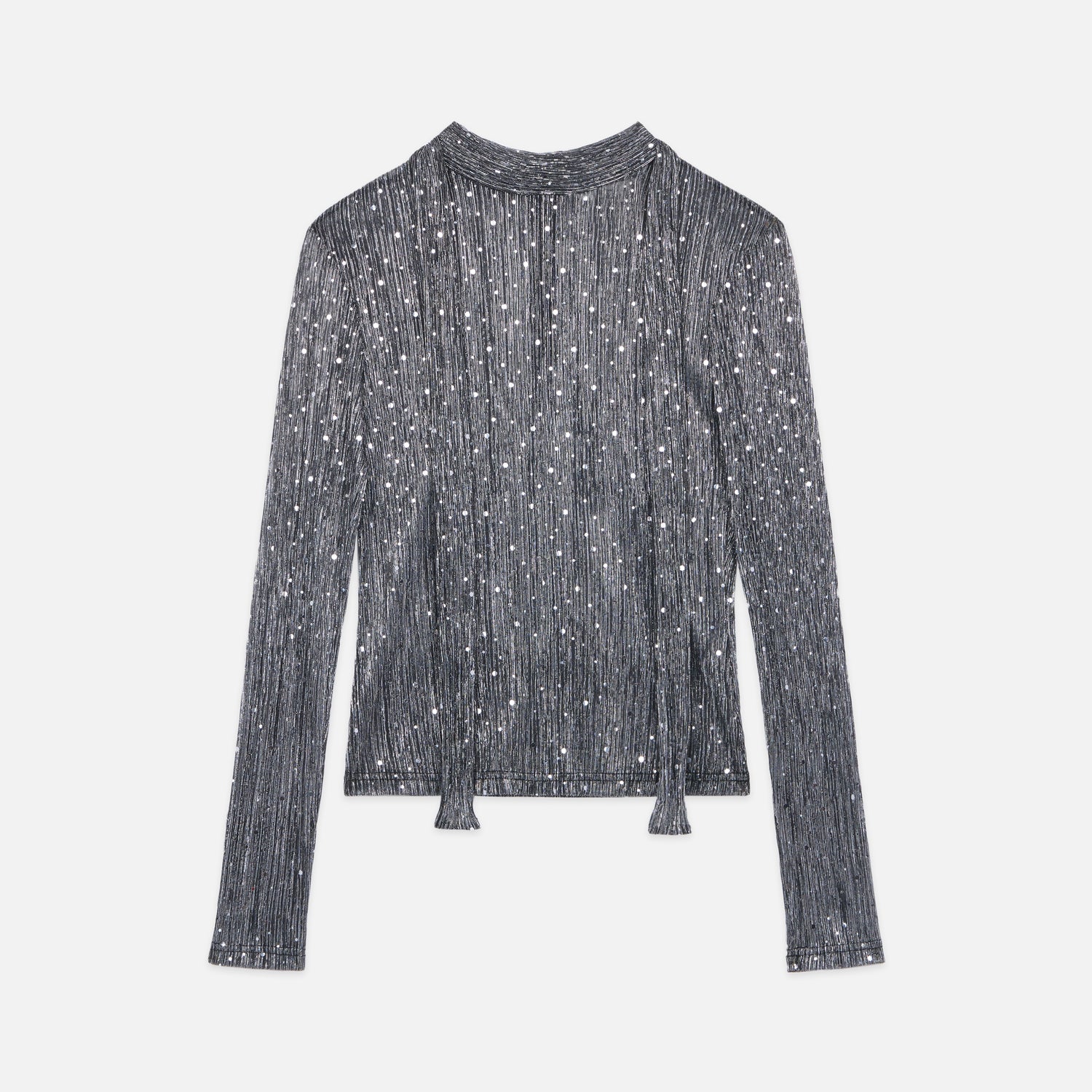 A modern rebellion in light. The Disco Top is a sleek statement piece that reinterprets classic sparkle with a modern edge. Its shimmering fabric catches the light with every move, ensuring you command attention without saying a word. Its high-neck silhouette and fluid tie details offer a versatile elegance, allowing you to style it with a feminine bow or a nonchalant knot. It is a piece that blurs the lines between bold glamour and minimalist sophistication.