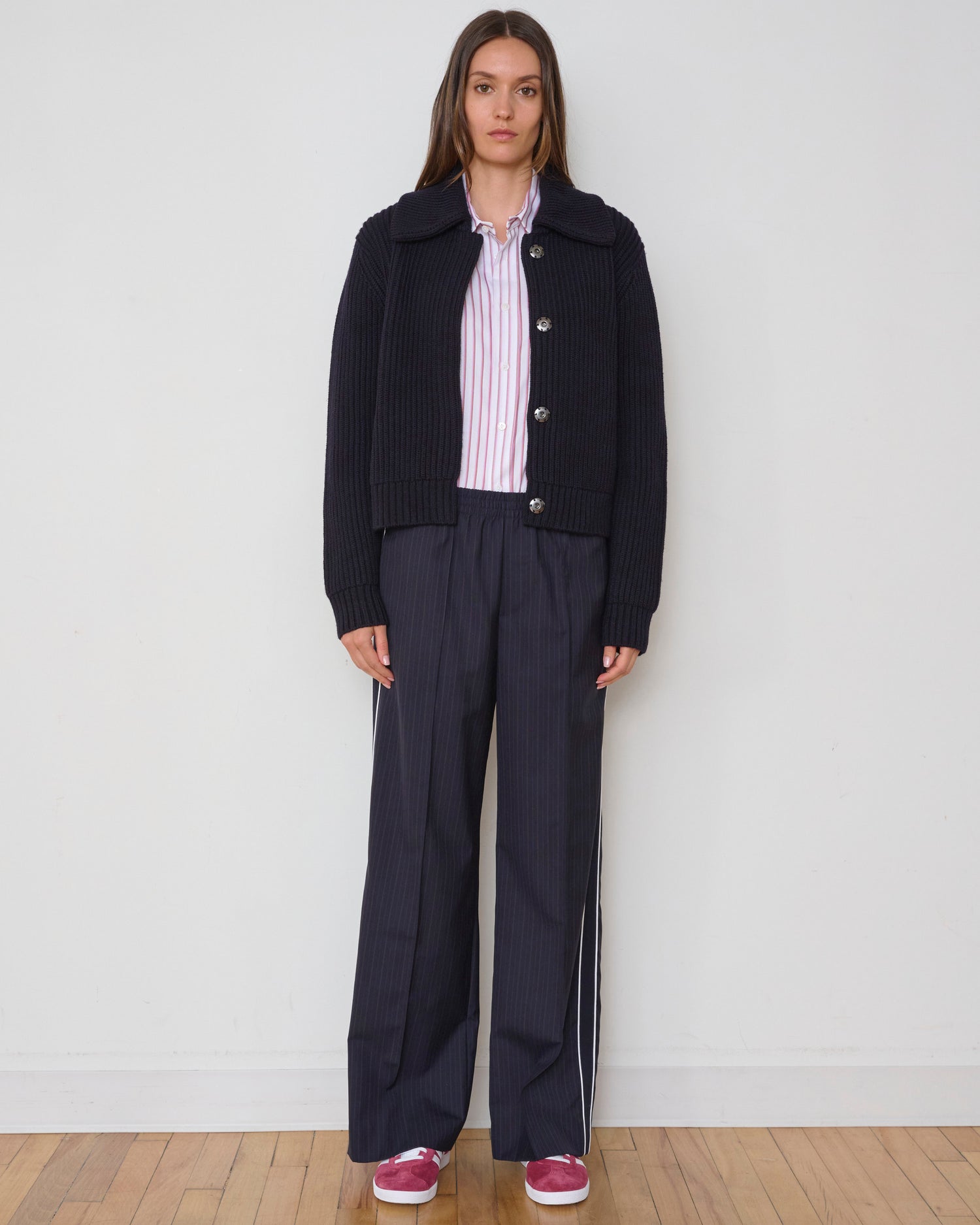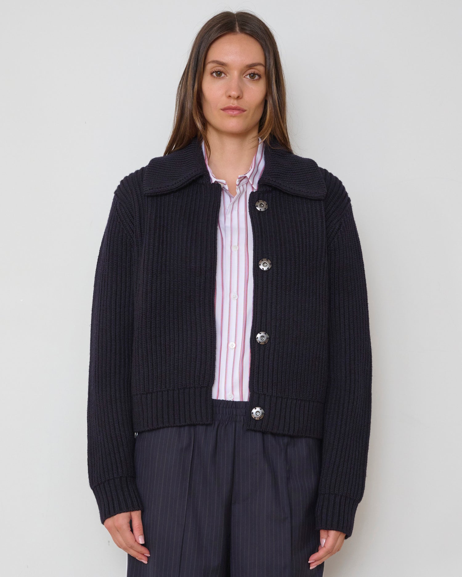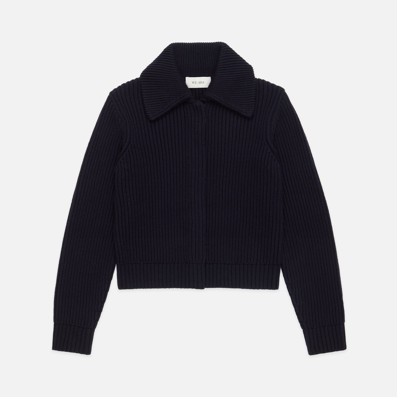 A sophisticated reinterpretation of a timeless essential, the Gatsby Cardigan blends a confident, contemporary silhouette with the comfort of a classic knit. Crafted from a plush, ribbed merino wool, this piece is defined by its modern cropped length and a distinctive wide, flat collar. A detail of hand-sewn snap closure provides a clean, seamless front, creating a polished finish for any look.