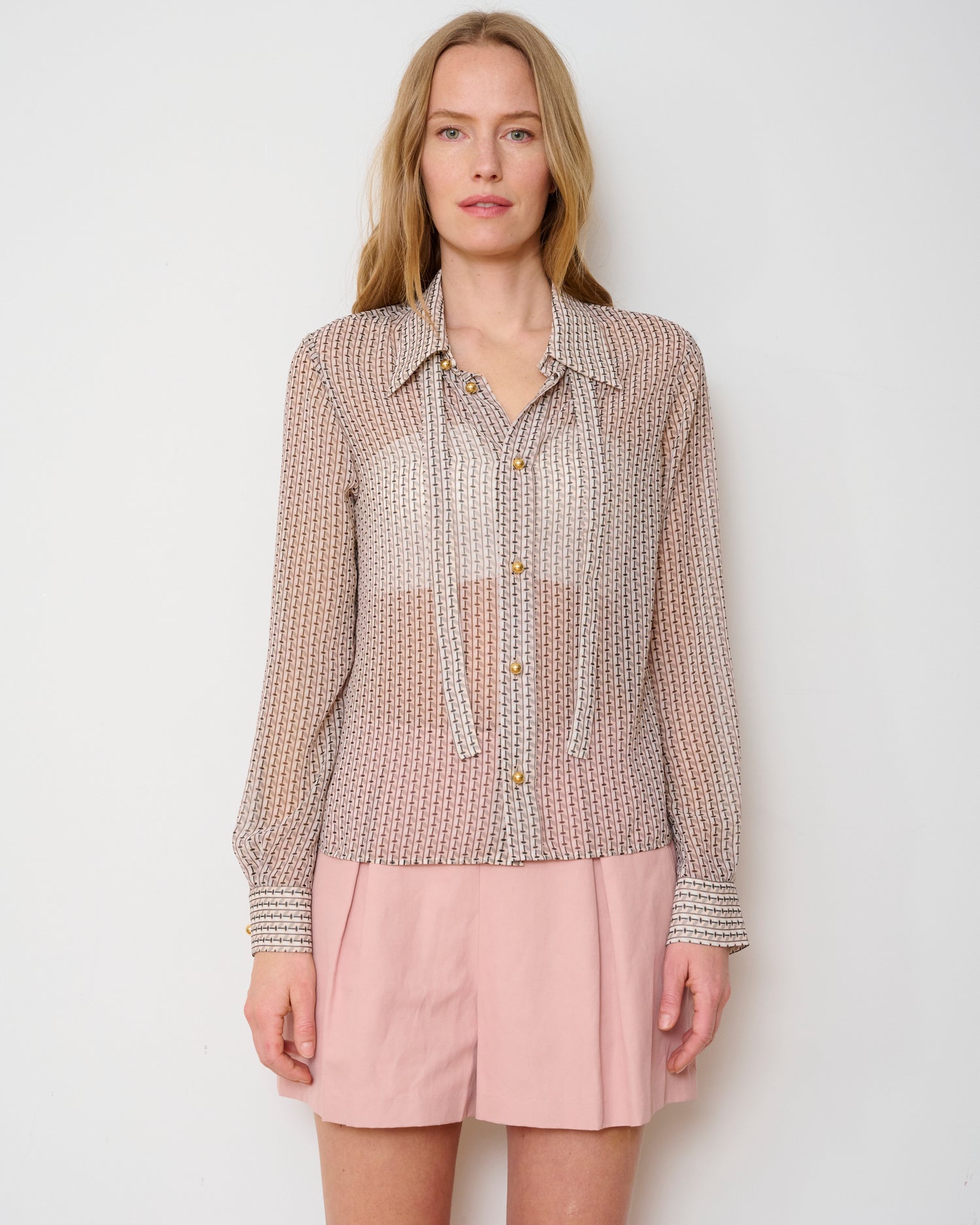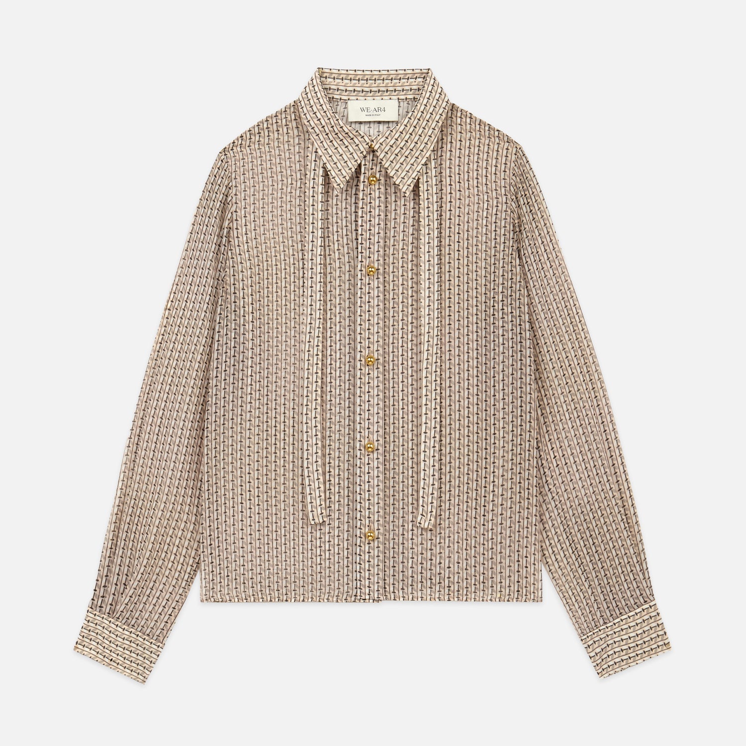 A study of playful femininity. The Academy Blouse II marries a timeless, polished silhouette with the spirit of whimsical prints. Crafted from a soft silk crepe, its graceful drape is accented with delicate detachable tie details and finished with distinct Italian bold buttons. The piece perfectly balances its refined grace with an unexpected, rebellious edge.