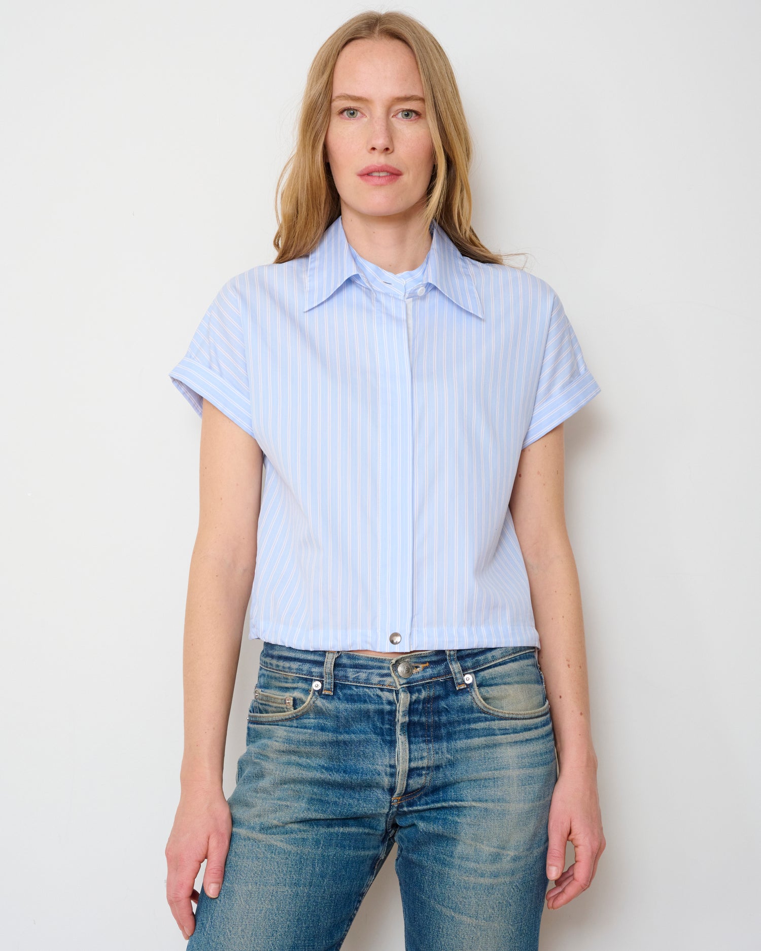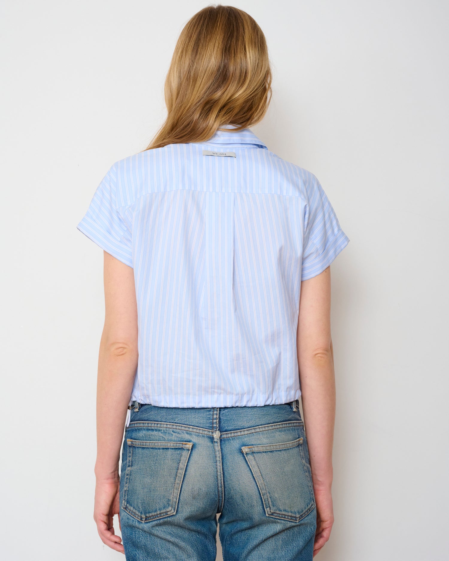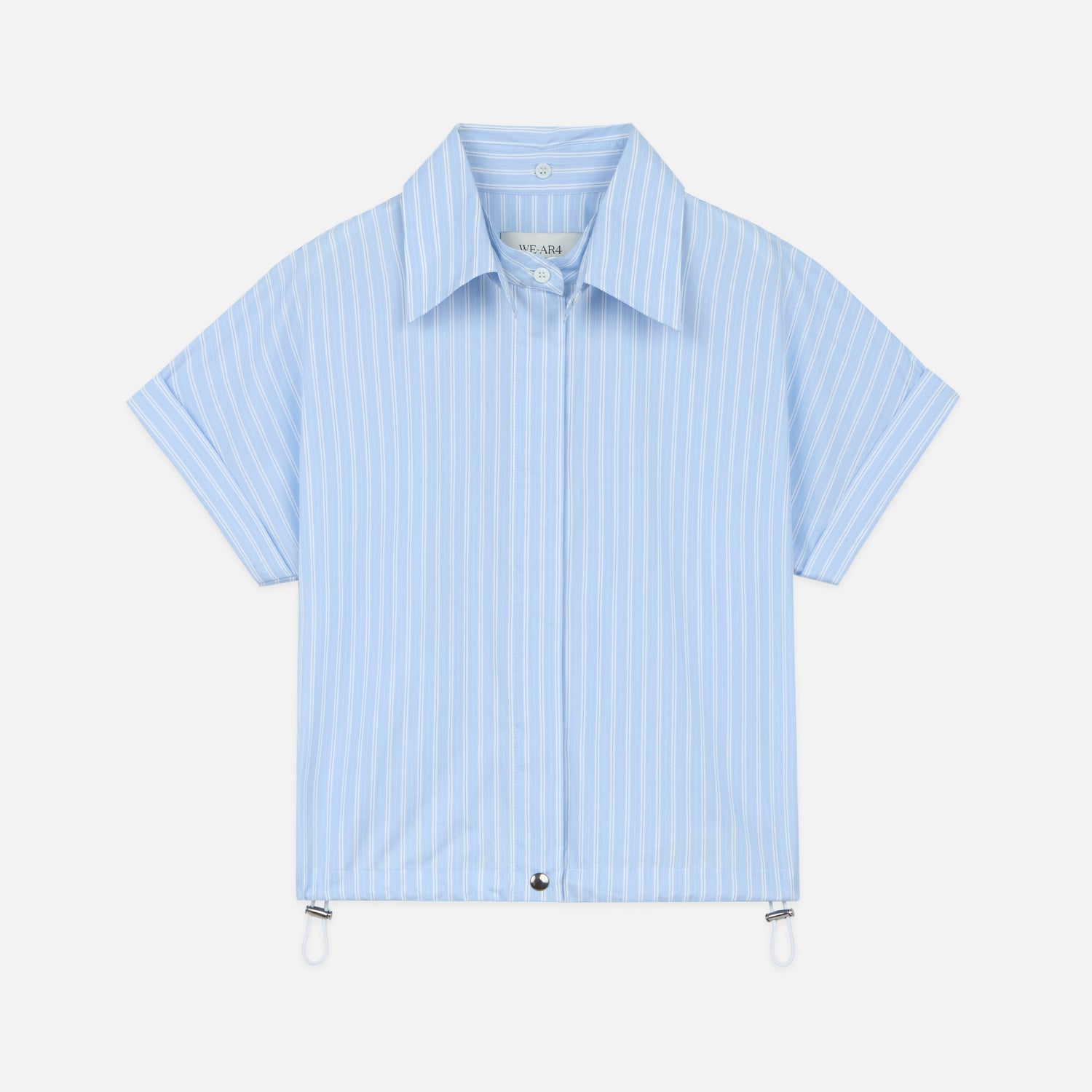 The classic, crisp tailored men’s shirt gets a utilitarian twist with it’s bungee cord bottom and detachable collar. The Bungee Shirt is cropped to create the perfect silhouette with high-waisted pants or a cargo skirt, and with an elastic waist.