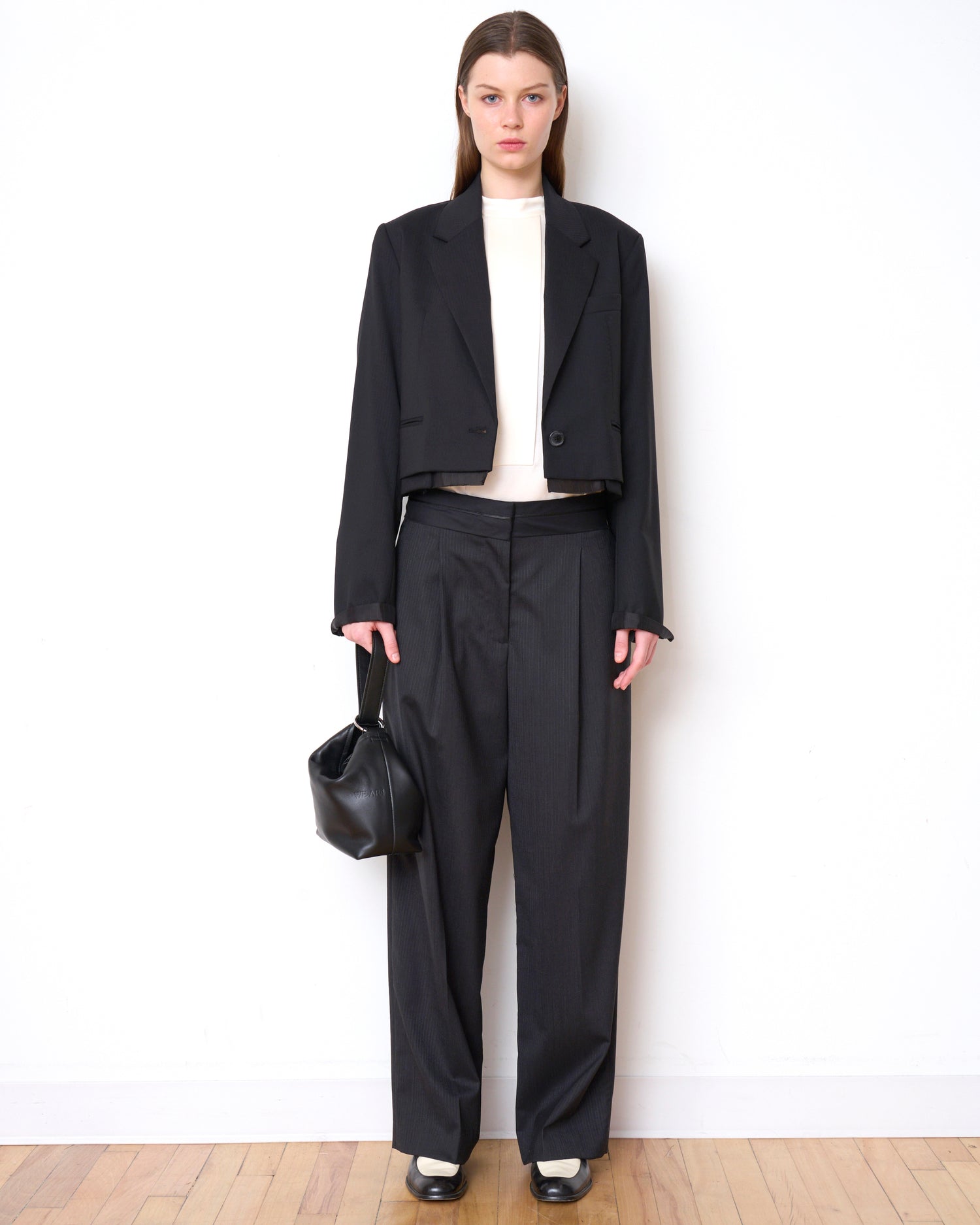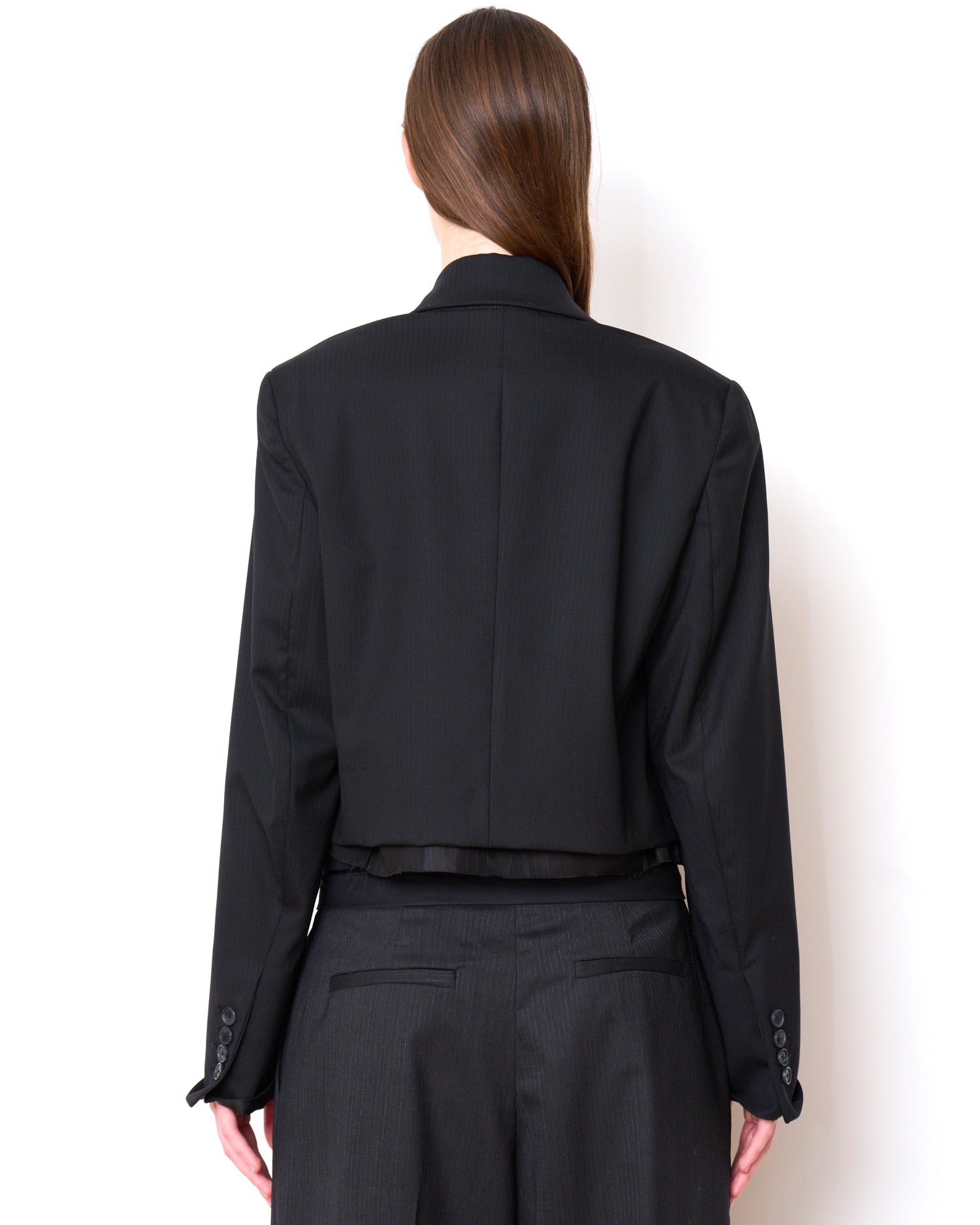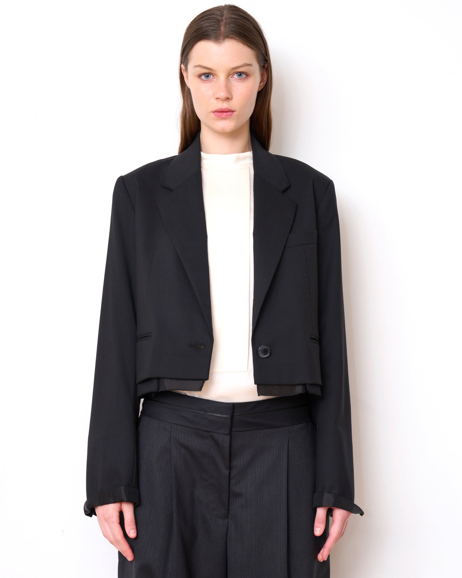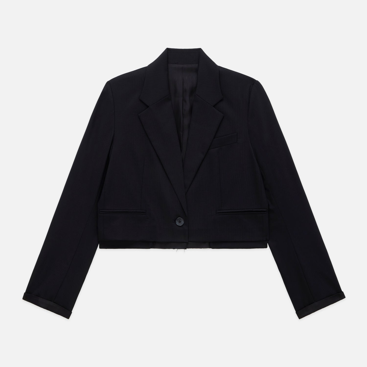 The Cocktail Blazer is a study in refined contrasts. Crafted from luxurious wool, its tailored, cropped fit redefines the classic silhouette with a clean, modern aesthetic. The unexpected touch of raw-edge lining at the hem adds a subtle note of effortless sophistication, making this piece an essential for any curated wardrobe.
