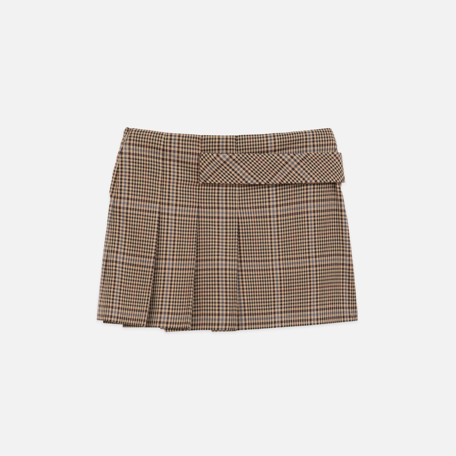 An update on the preppy schoolgirl staple, the Collegiate Skirt has an asymmetrical belted waist and box pleats.