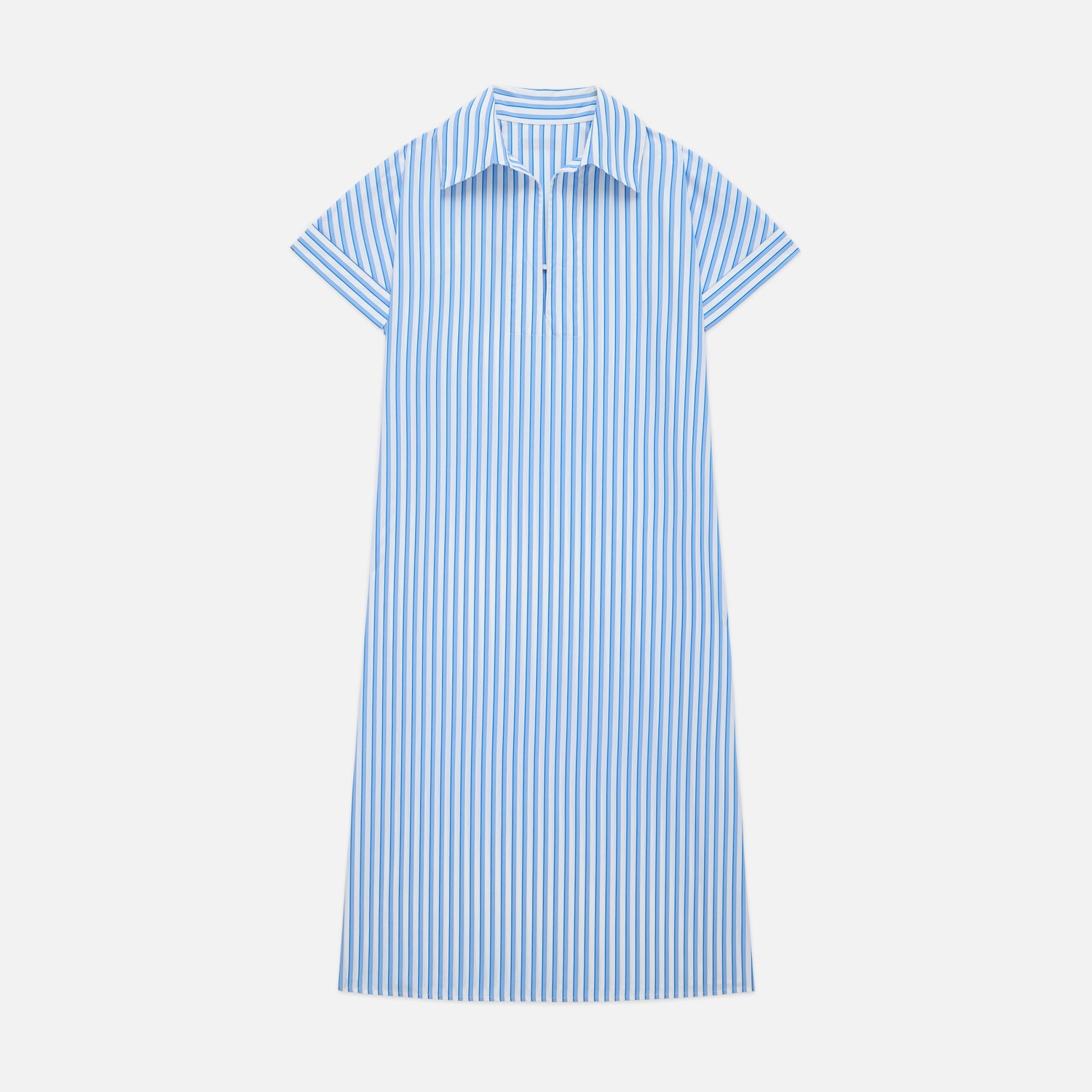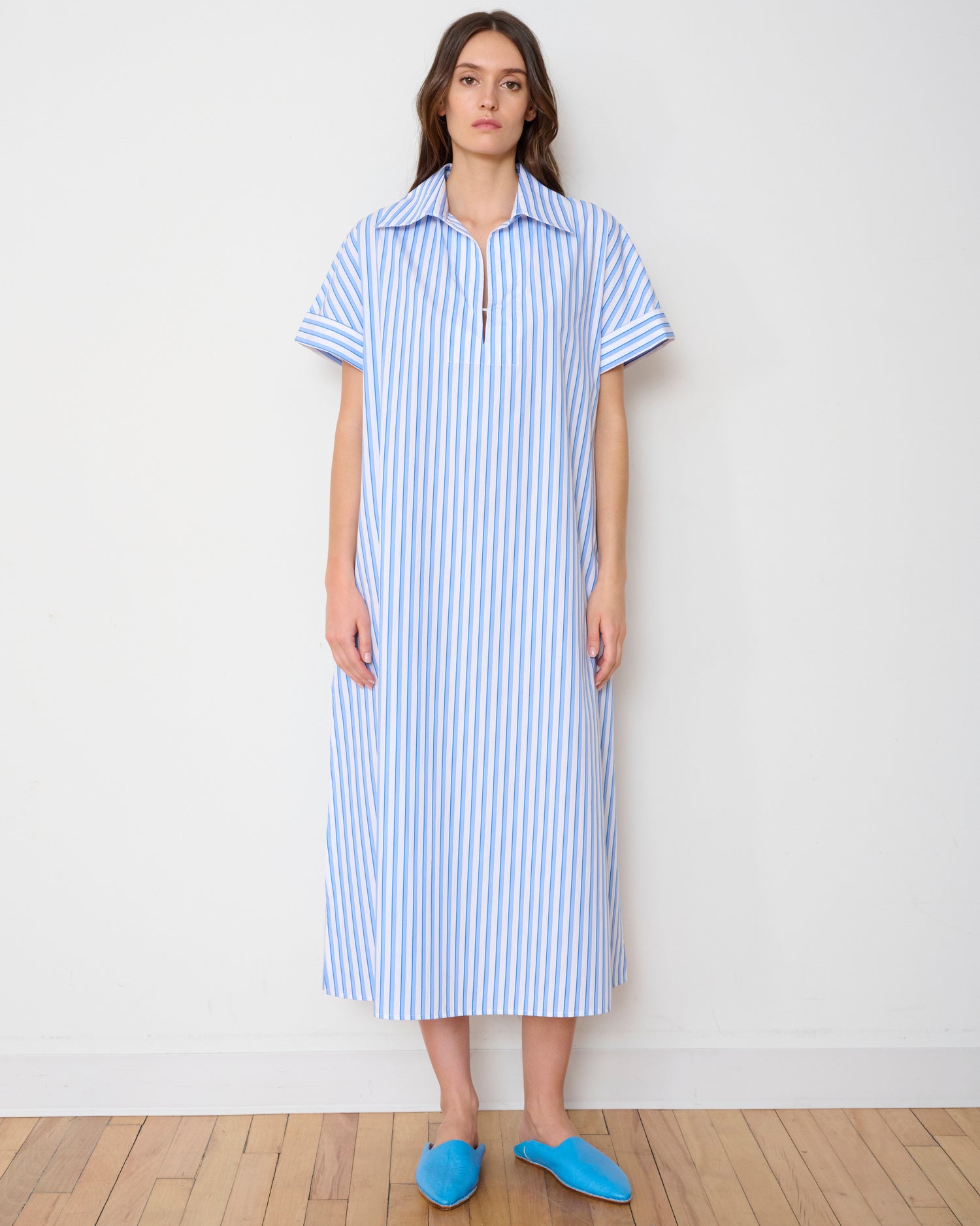 The Darla Dress is a refined hybrid between a utilitarian shirtdress and a caftan. This relaxed silhouette is crafted from striped cotton poplin and coupled with a Deep V neckline, exaggerated collar and airy side vents for those warm summer days.
