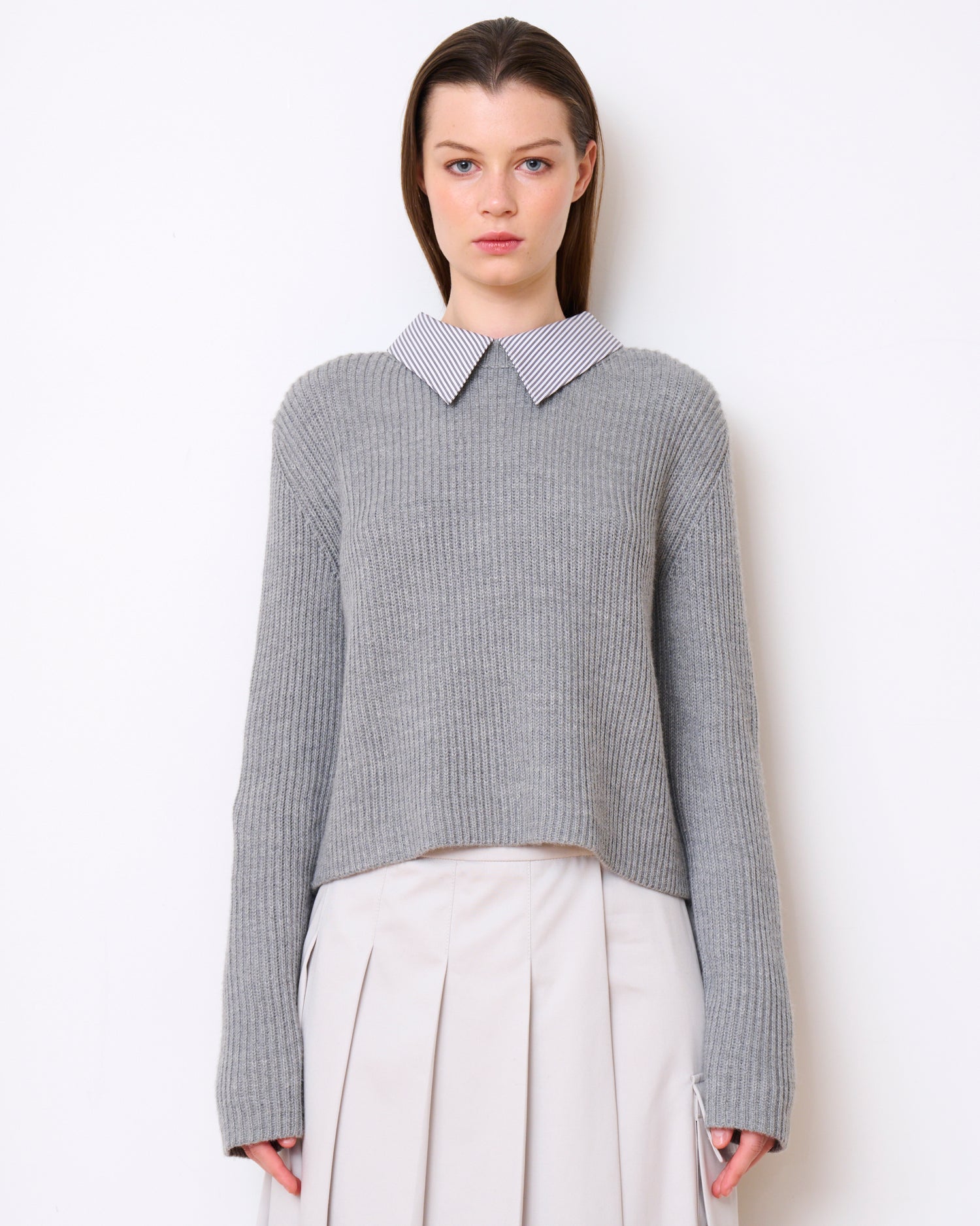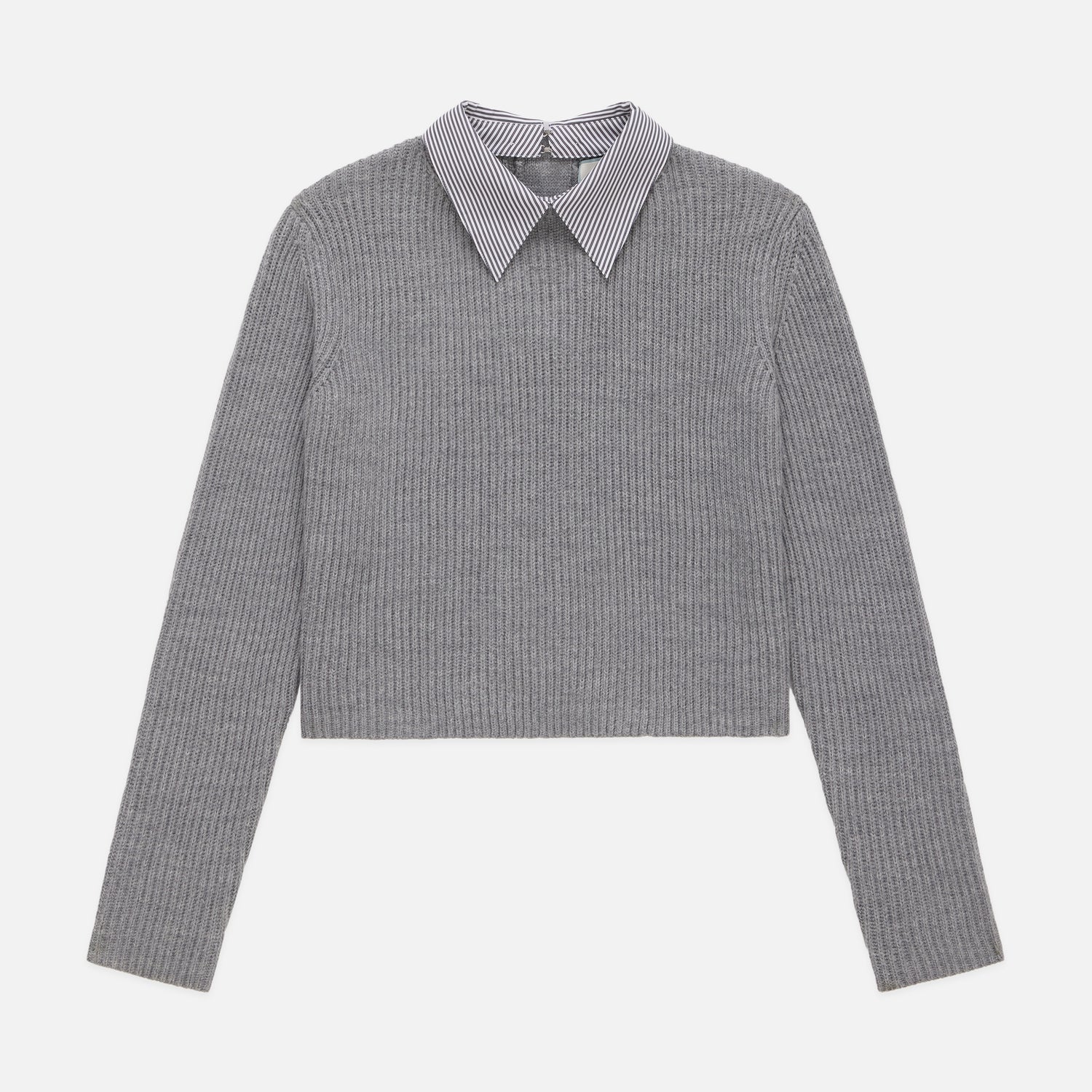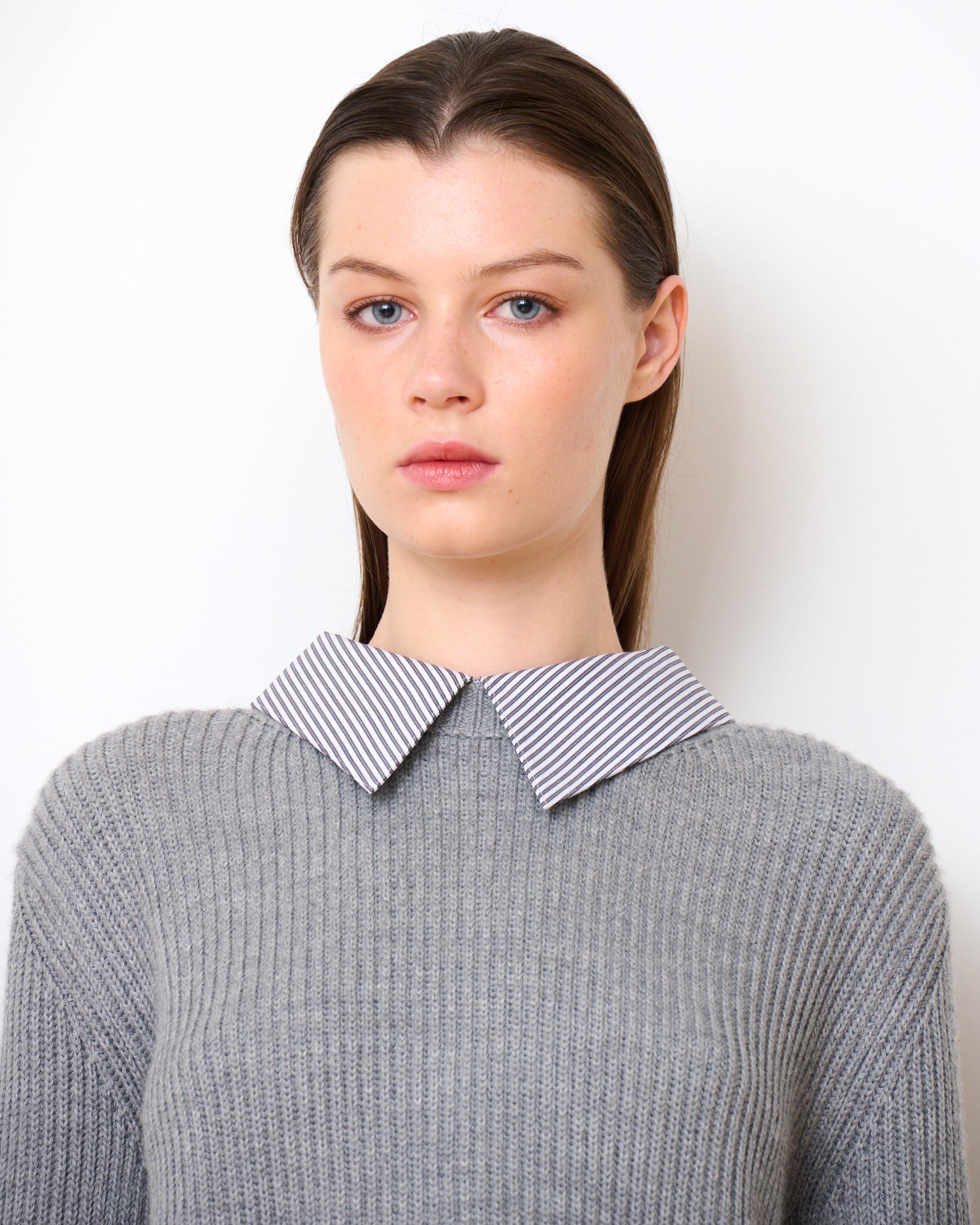 This chunky crewneck is spliced with shirting details and doses of femininity. The Gallery Knit offers an element of modern prep with its contrast detachable poplin collar and exposed button-back closure. An unexpected playfulness and self-expression pull at the edges of this classic silhouette.