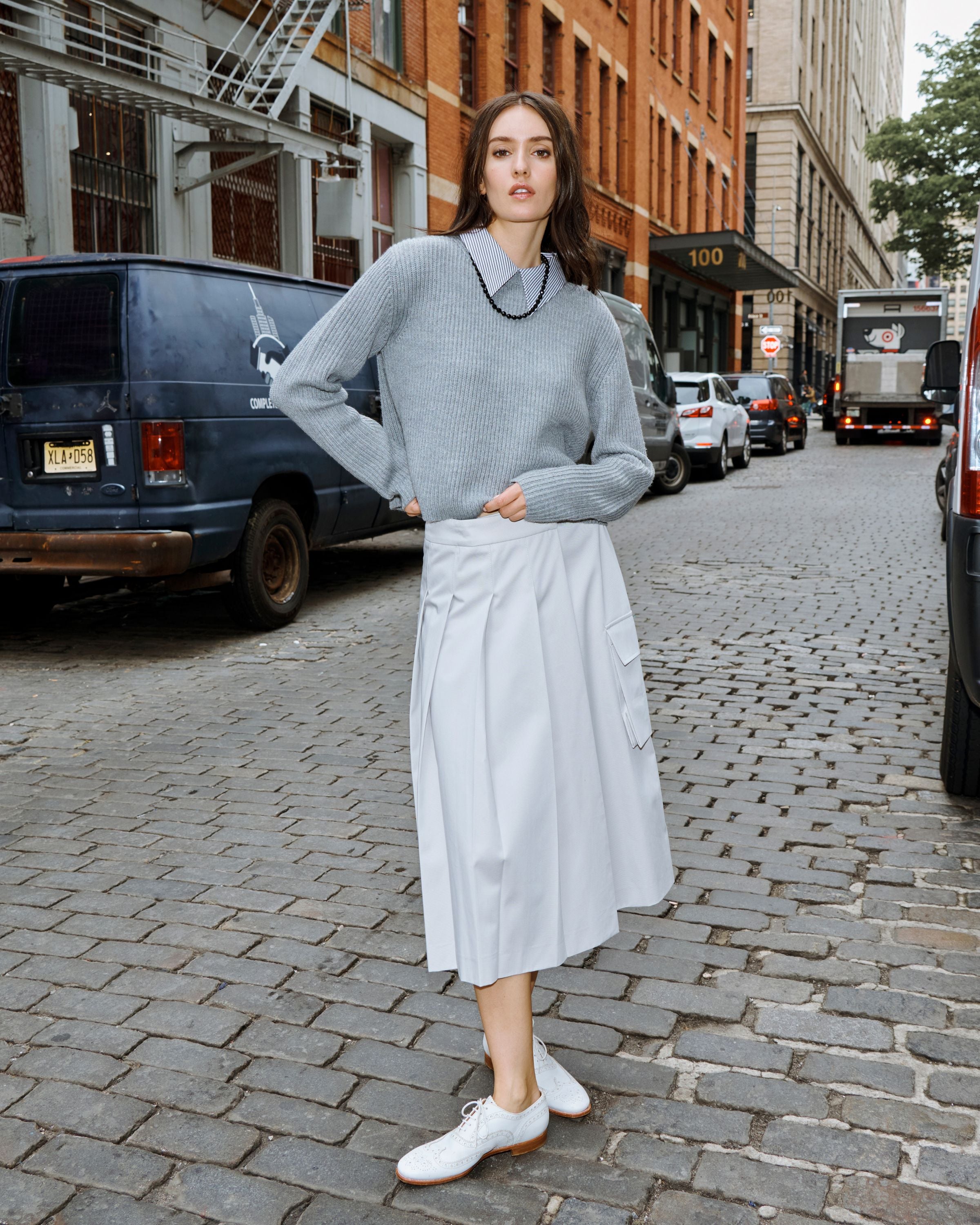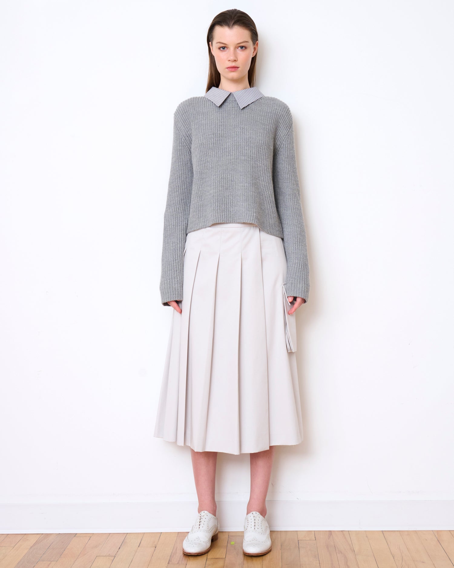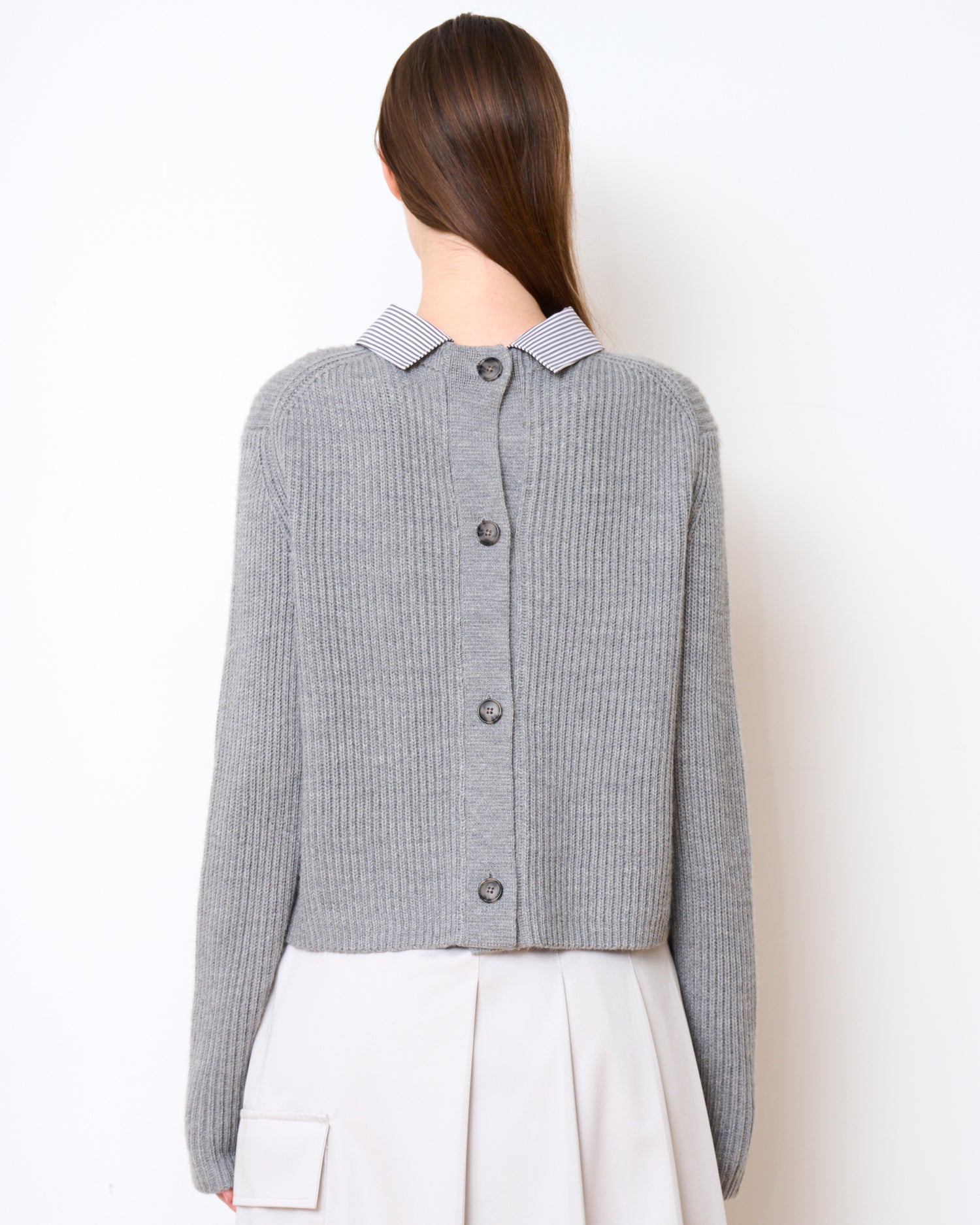 This chunky crewneck is spliced with shirting details and doses of femininity. The Gallery Knit offers an element of modern prep with its contrast detachable poplin collar and exposed button-back closure. An unexpected playfulness and self-expression pull at the edges of this classic silhouette.