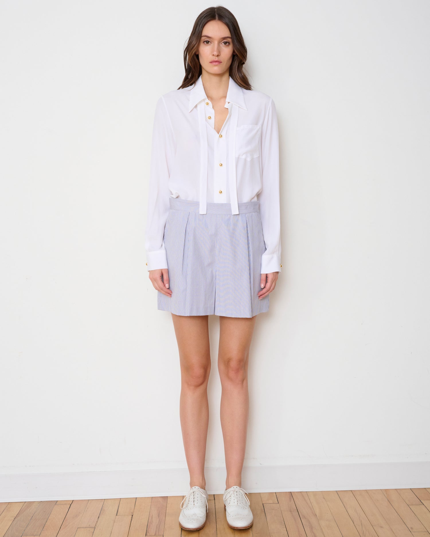 The Ivy Short is a refined hybrid between a tailored short and a flowy skirt. This relaxed silhouette is crafted from soft drapey fabrics and coupled with inverted front pleats for a touch of juxtaposing polish.