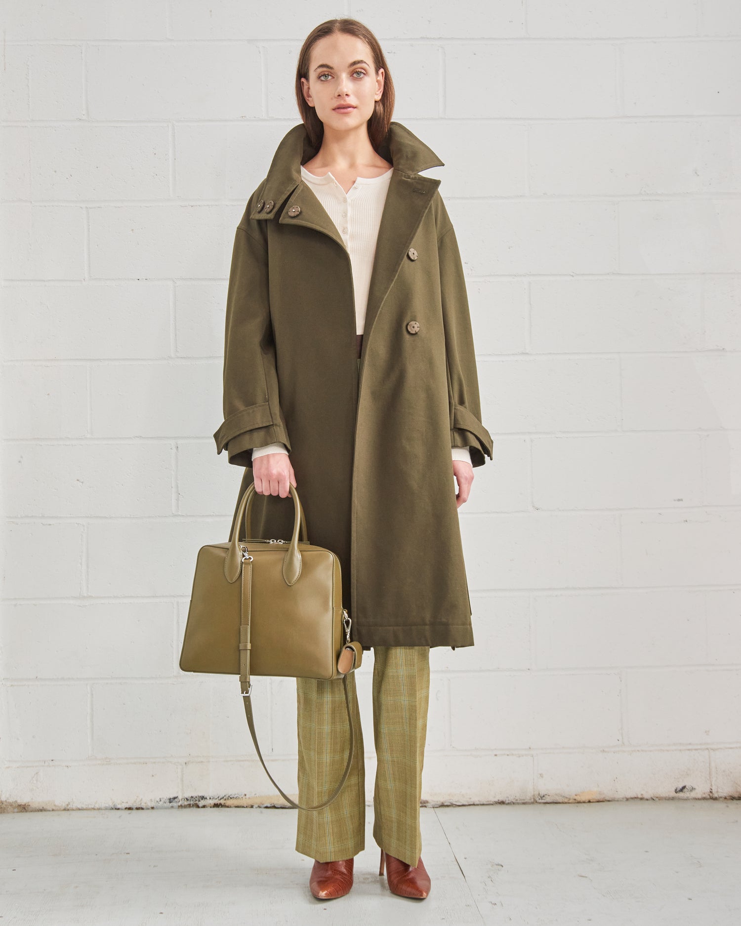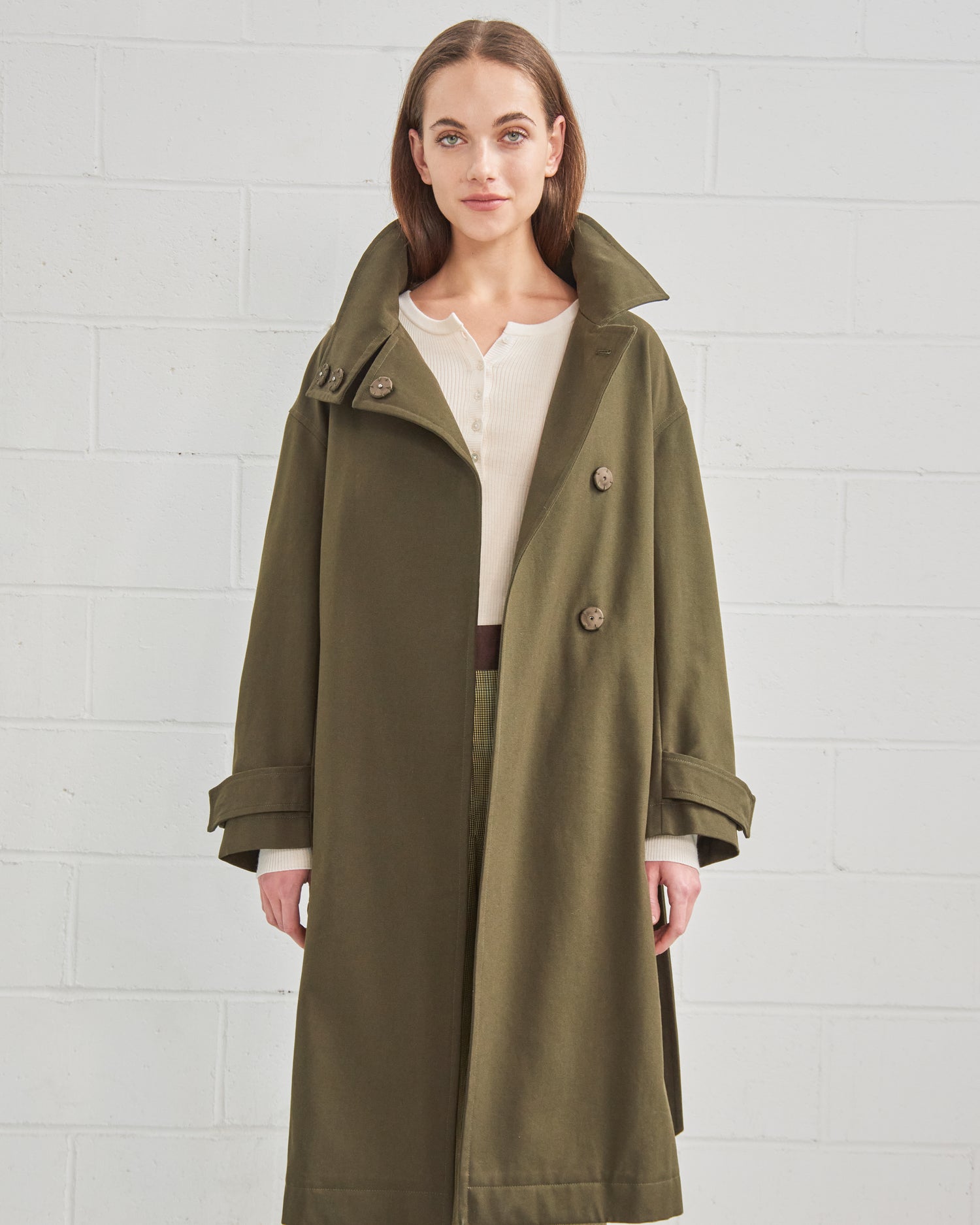 The Jane Trench packs a lot of attitude in one piece. Its oversized men’s wear-inspired silhouette adds subtle drama to daywear. Stacked with details, such as utilitarian self-belt, a standup snap collar and belted cuffs, the Jane Trench can be worn with jeans, tailoring or a feminine dress for a sophisticated contrast.