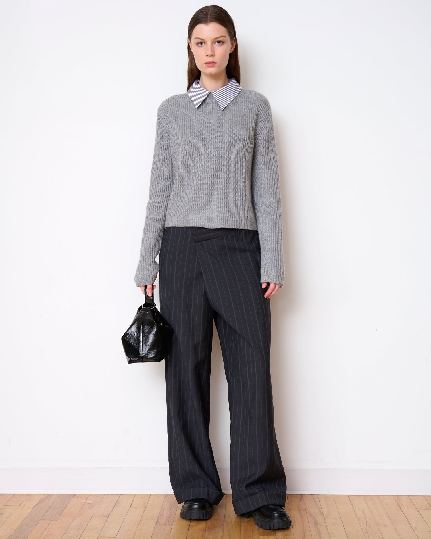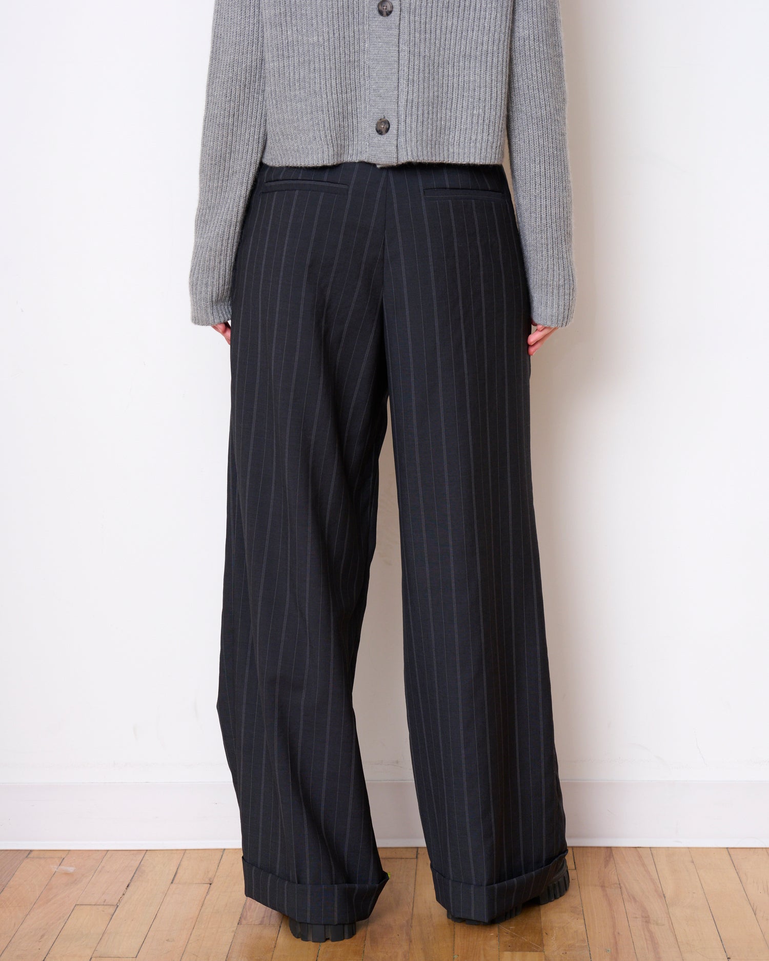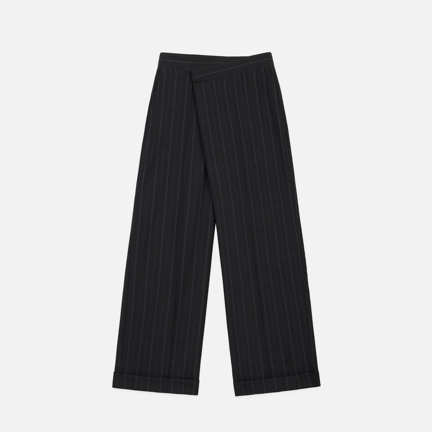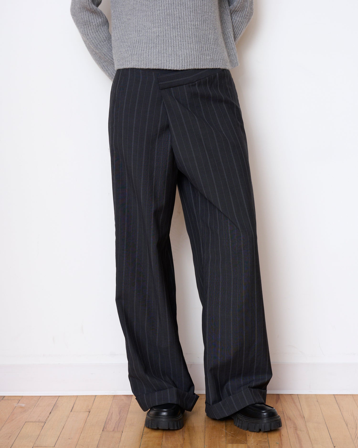 The Lounge Trouser is the low-rise icon of laid-back urbanity. Crafted in beautiful wool, this pant defines relaxed utility with its asymmetric crossover front and wide leg drape.