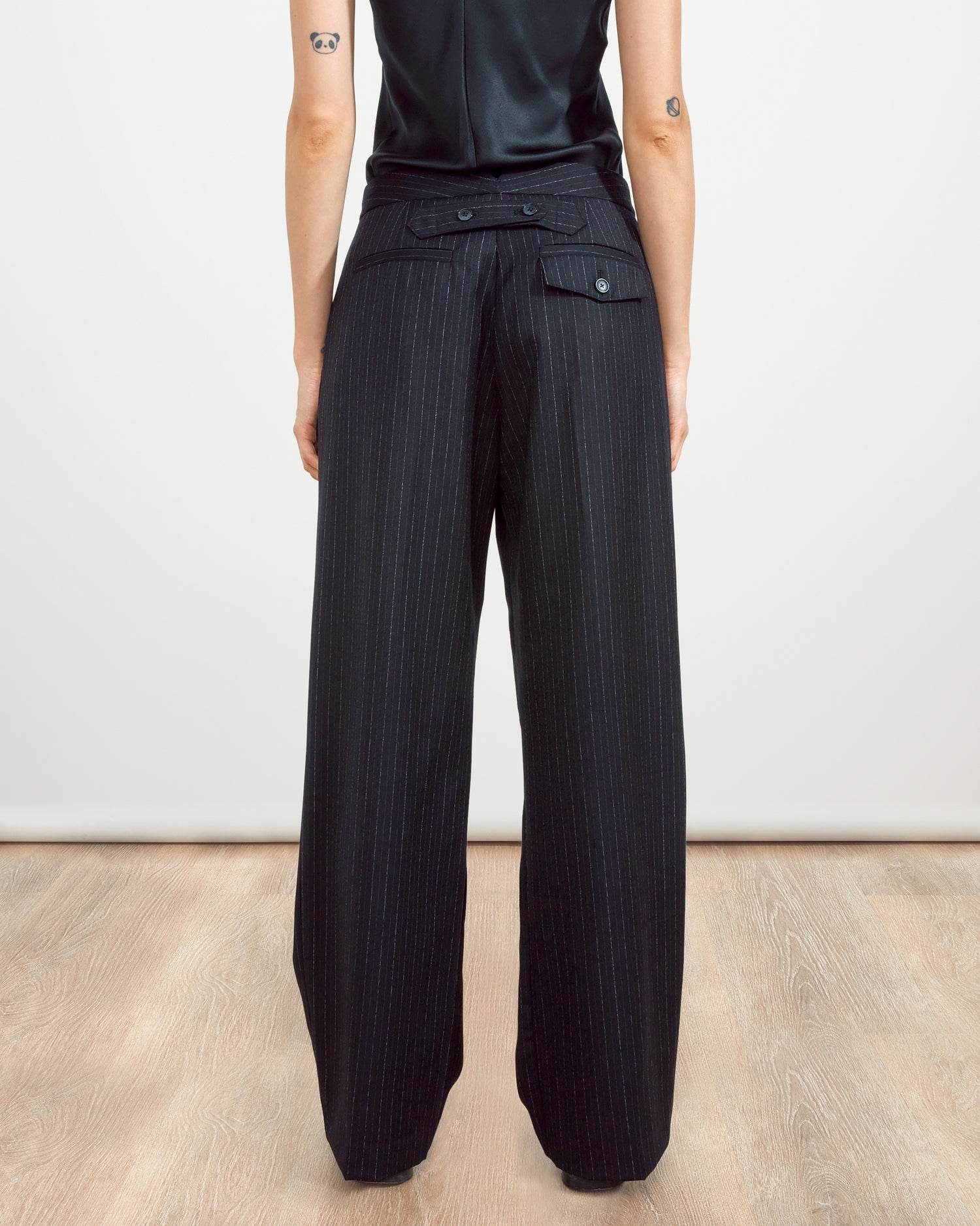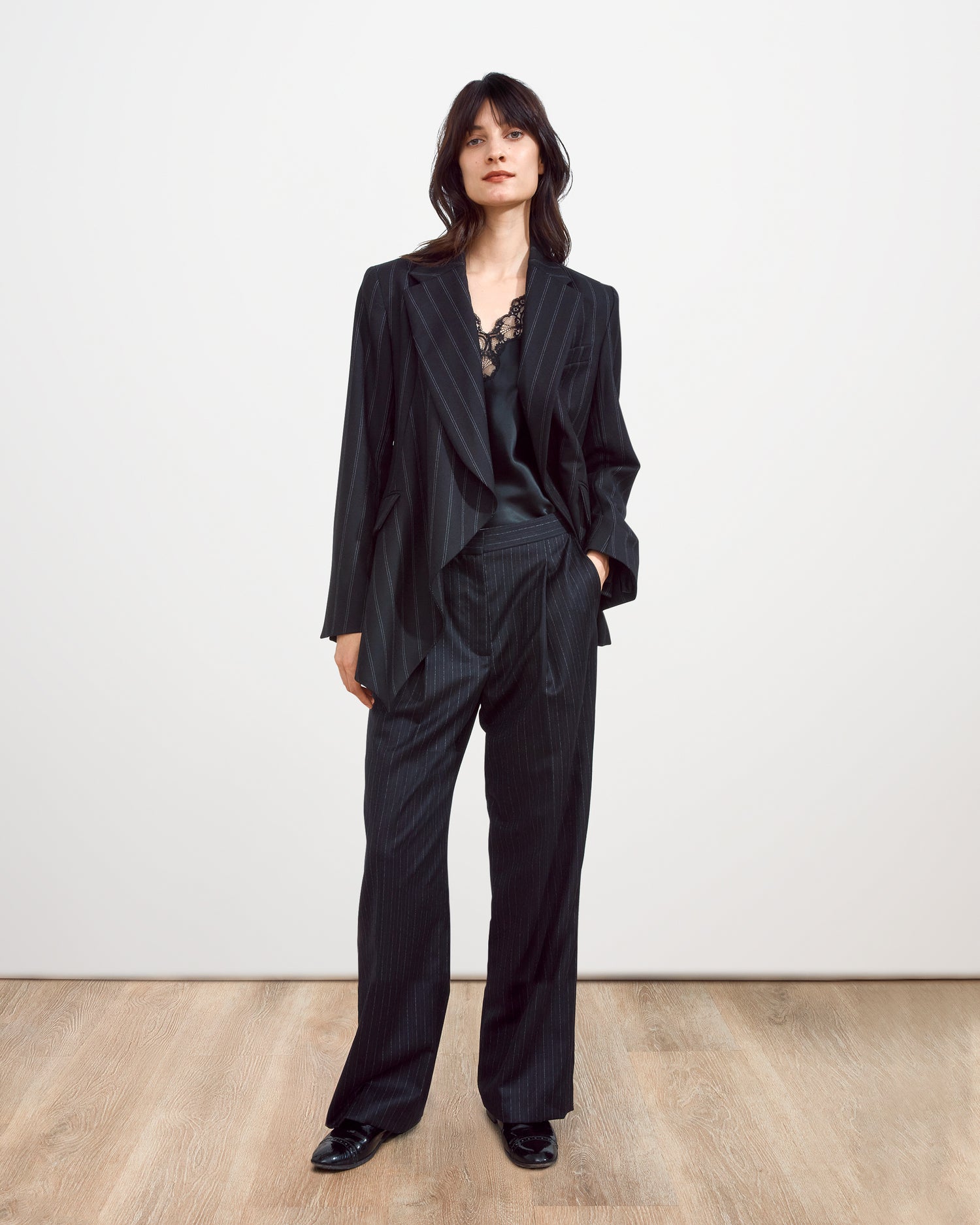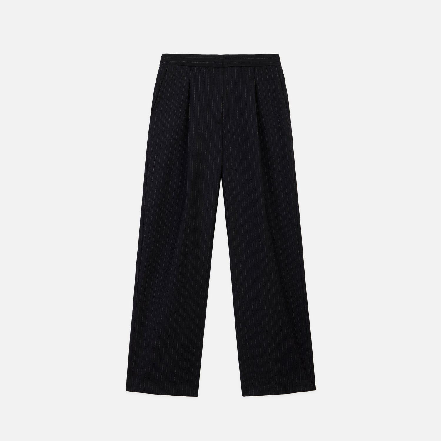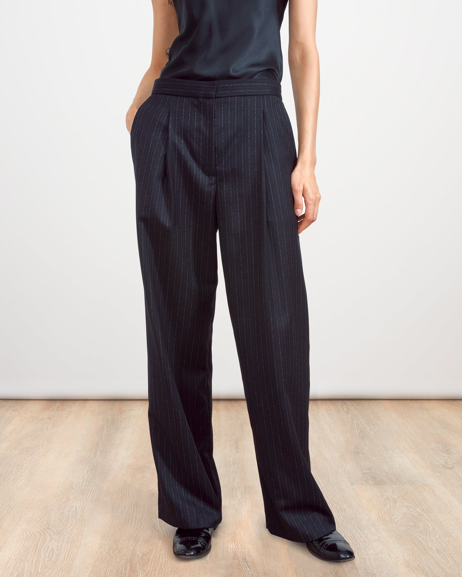 The menswear-inspired, Mercer Trouser, is crafted in luxurious wools with relaxed clean lines. This wide leg silhouette and V cutout waistband are complemented with feminine pleating.