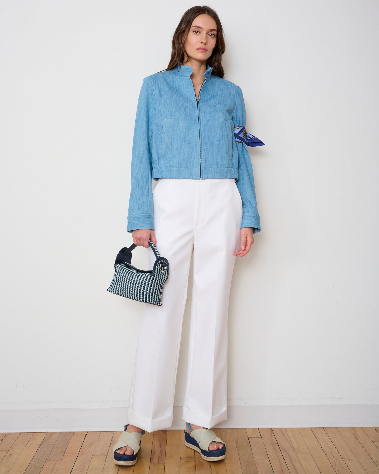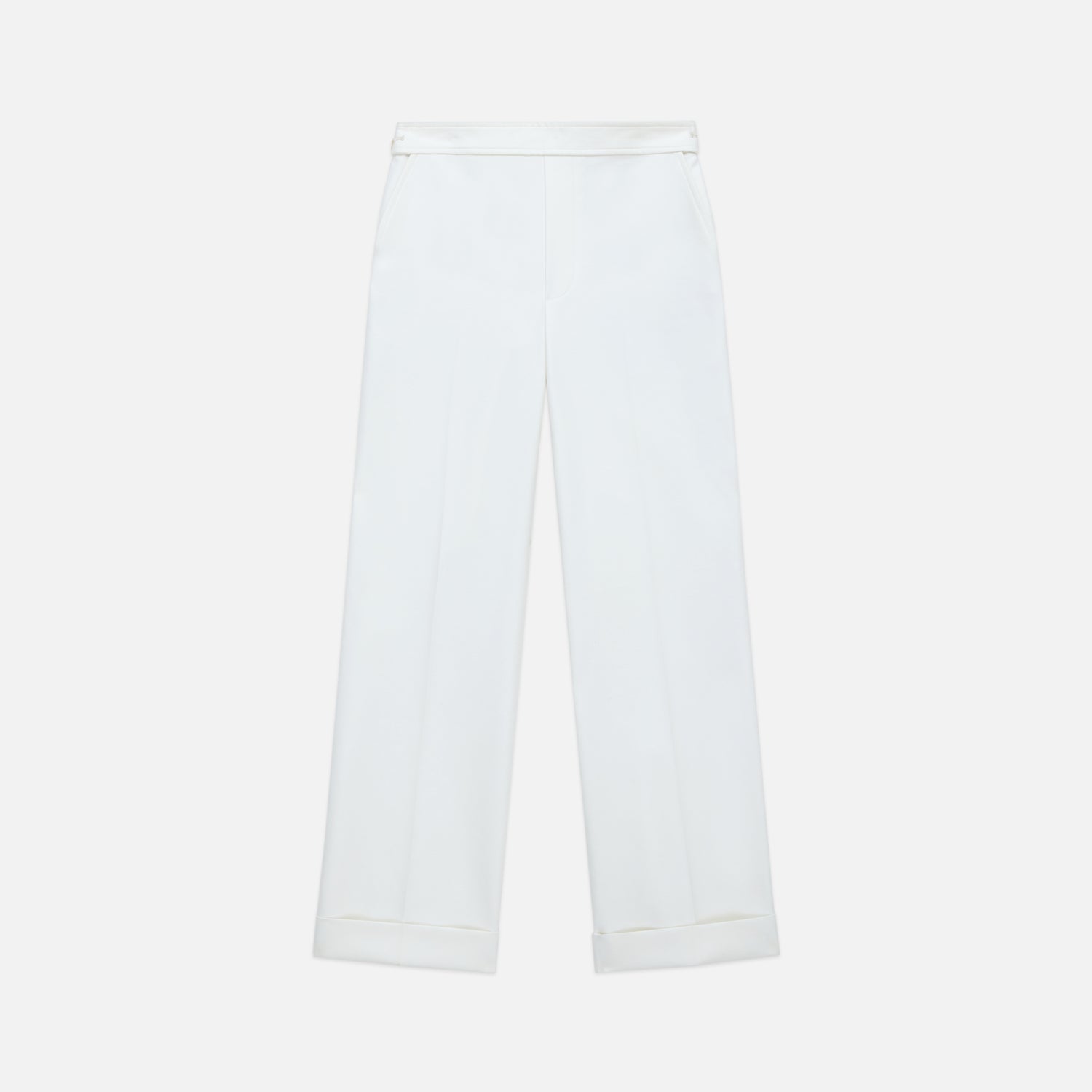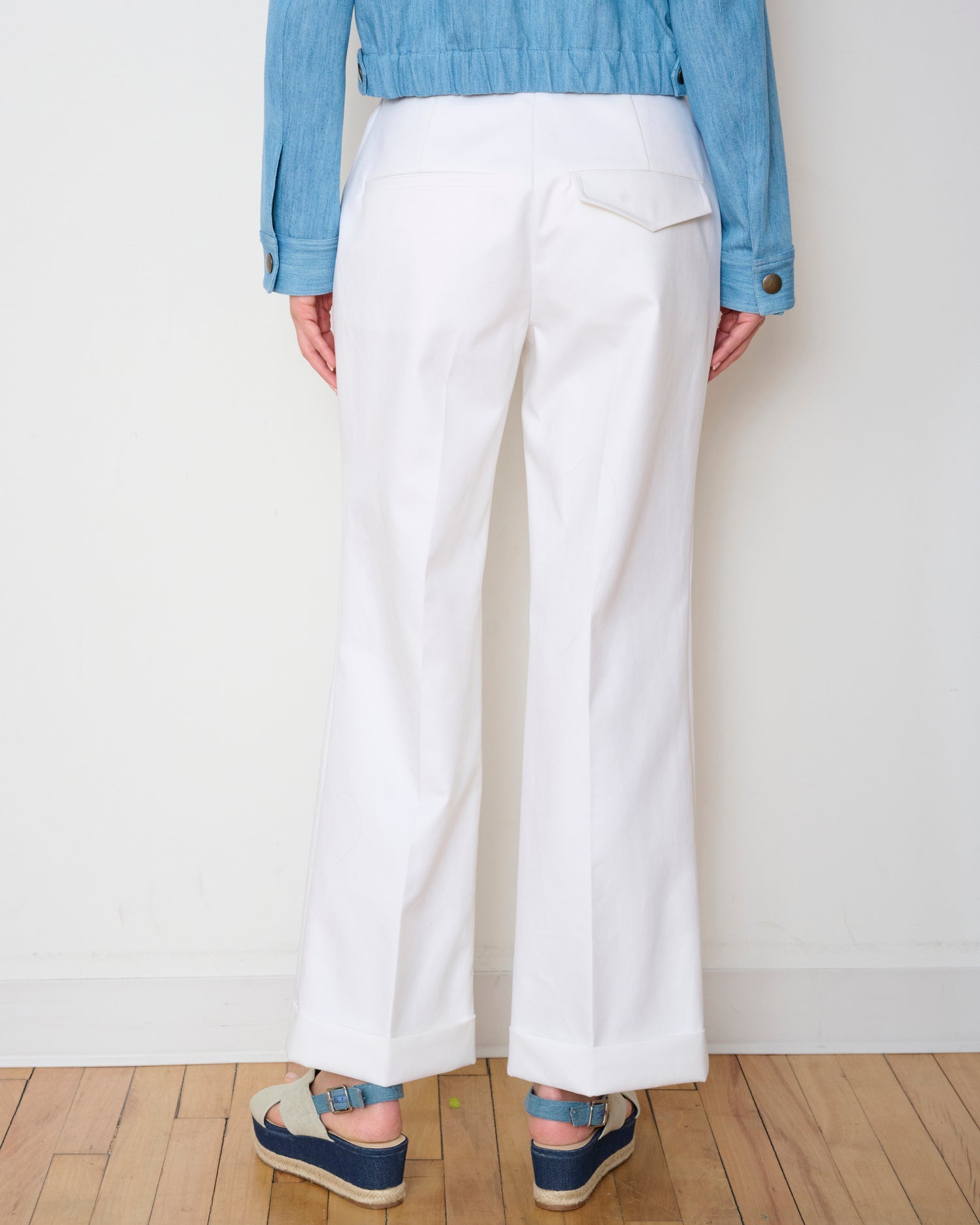 The Parker pant is the straight-leg icon of polished modernity. This 70s-inspired, high-waisted trouser is crafted in upcycled compact cotton with contrasting asymmetric back pockets and a turned cuff bottom hem.