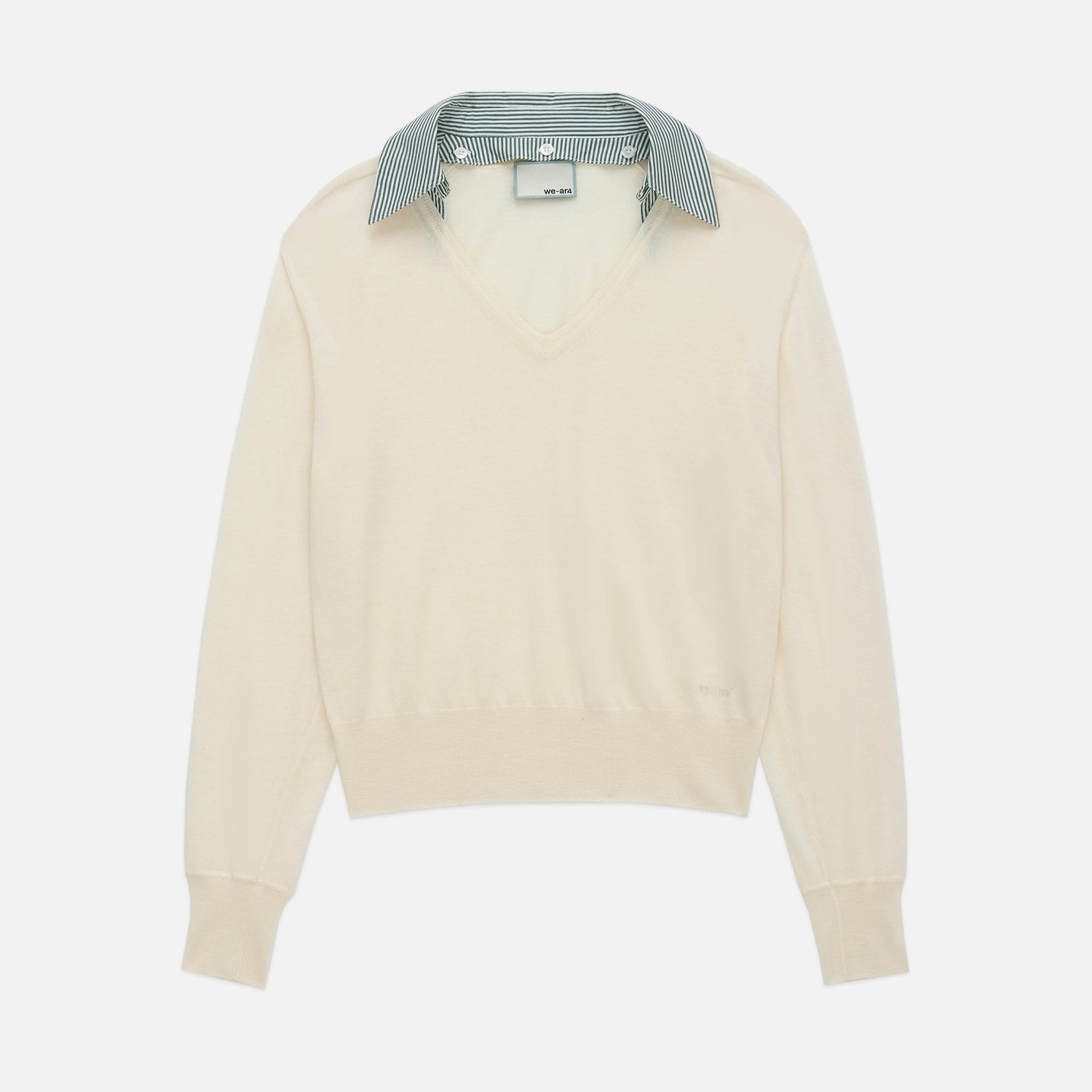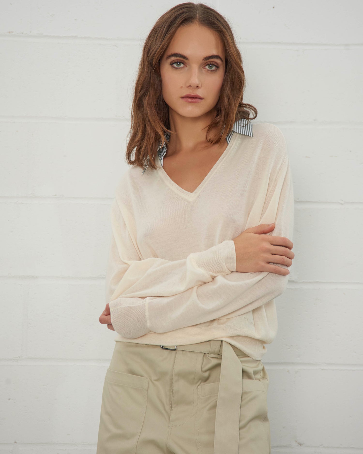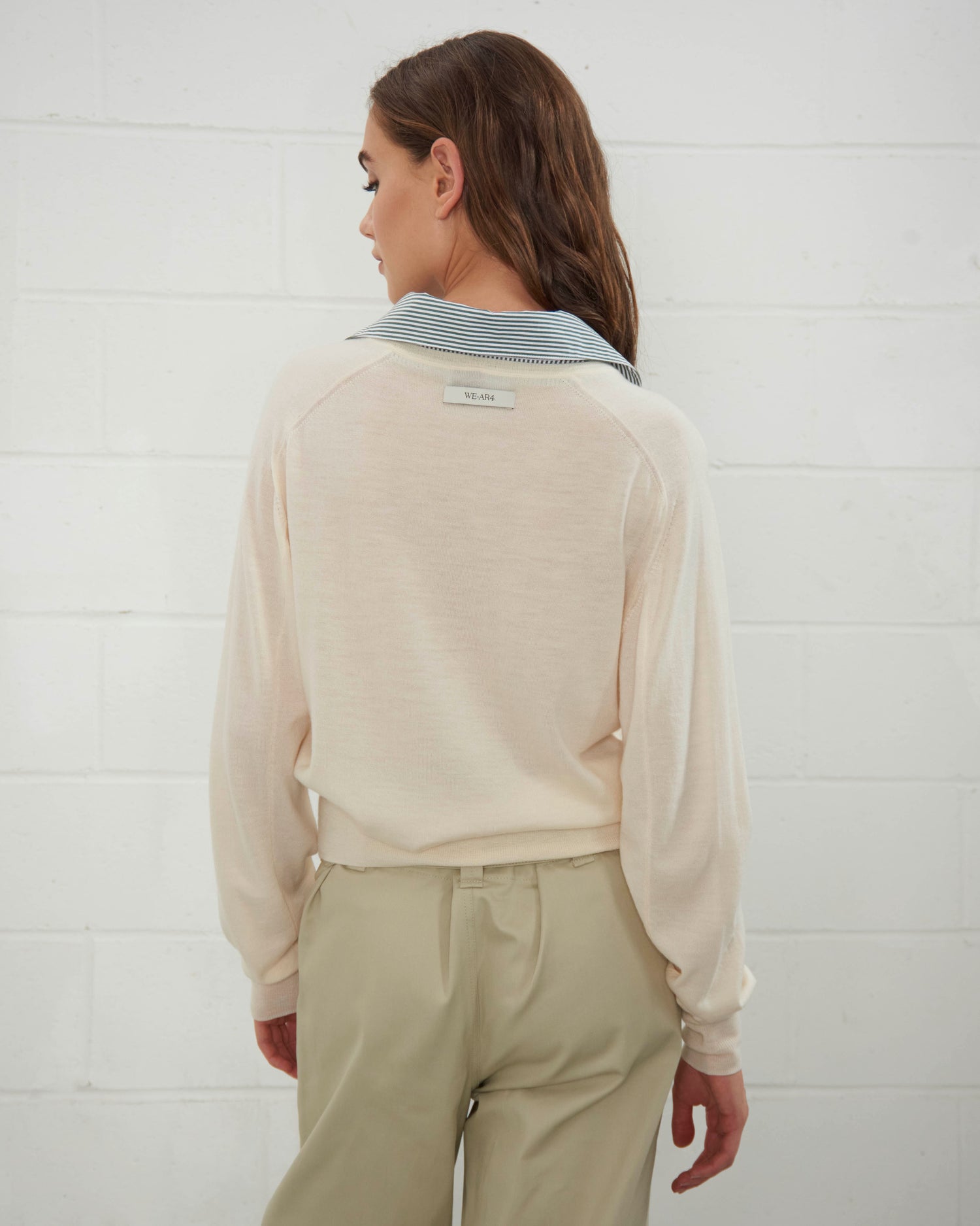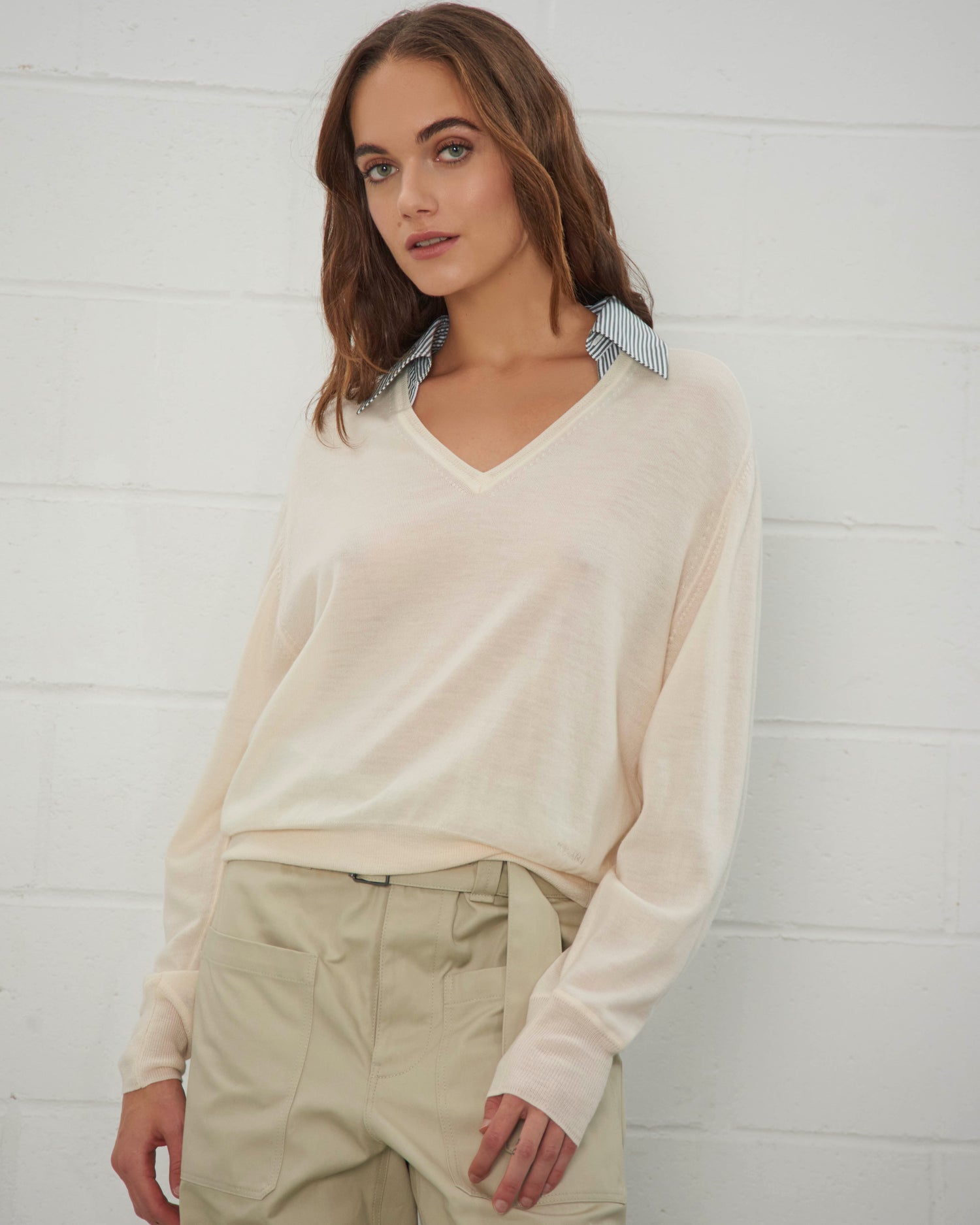 The Parkside Knit is the epitome of preppy sophistication with its fine lightweight merino wool, detachable sleek cotton collar, and wide V-neck. Relaxed and easy with an unexpected pop of polish, you can style it both casual & polished.