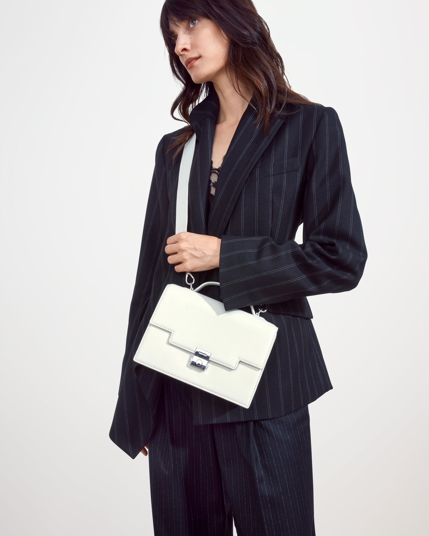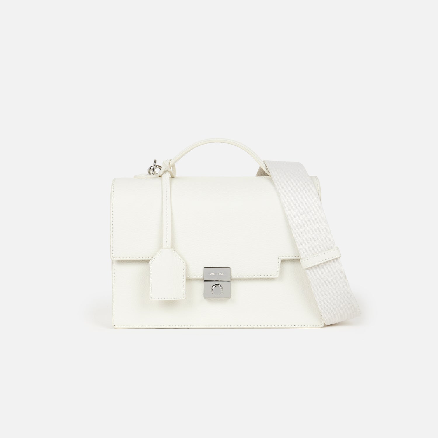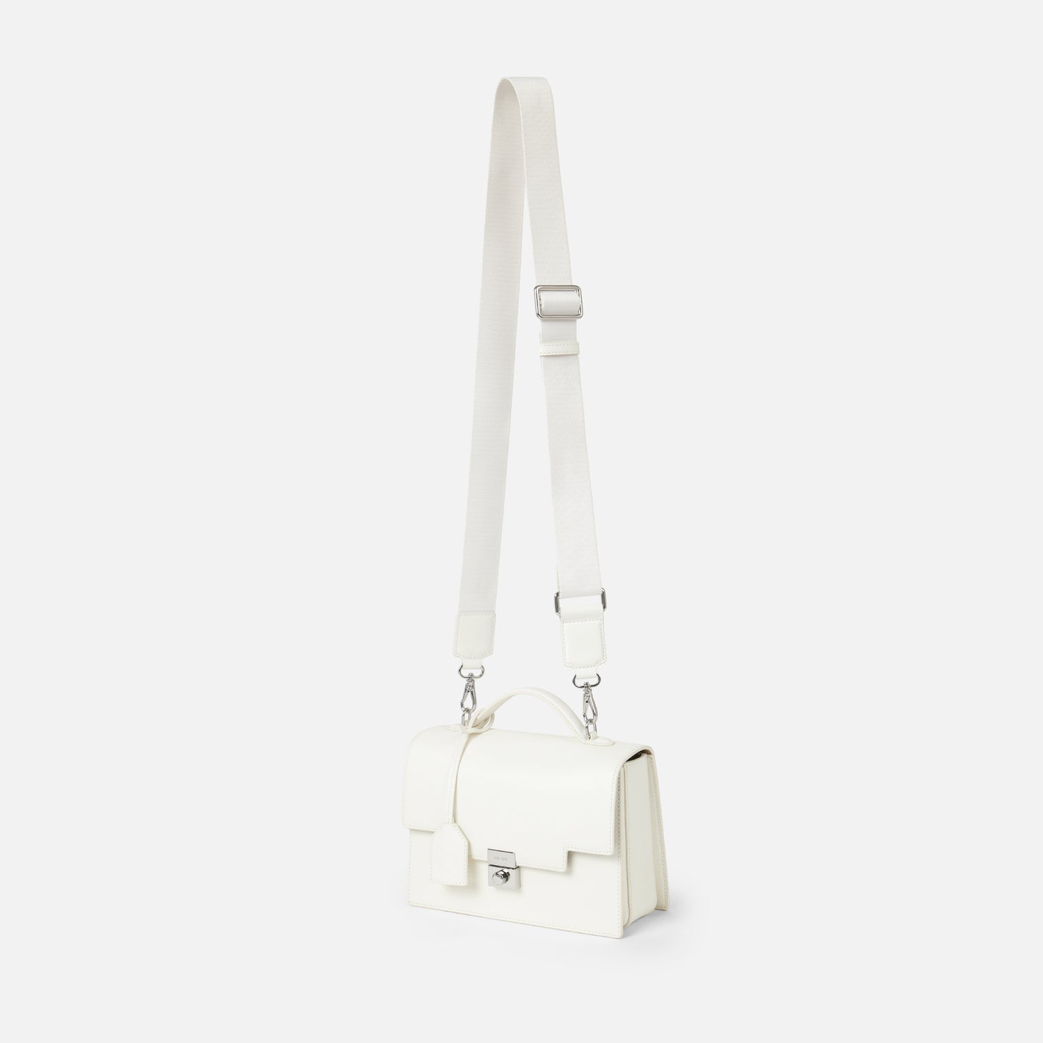 A modern interpretation of the utilitarian glamour trunk, the Retro Trunk bag is structured in shape with a sleek, engraved push lock closure and webbed crossbody strap.
