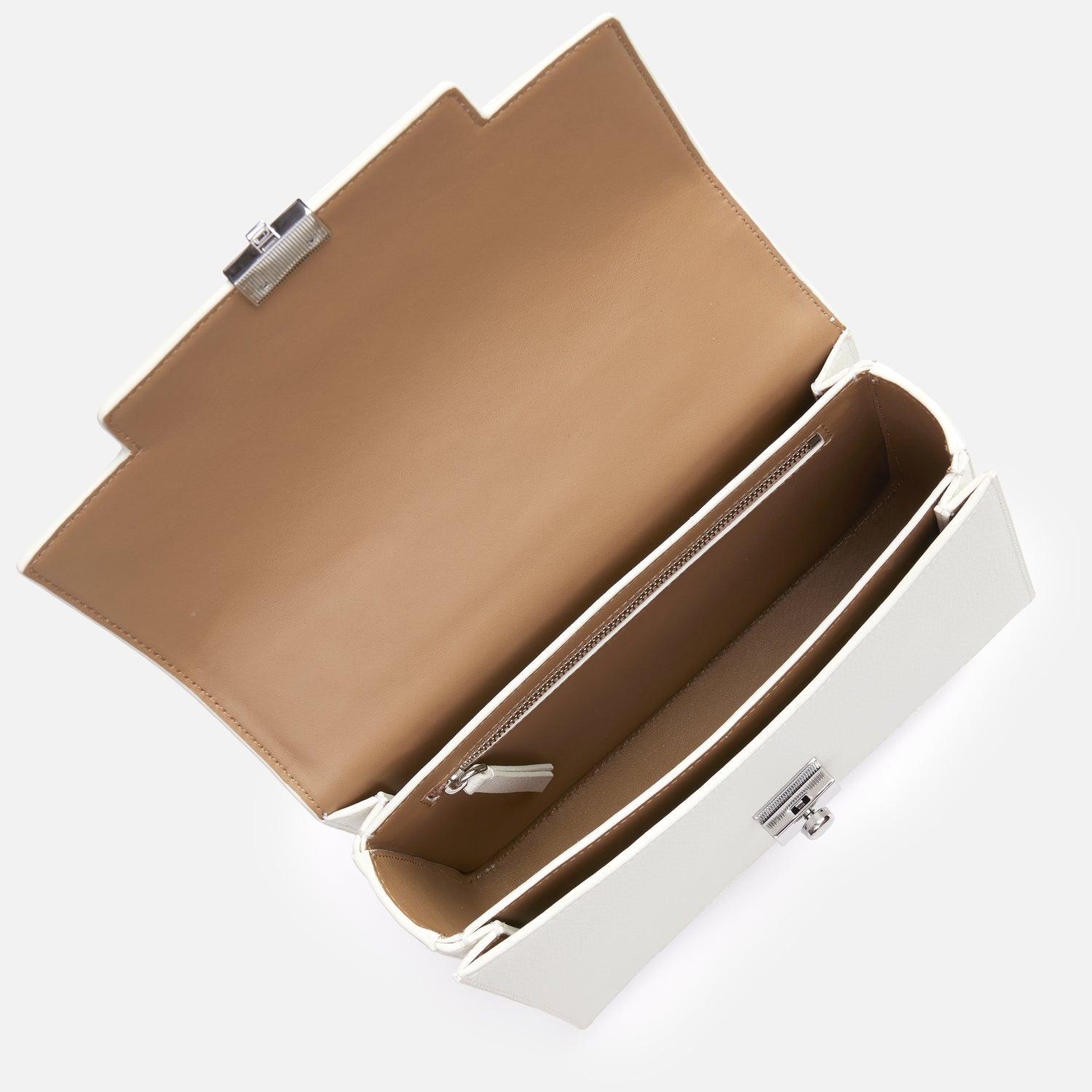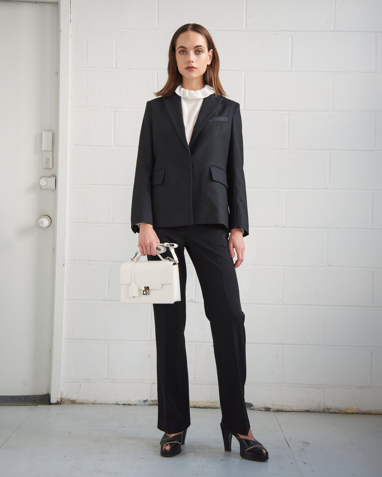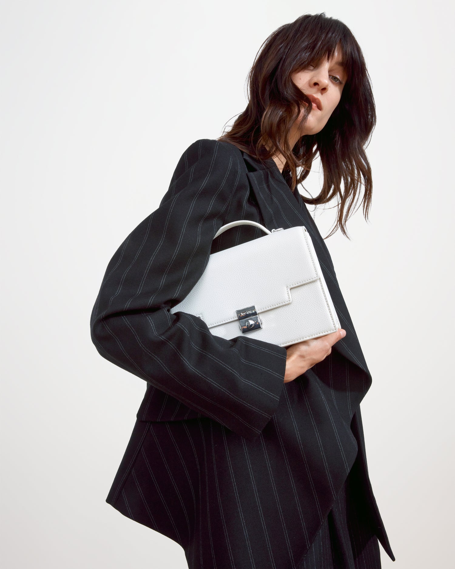 A modern interpretation of the utilitarian glamour trunk, the Retro Trunk bag is structured in shape with a sleek, engraved push lock closure and webbed crossbody strap.