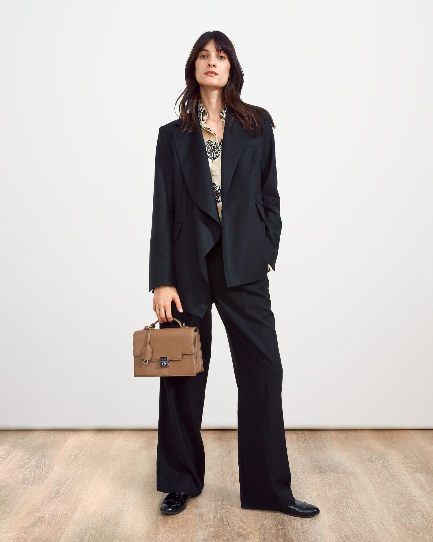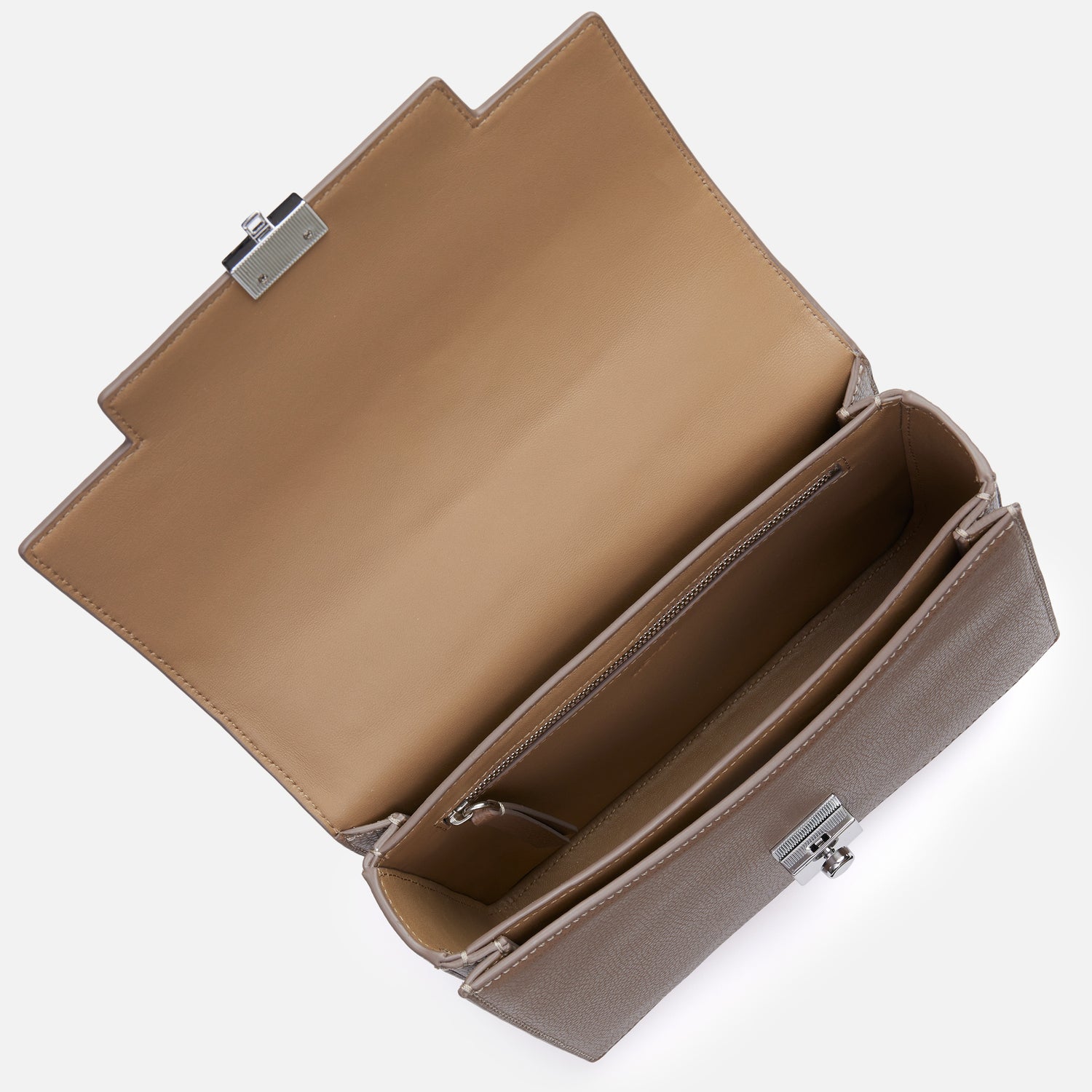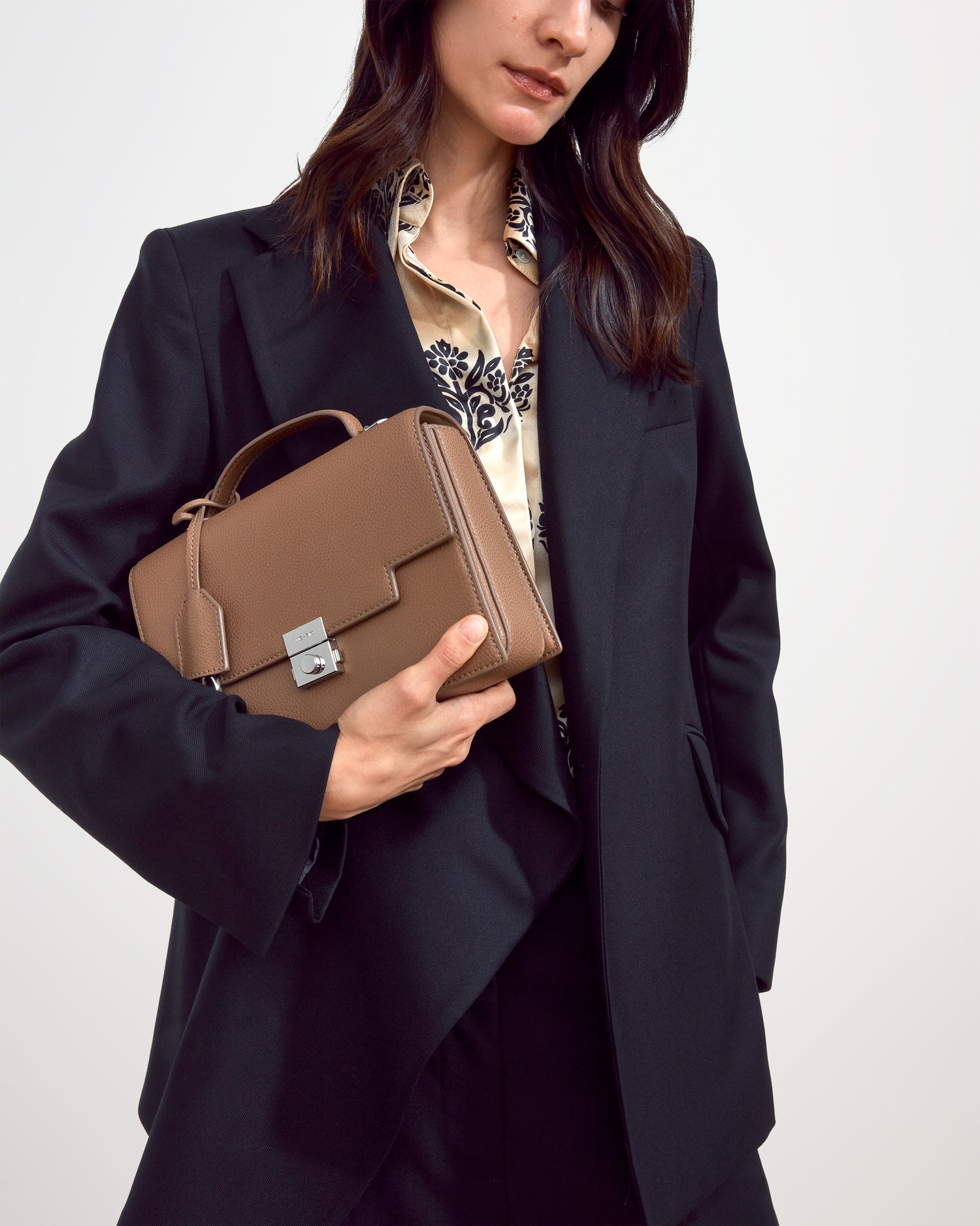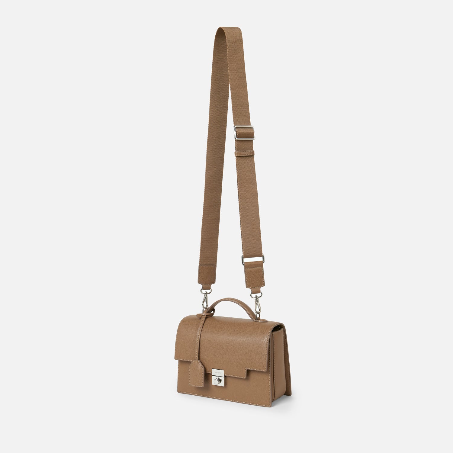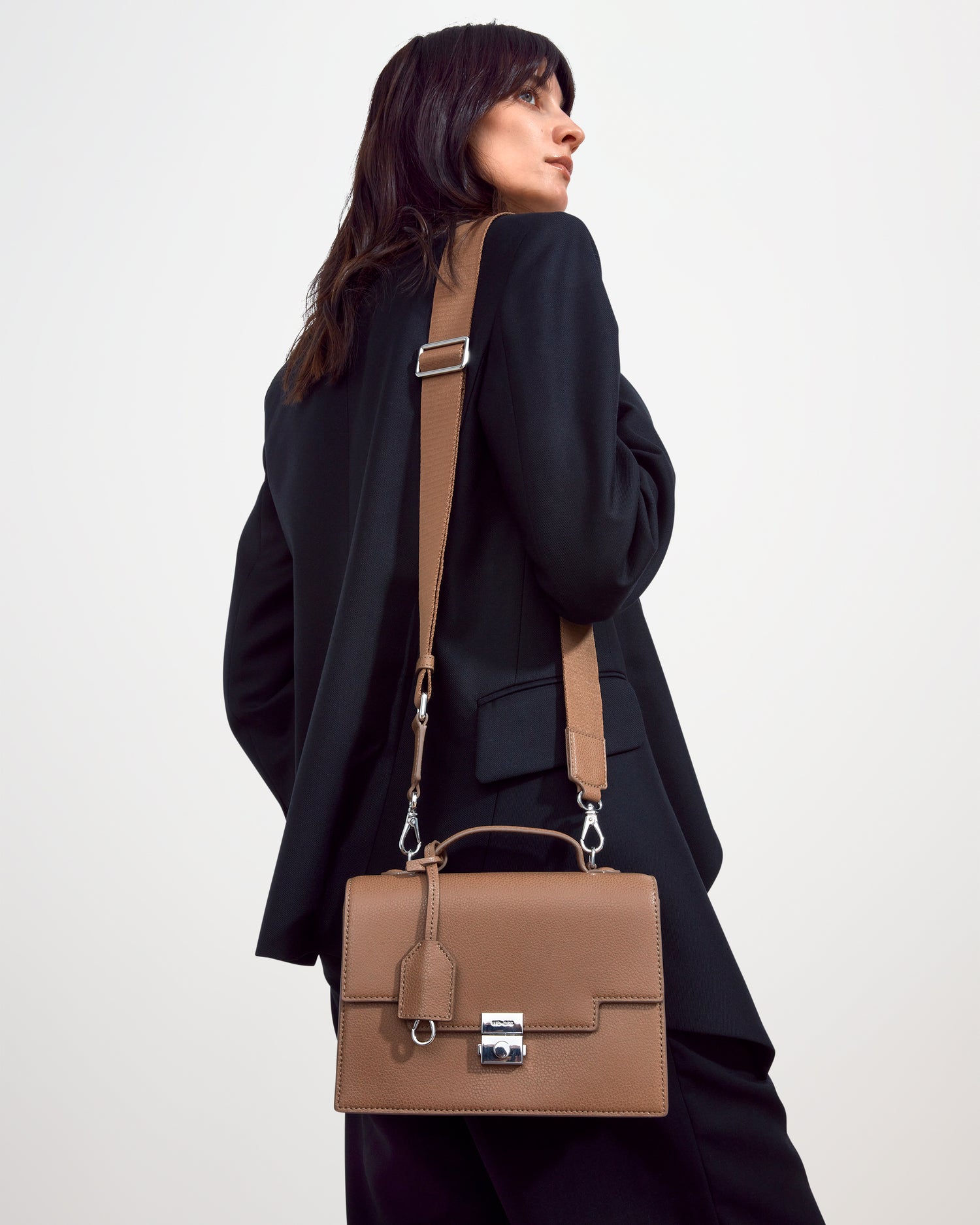 A modern interpretation of the utilitarian glamour trunk, the Retro Trunk bag is structured in shape with a sleek, engraved push lock closure and webbed crossbody strap.