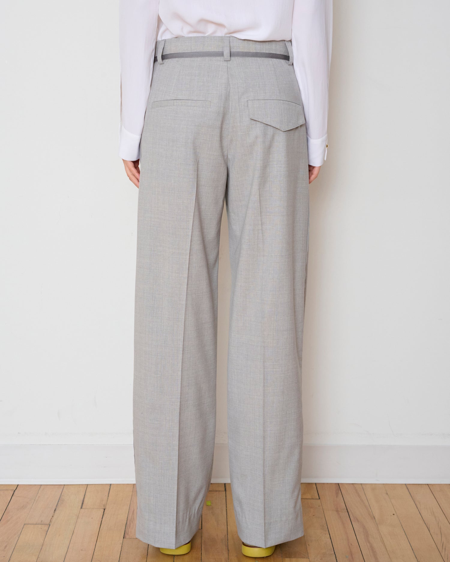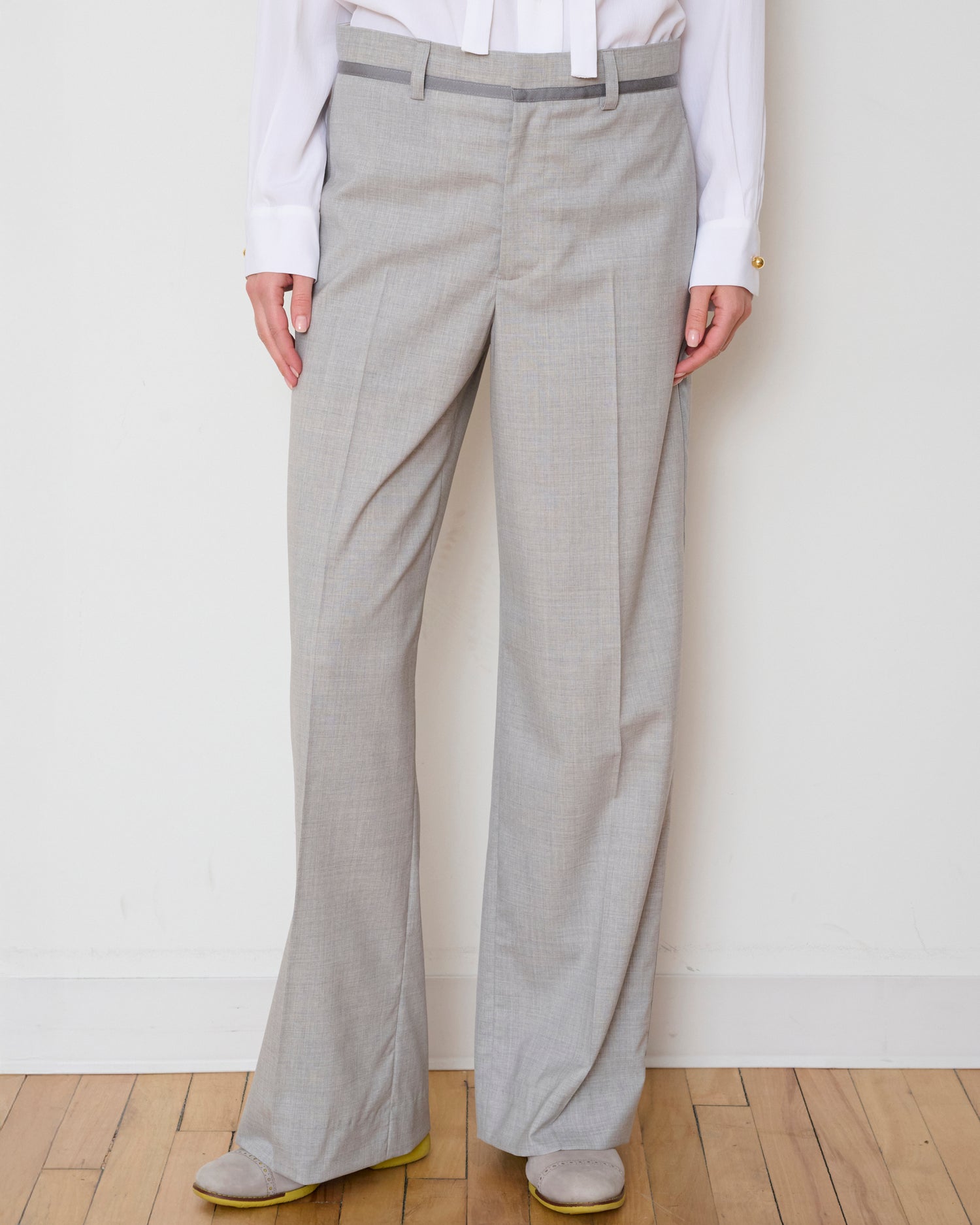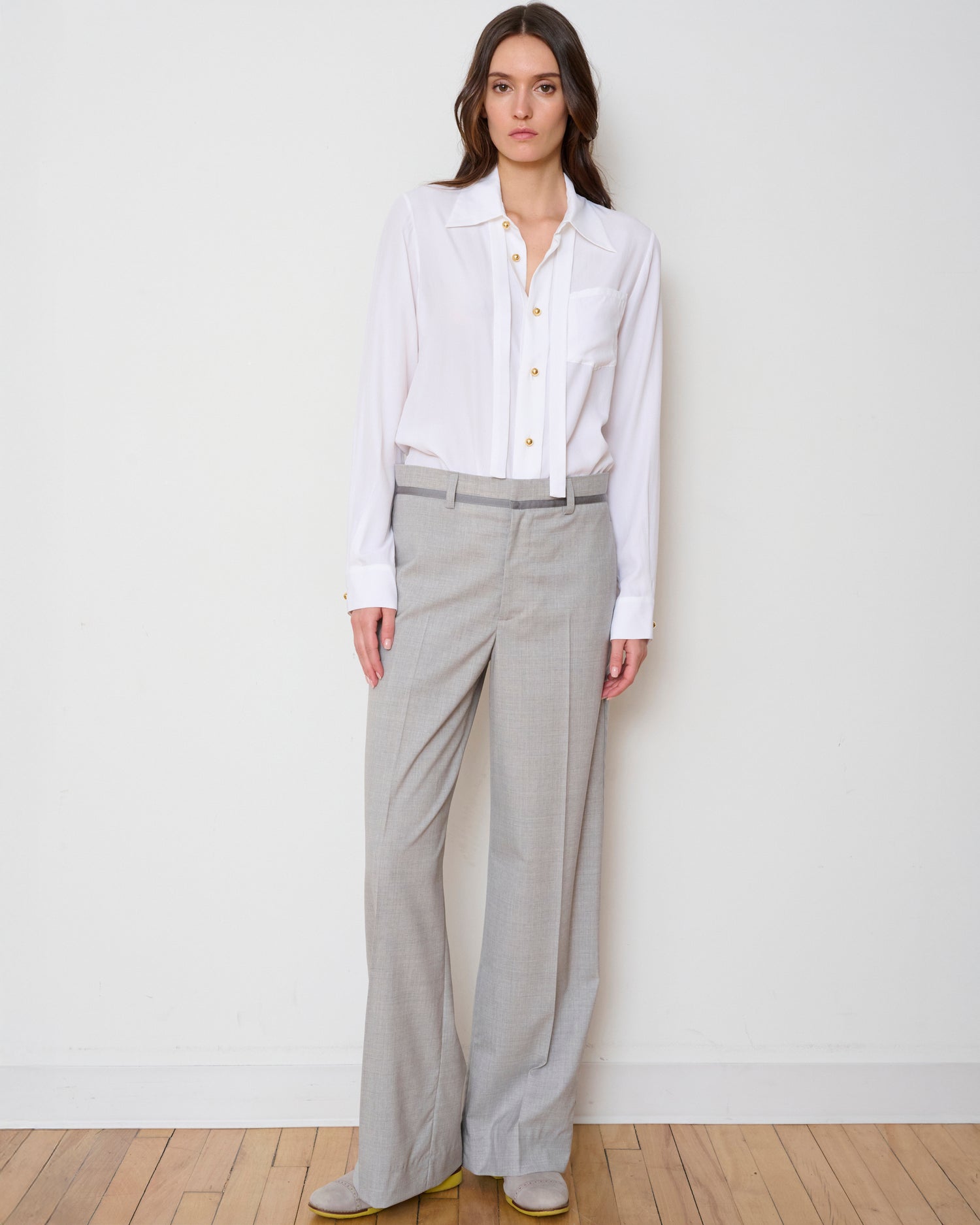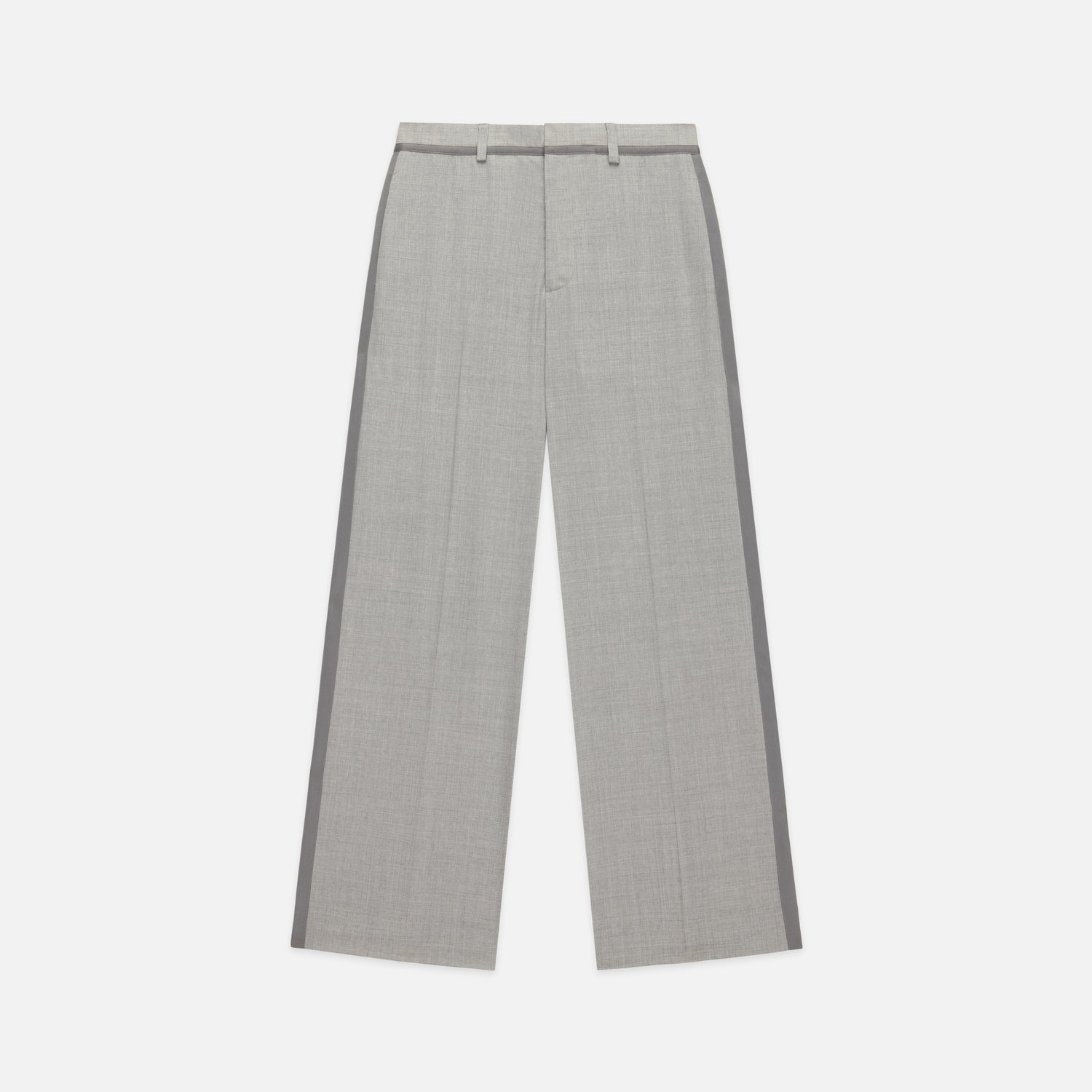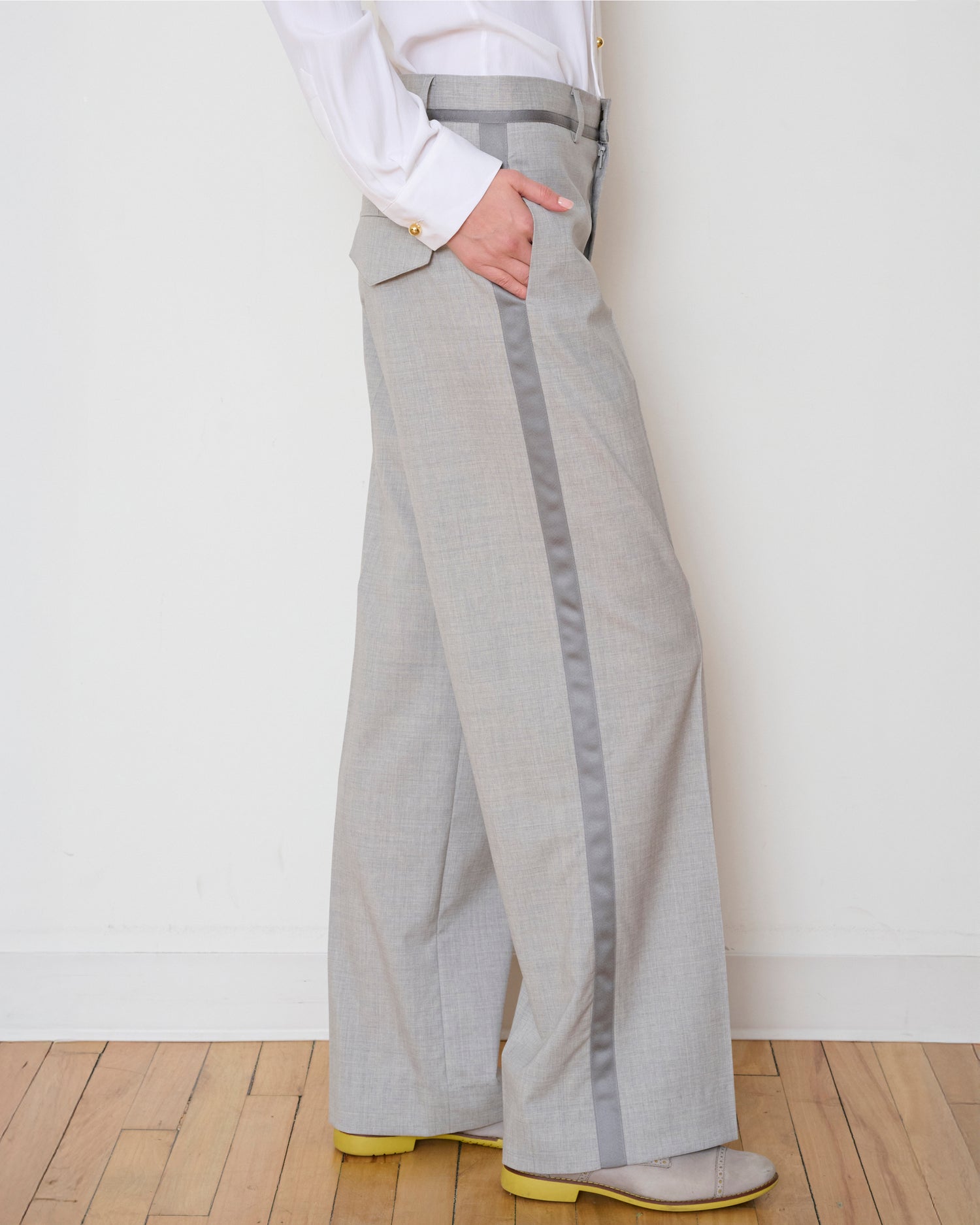 A study in refined elegance, the Tuxedo Trouser is a sleek foundation for a modern wardrobe. Its impeccably tailored wide-leg silhouette drapes with effortless ease, while a contrast satin ribbon glides along the outer leg, adding a touch of classic sophistication. Pair it with the matching Cocktail Blazer for a perfectly polished suit.