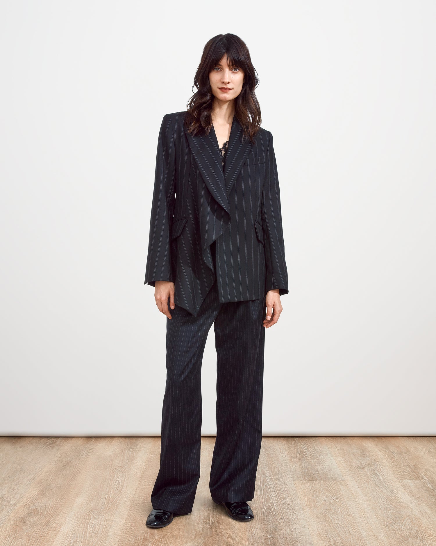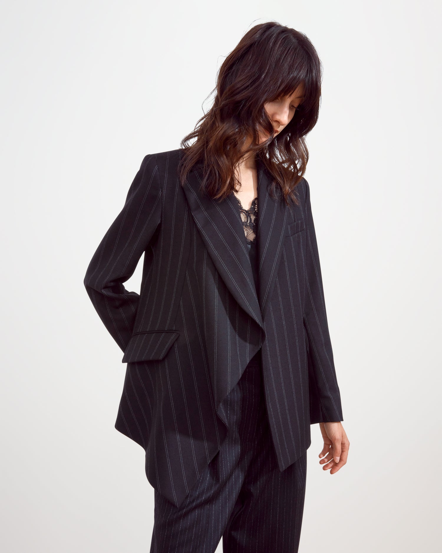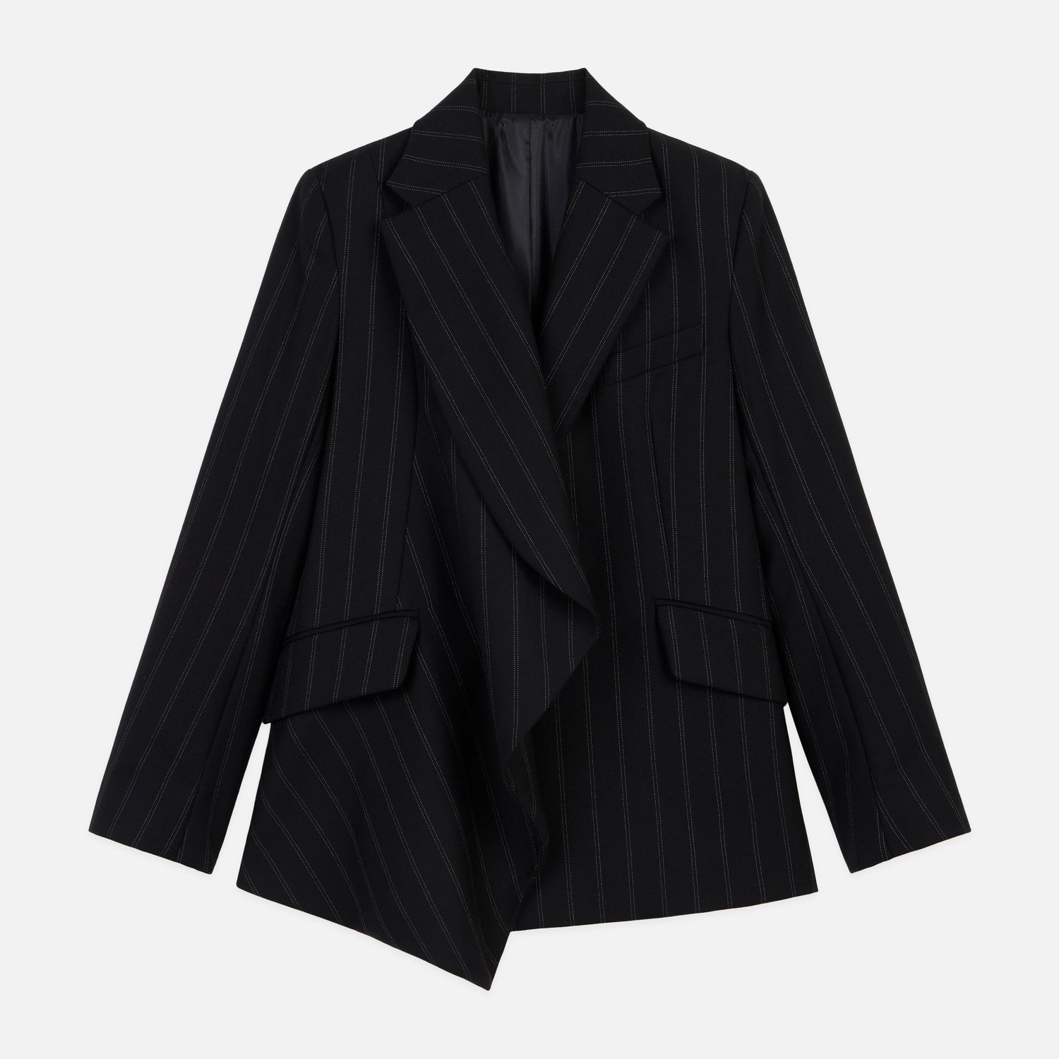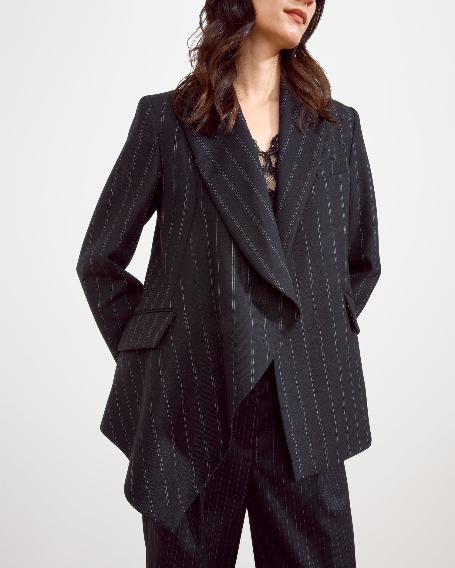 - Asymmetric draped lapel