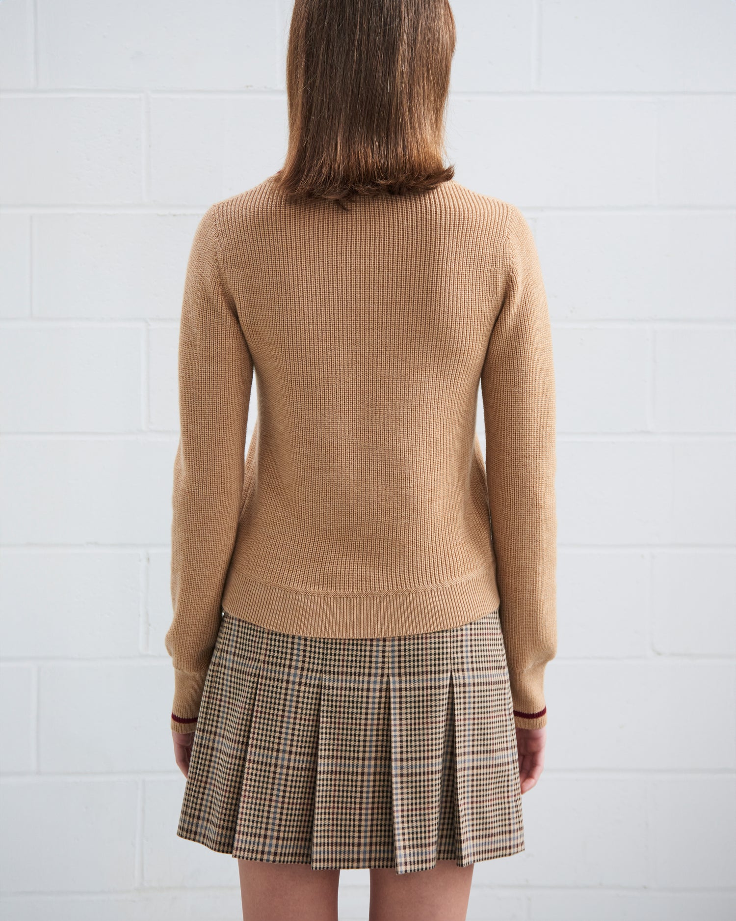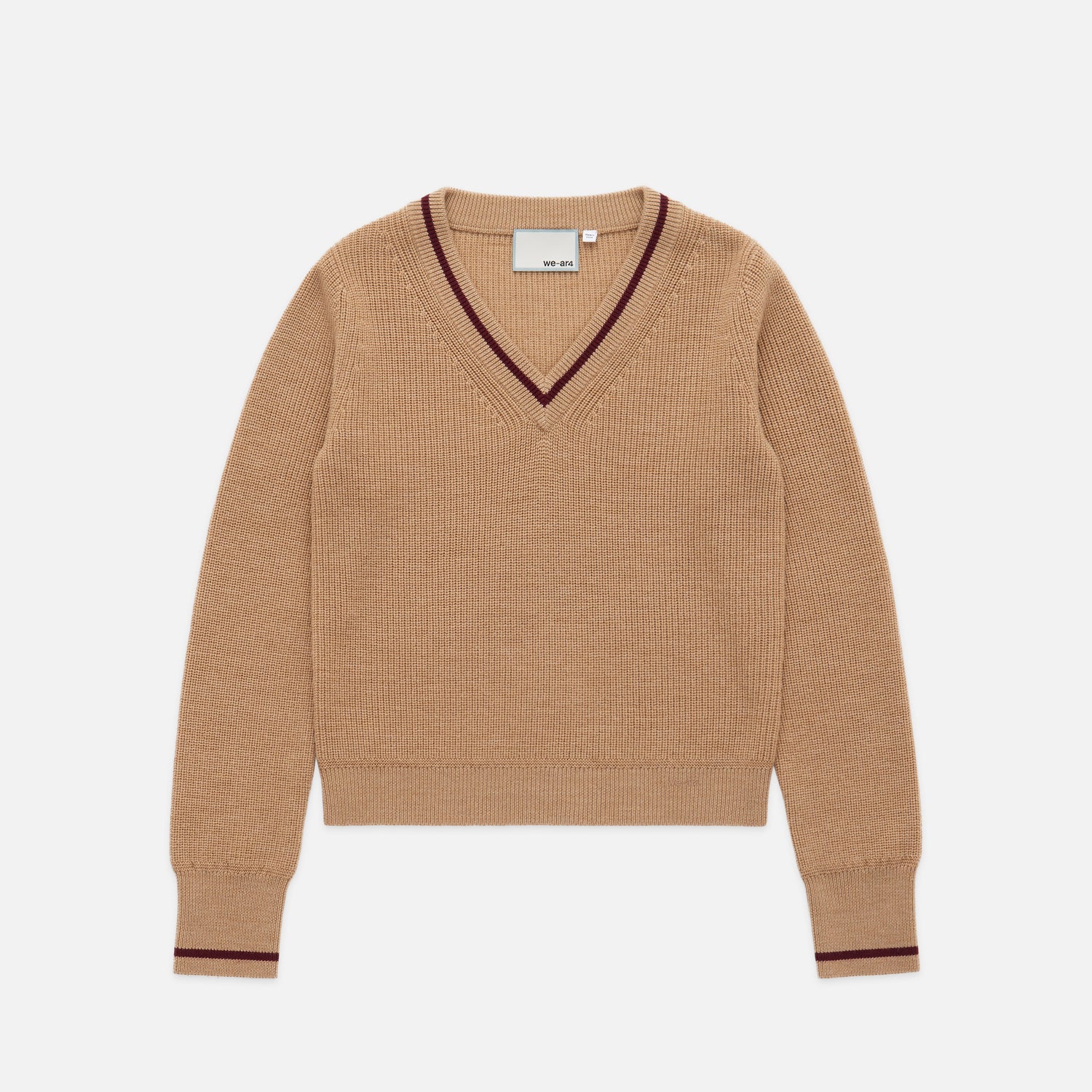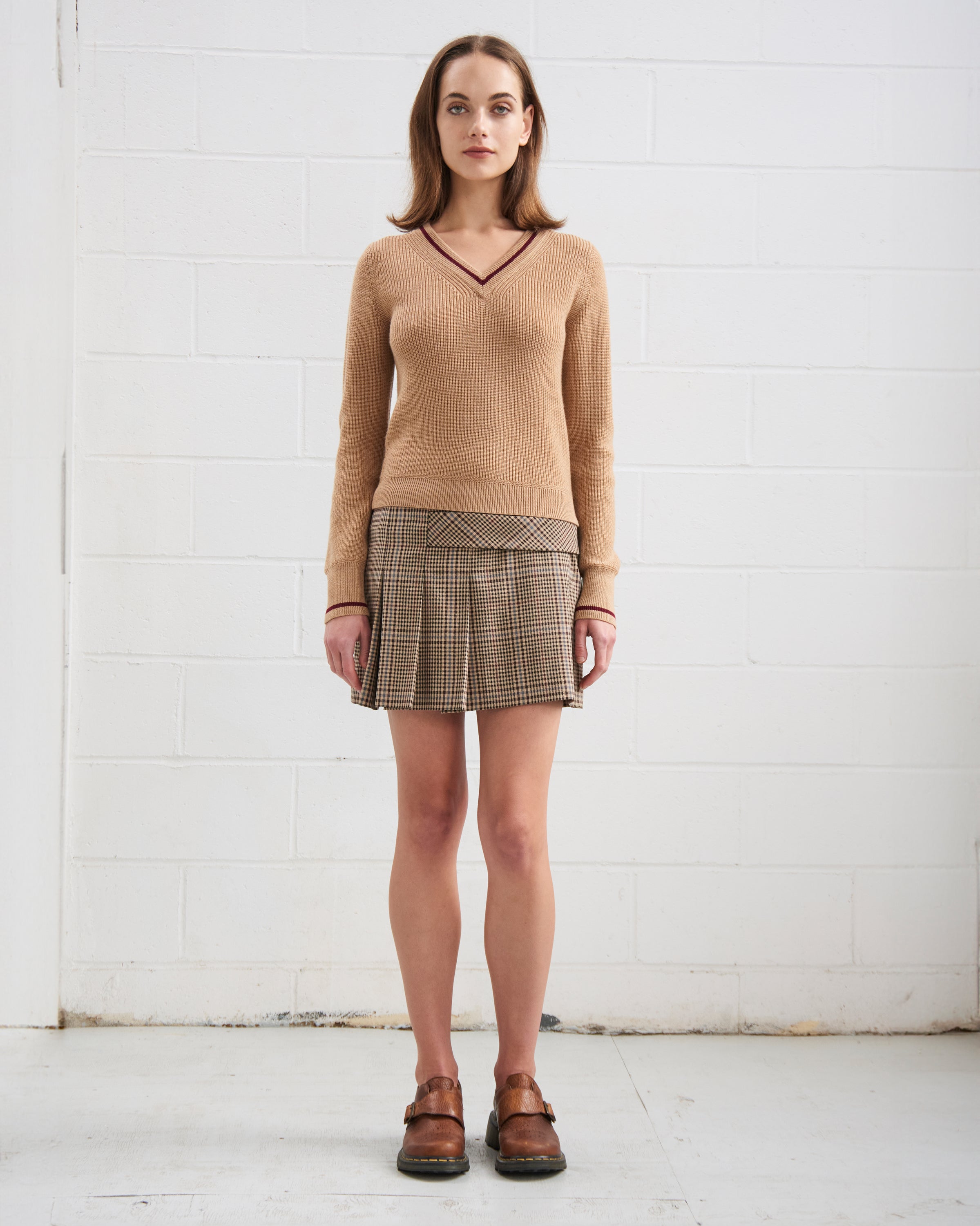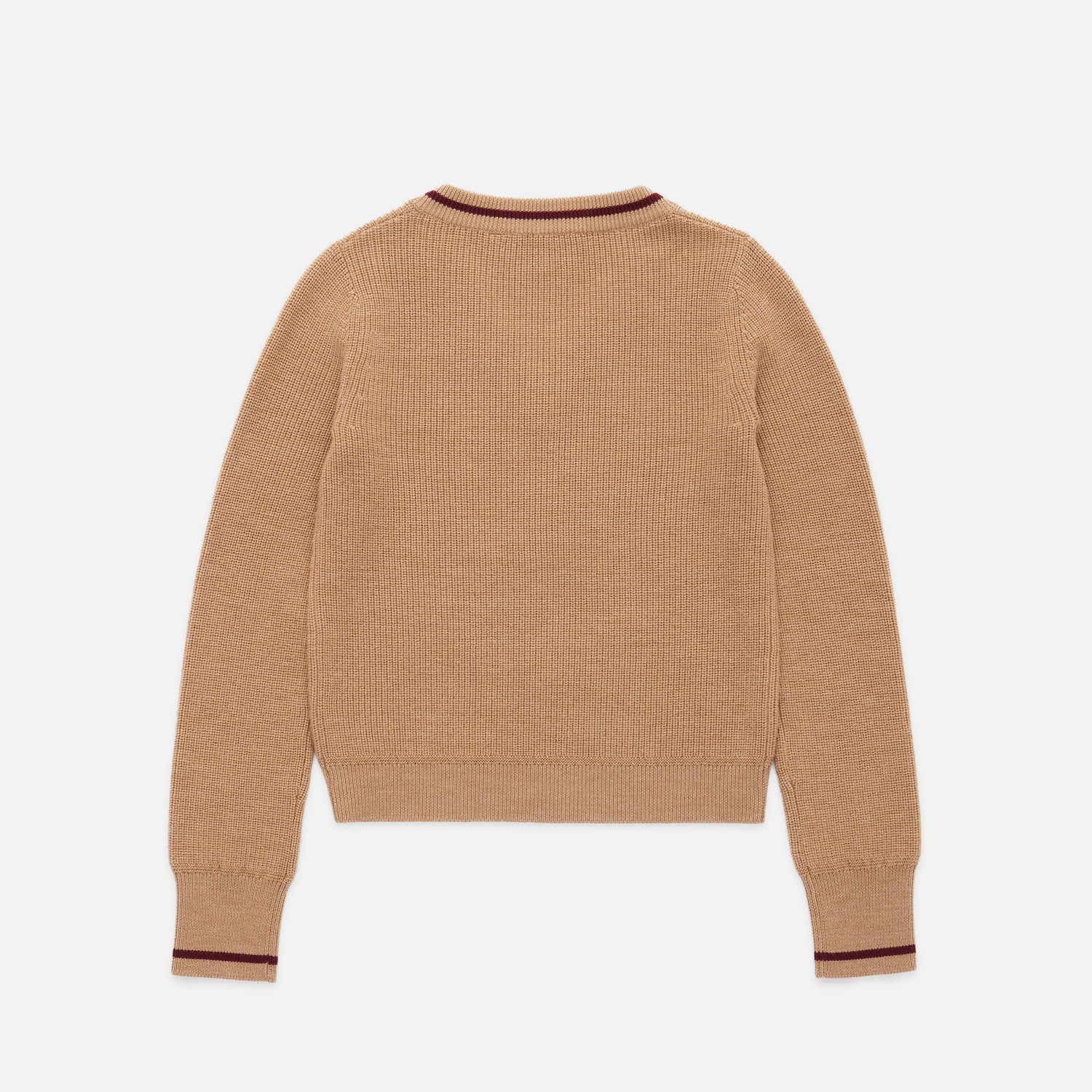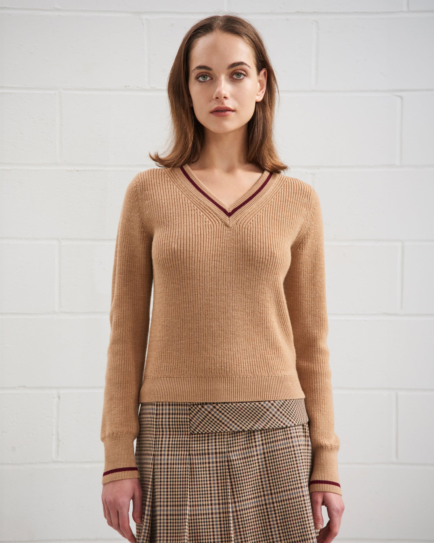 The Varsity V’s cropped fit, contrast tipped neckline, cuffs and chunky fisherman’s rib knit make it an essential for a fall casual collegiate look.