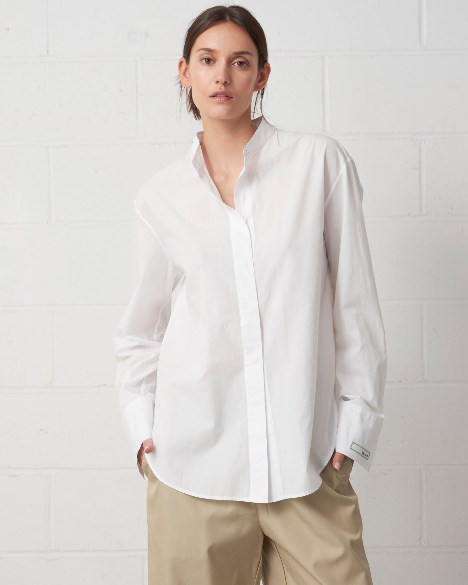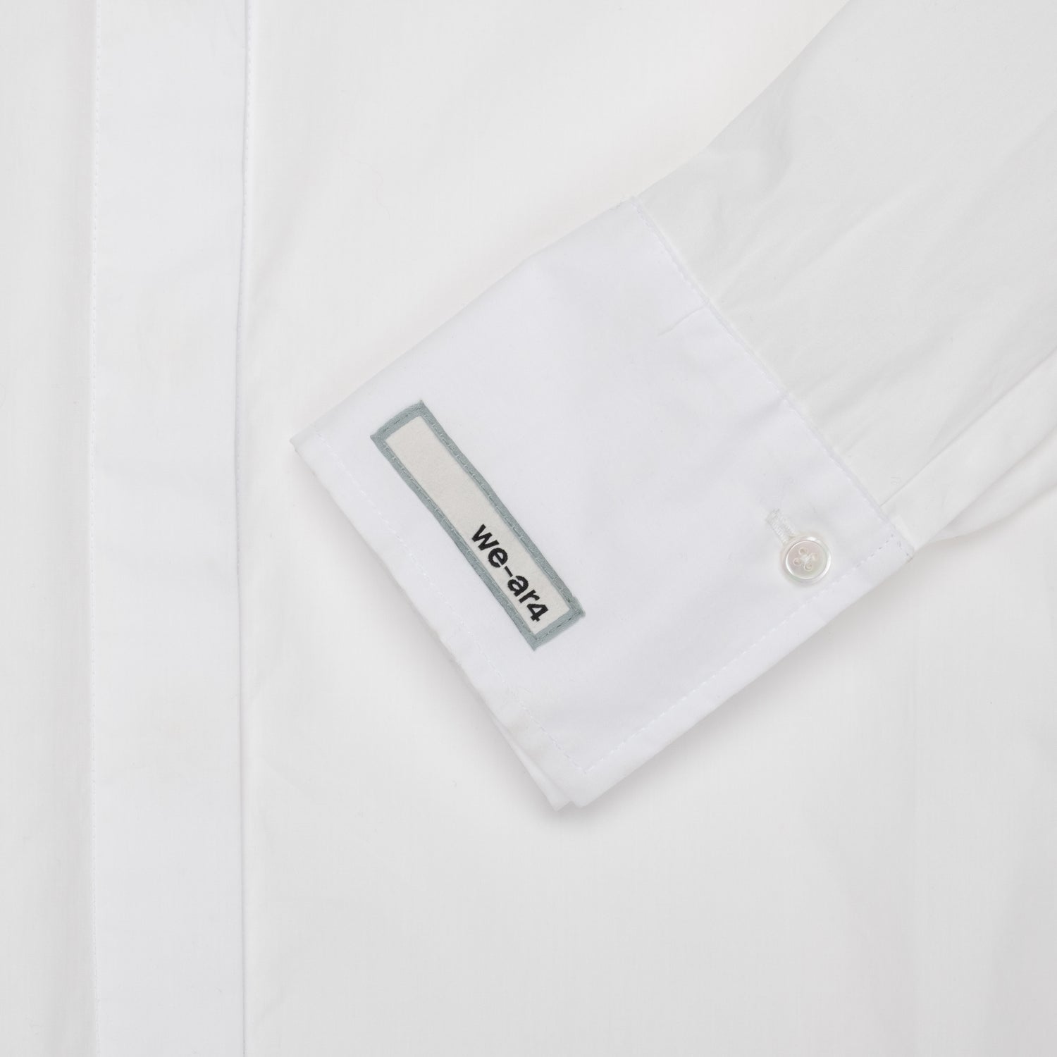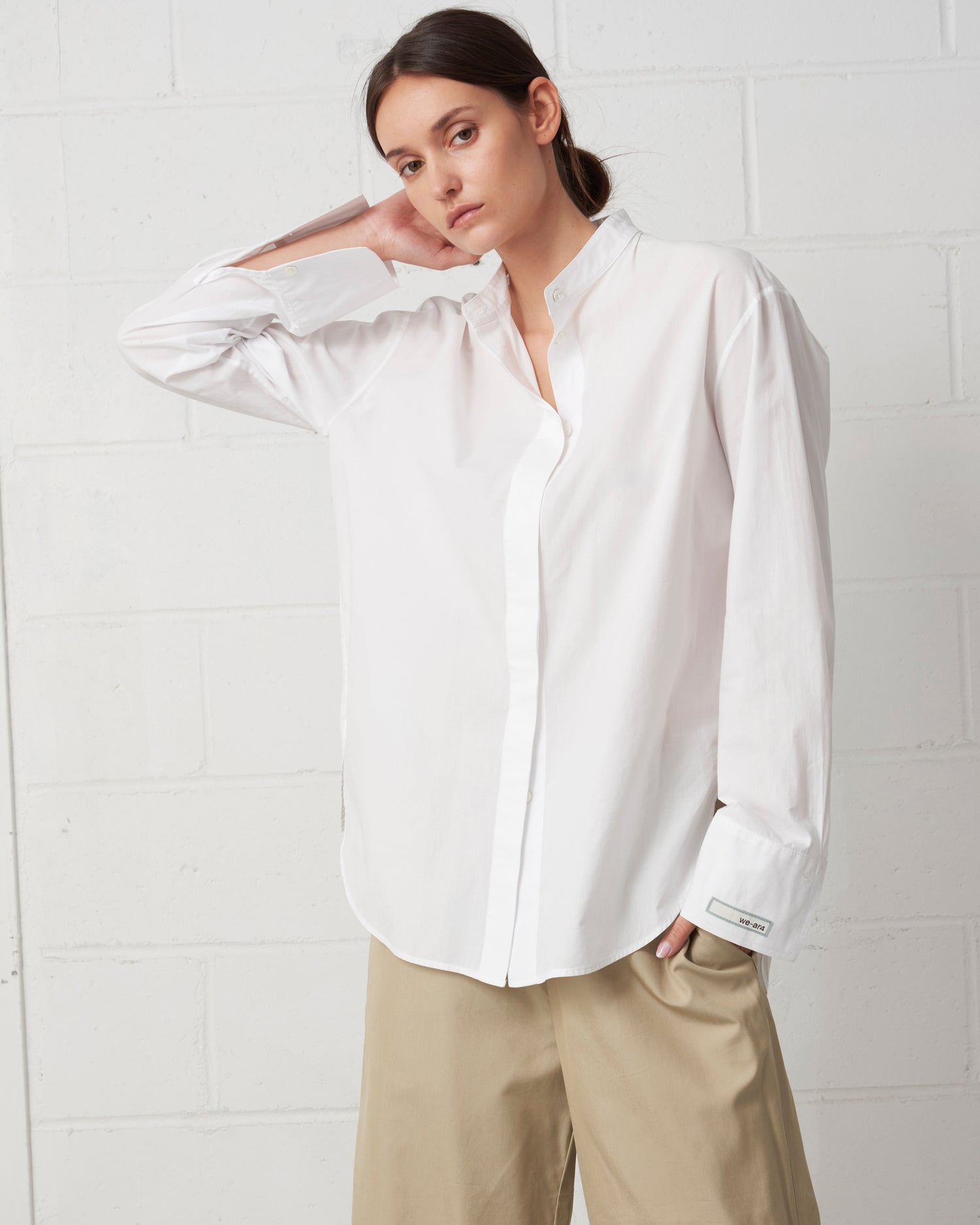 The Collarless Shirt is a modern essential. With an oversized fit, this crisp cotton shirt features mother-of-pearl buttons and a a WE-AR4 polished label on the left cuff.
