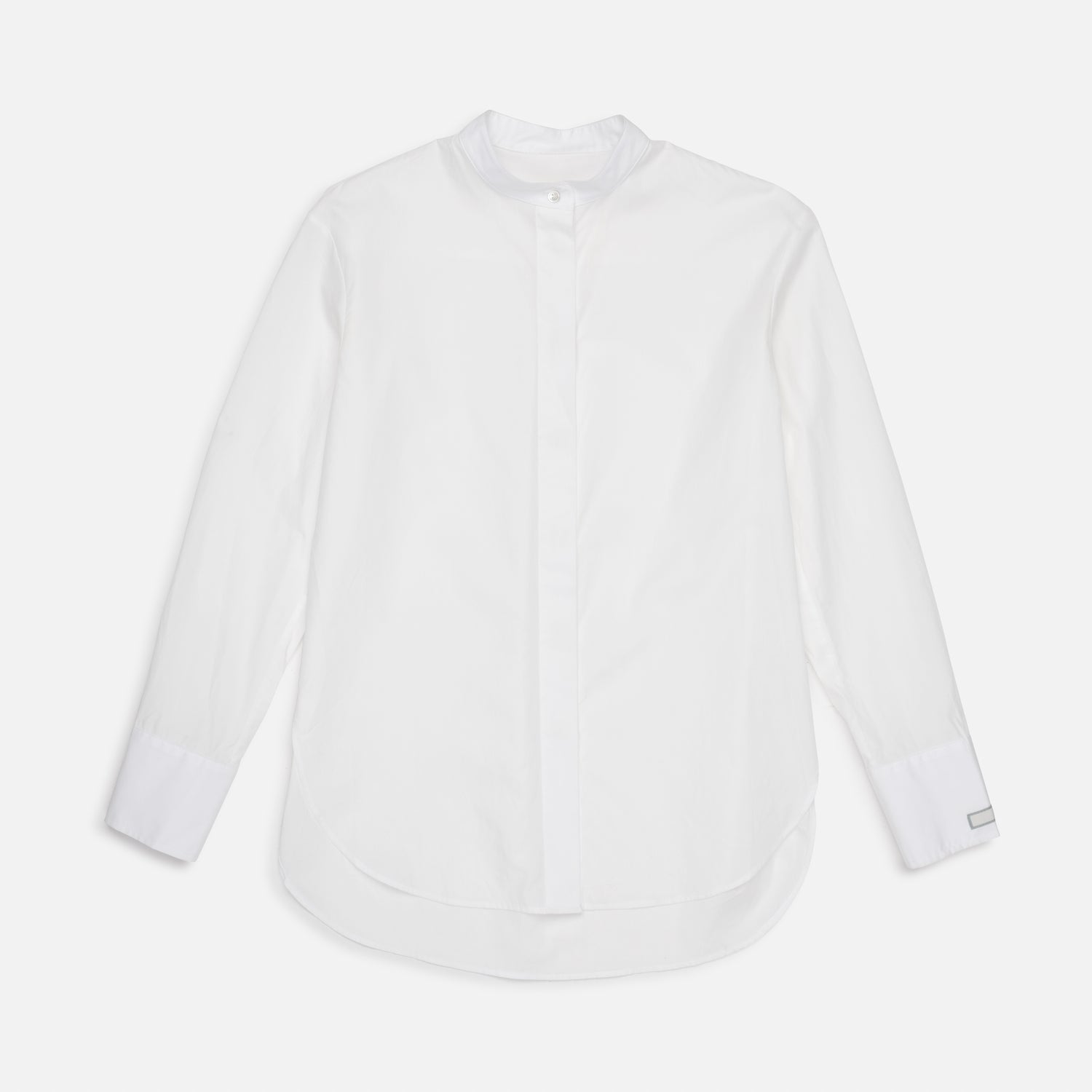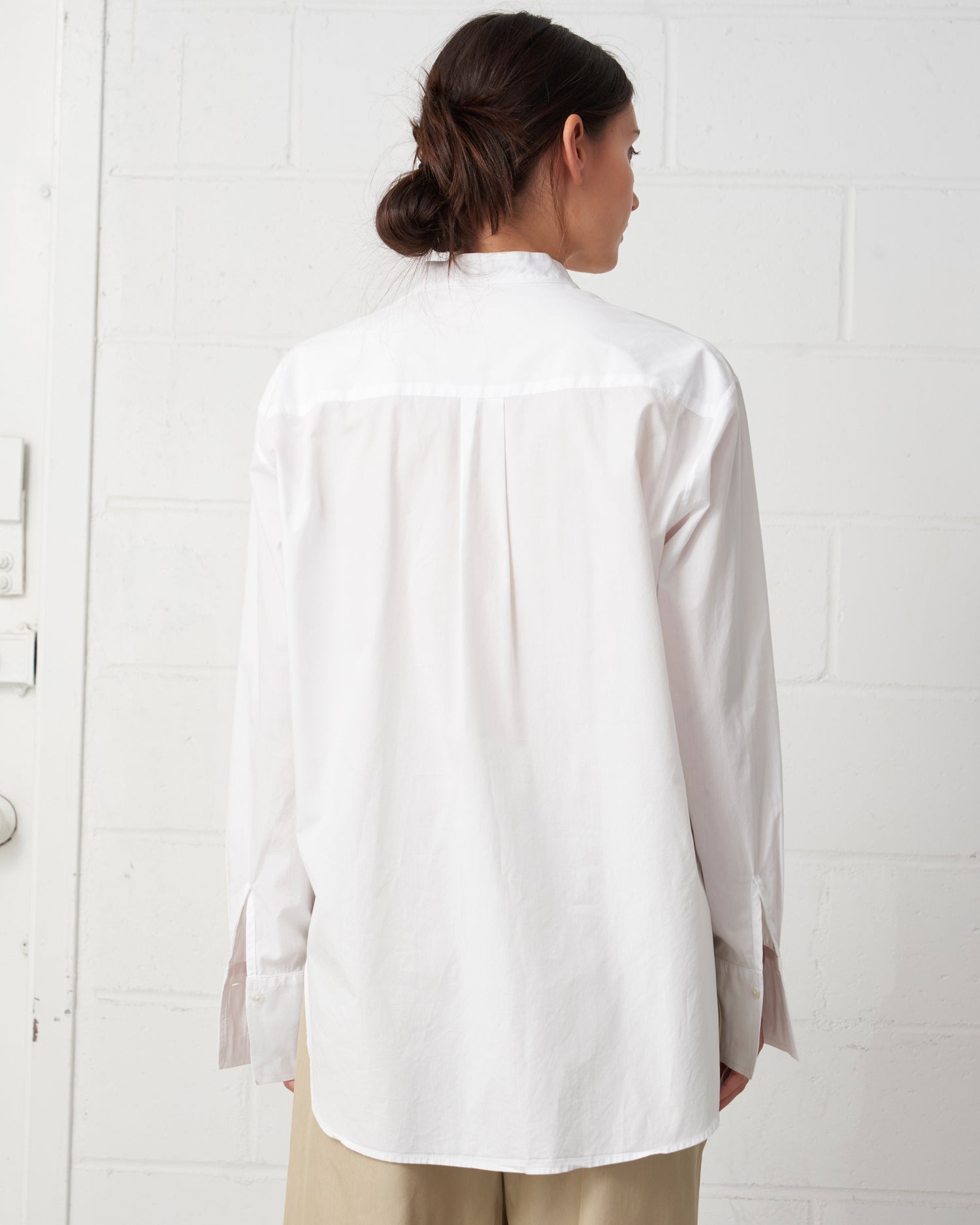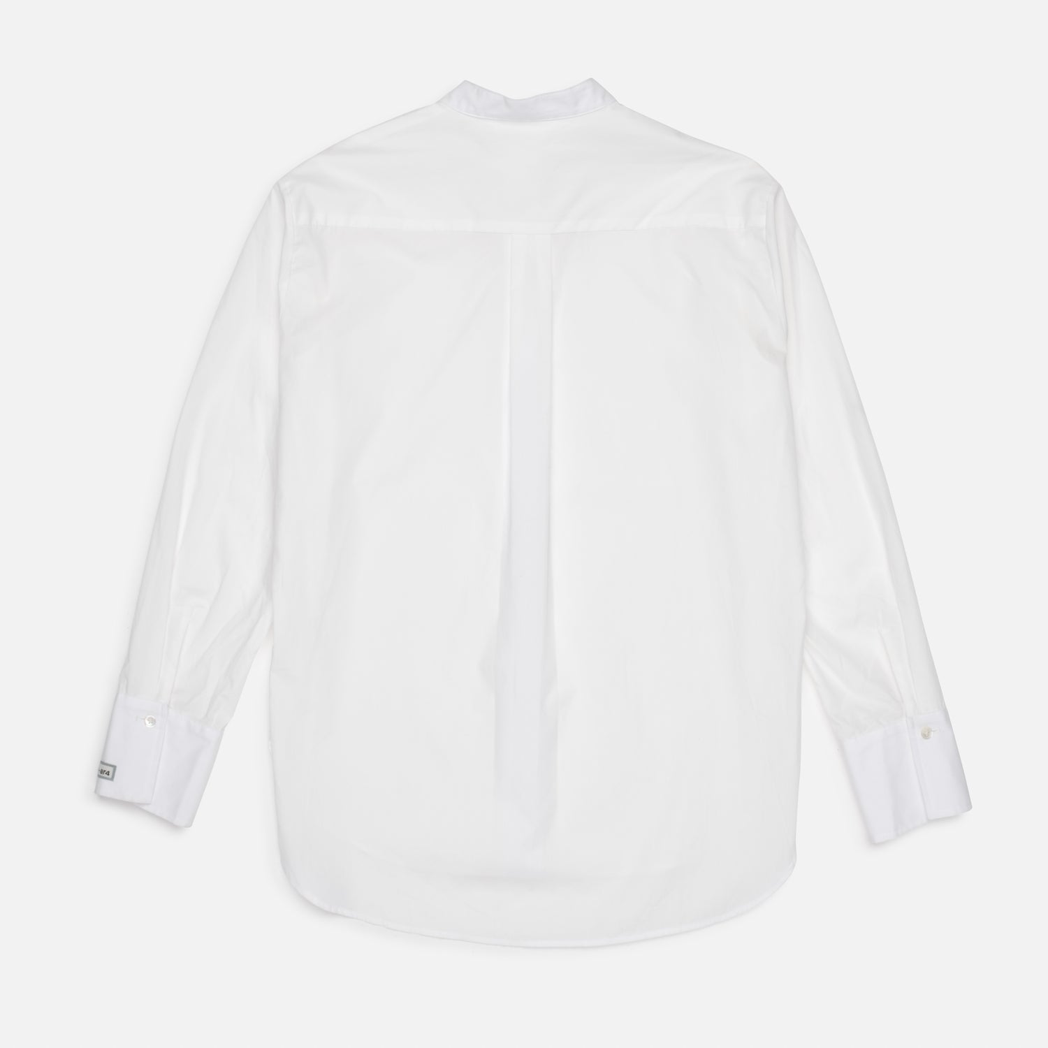 The Collarless Shirt is a modern essential. With an oversized fit, this crisp cotton shirt features mother-of-pearl buttons and a a WE-AR4 polished label on the left cuff.