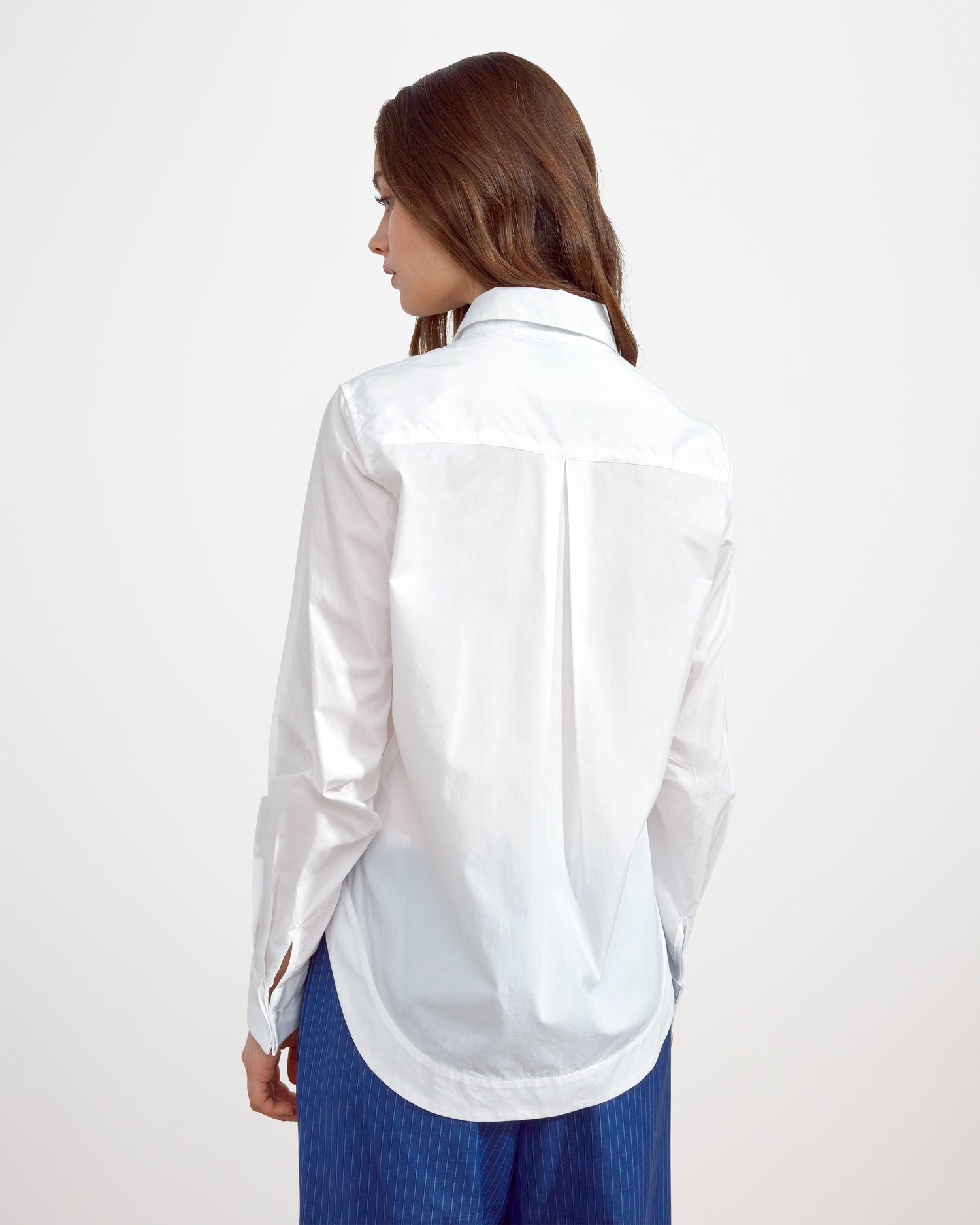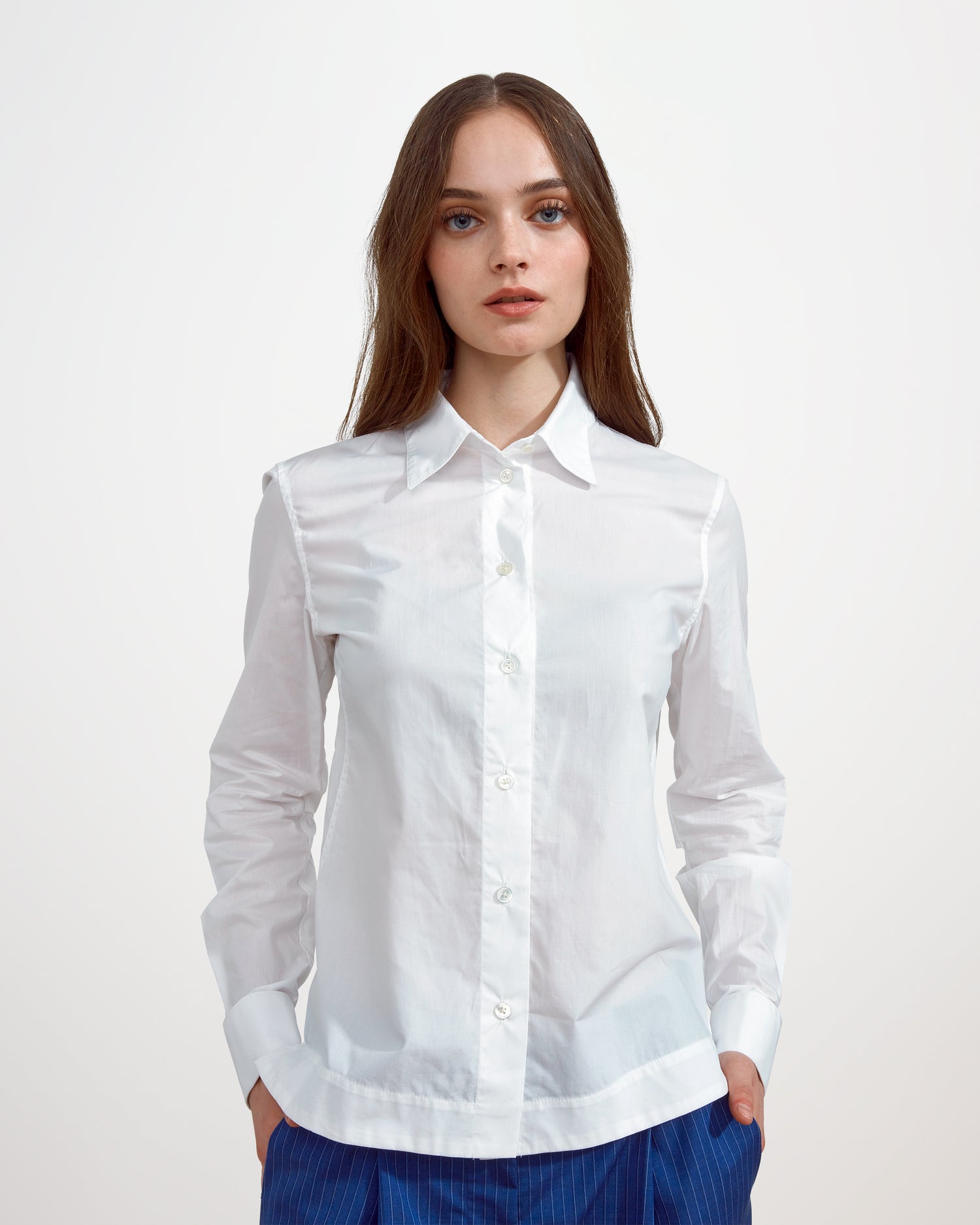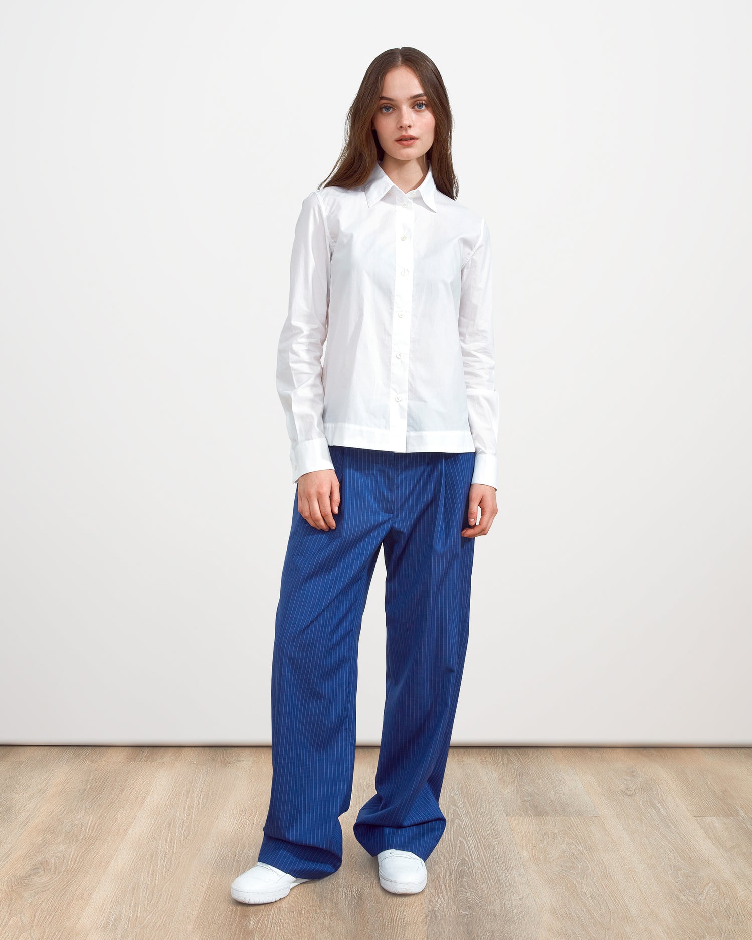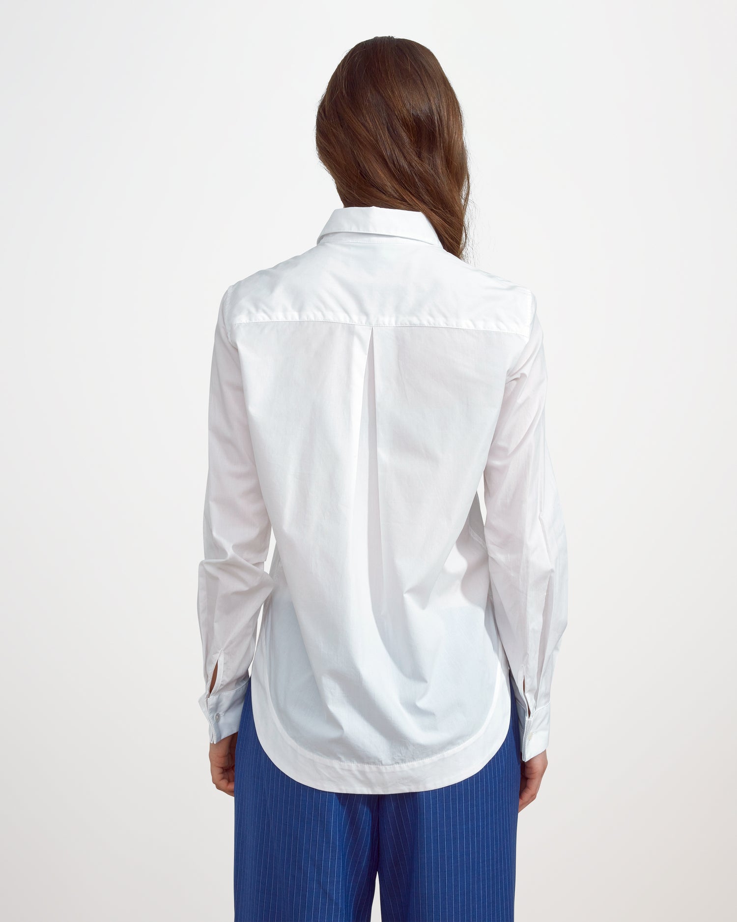 A new feminine take on the classic men's button-down shirt, the Cropped Collared Shirt is crafted in crisp cotton with mother of pearl buttons, a slightly cropped silhouette that gives it an unexpected, airy feeling.