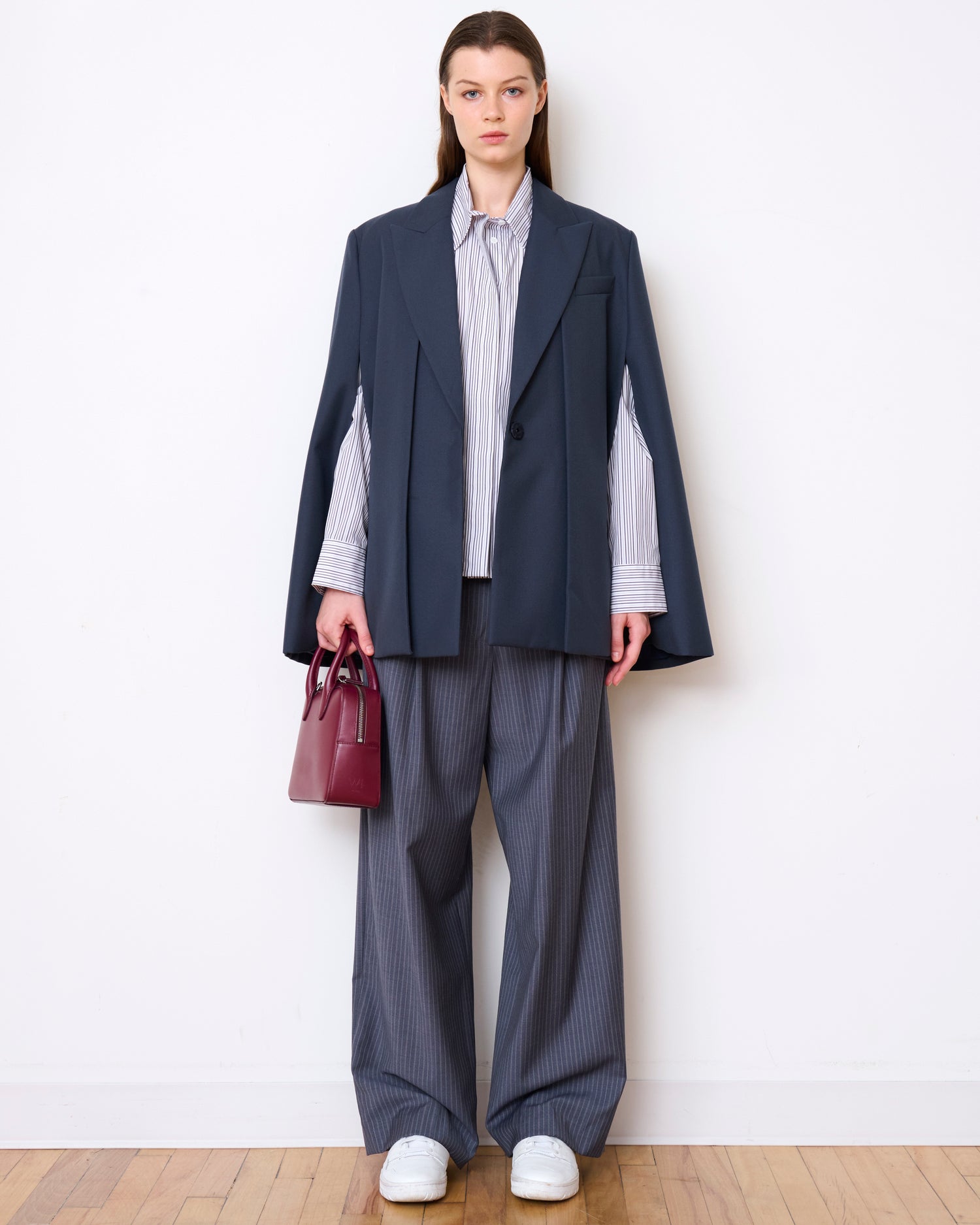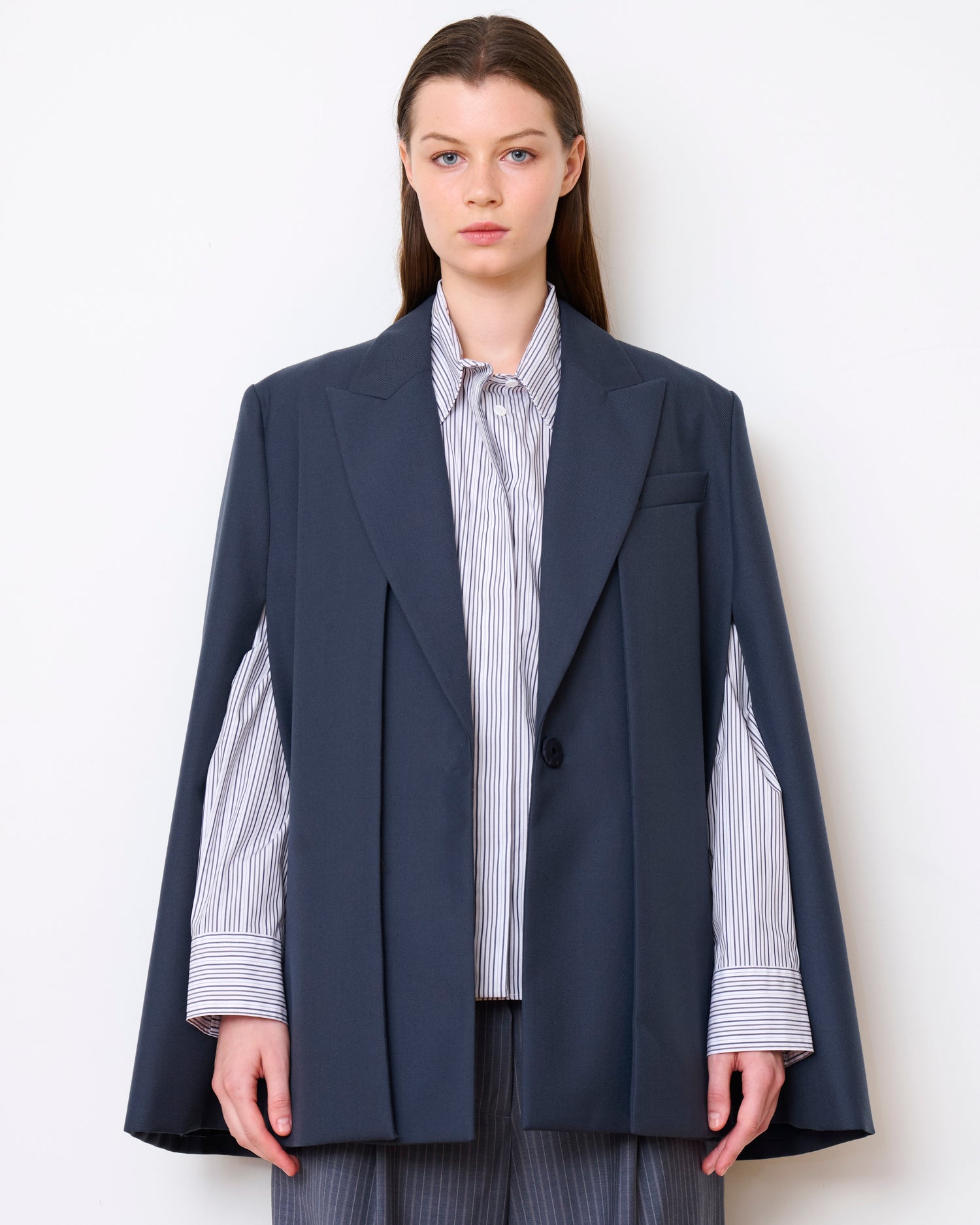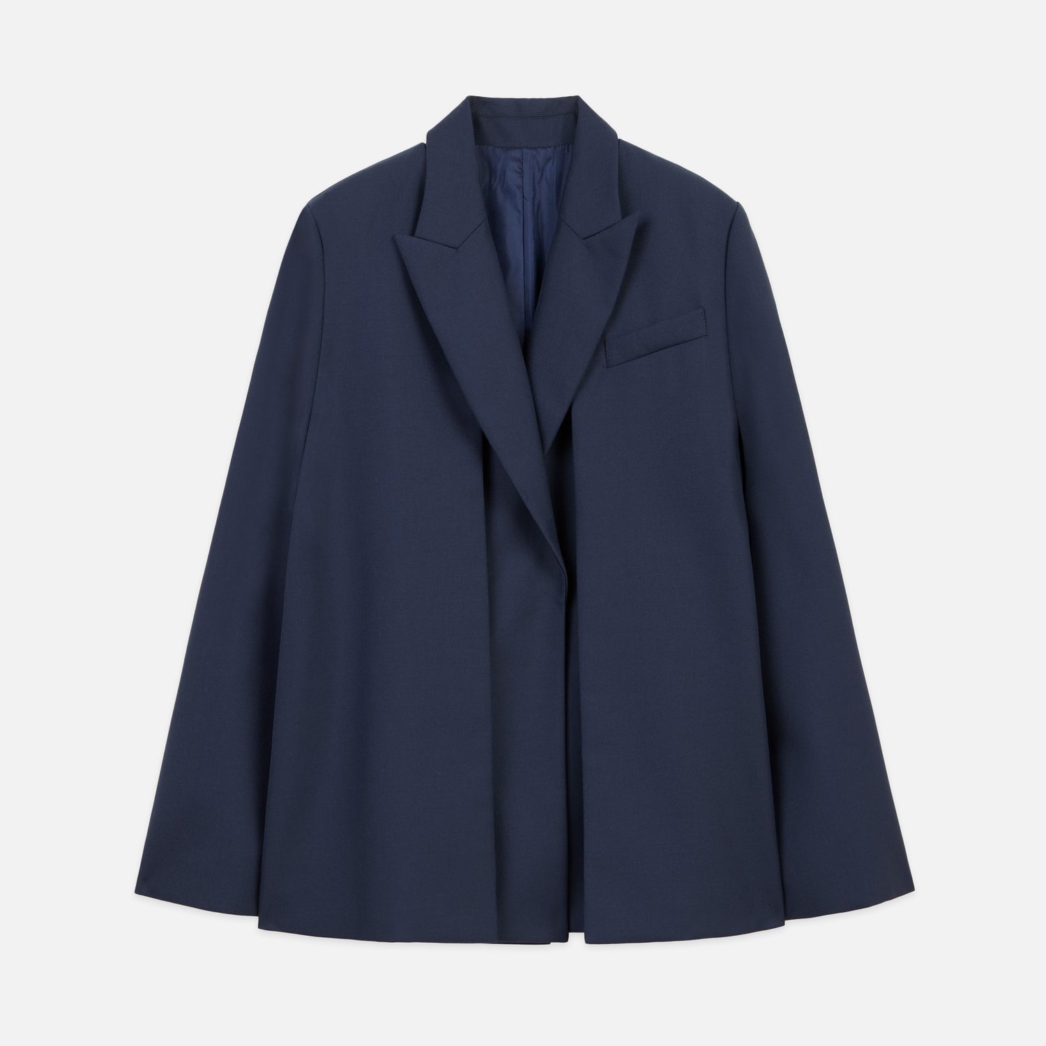 The Avenue Cape is sophisticated and a bit indulgent, adding instant punctuation to any look. This blazer-like cape is a versatile statement piece that is anchored in refined, classic tailoring. Designed with a removable outer shell, it can be worn two ways — as a cape or a vest.