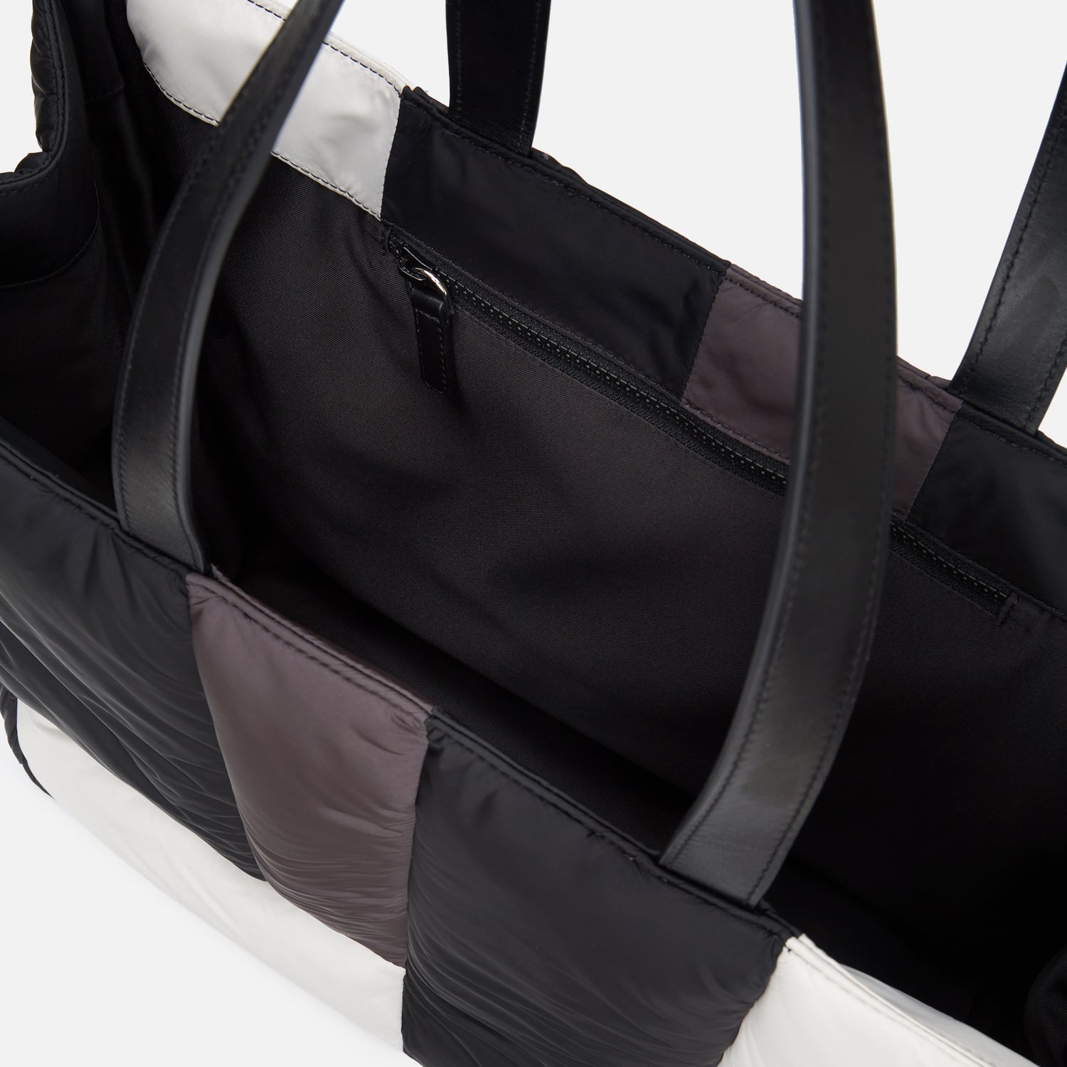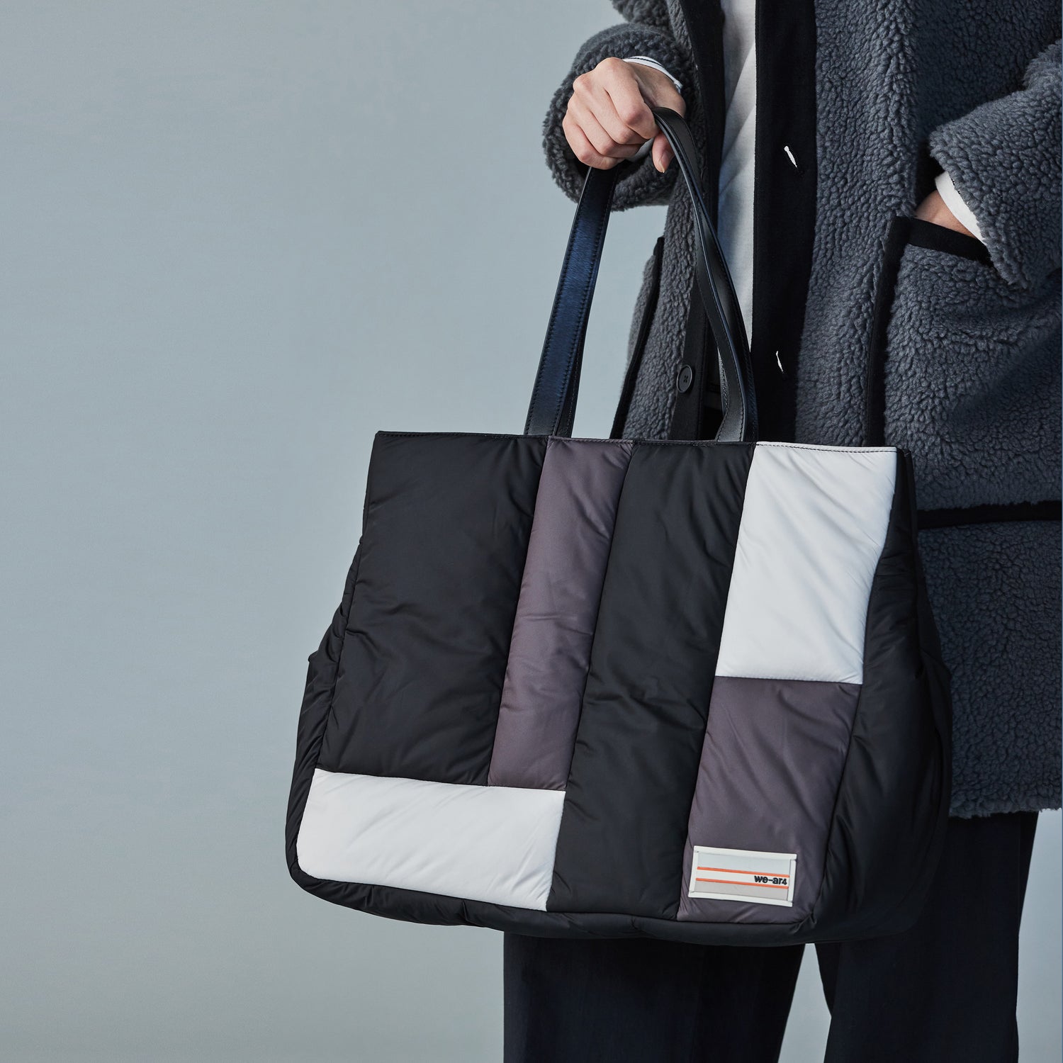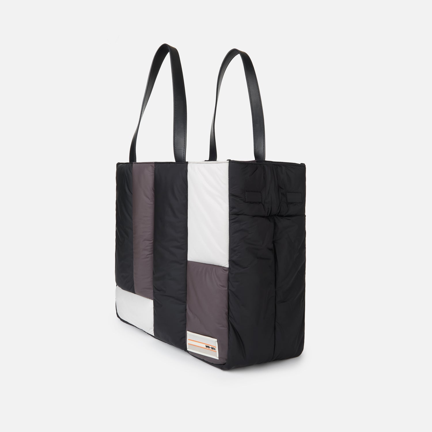 Make every journey an exploration with the Excess. A mashup of quilted panels in luxurious Limonta nylon, the oversized tote can handle the everyday and the out-of-the-ordinary. With an expandable side gusset, Repreve nylon lining and the WE-AR4 Elements silicone patch, the Excess is everything you need in a tote.