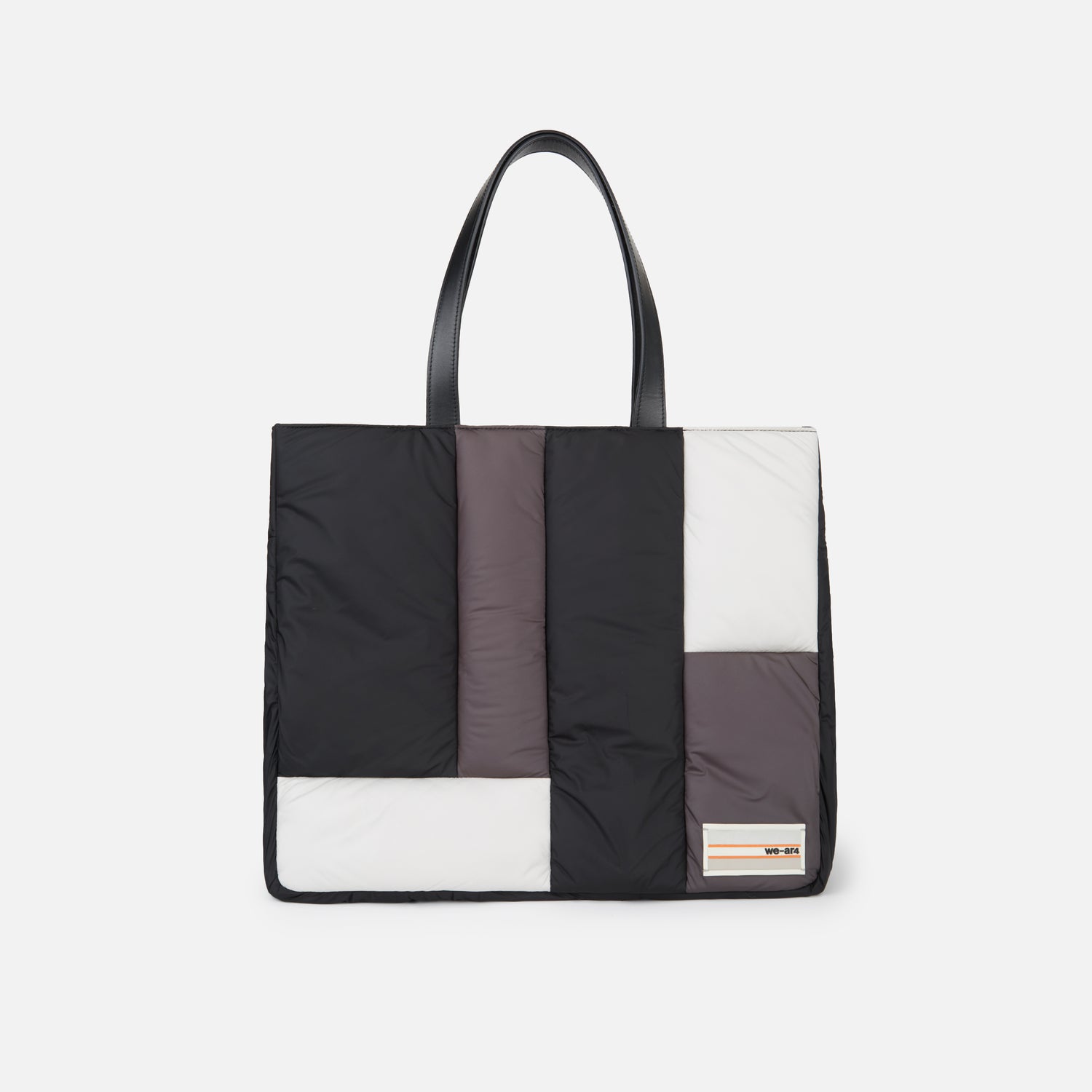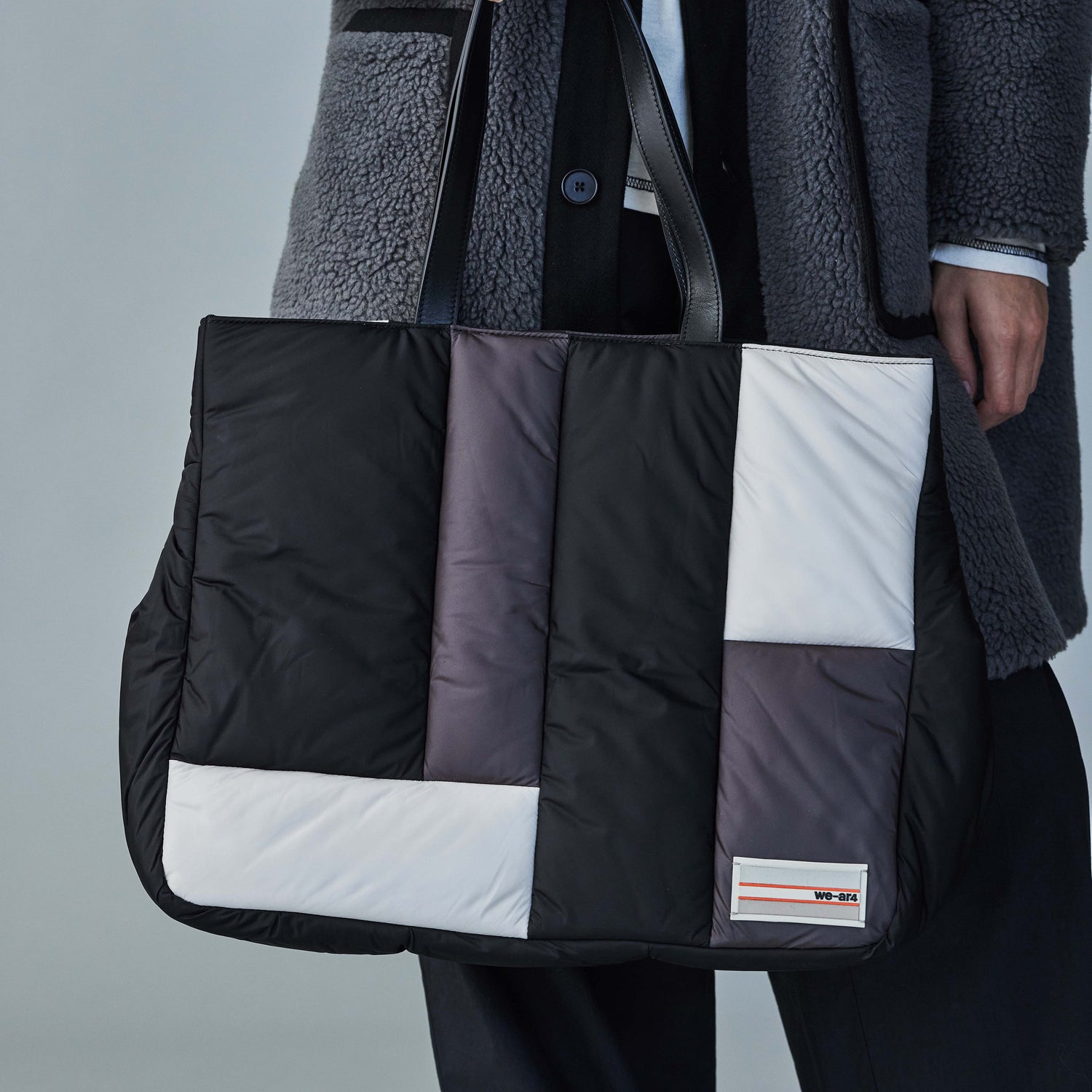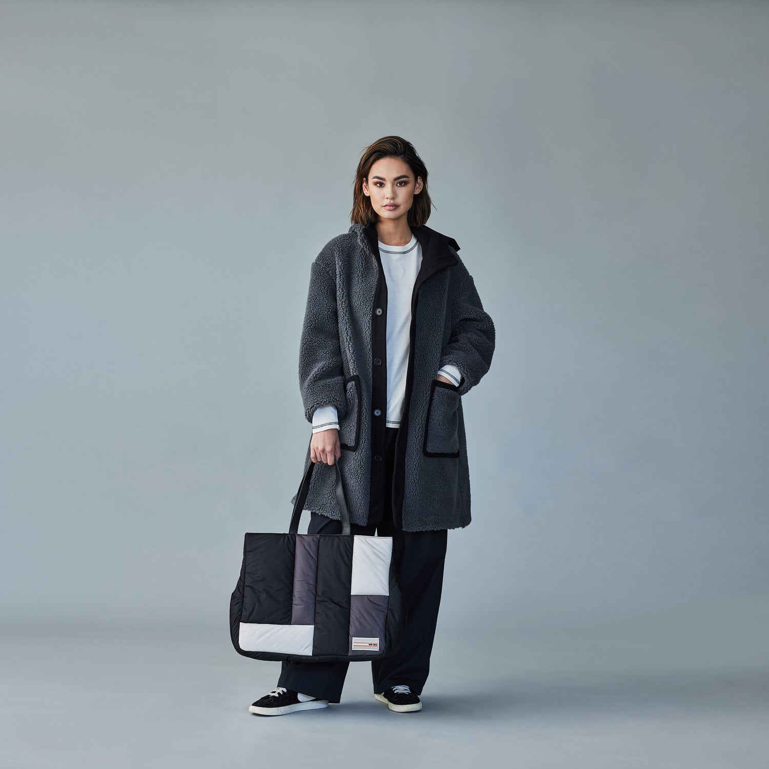 Make every journey an exploration with the Excess. A mashup of quilted panels in luxurious Limonta nylon, the oversized tote can handle the everyday and the out-of-the-ordinary. With an expandable side gusset, Repreve nylon lining and the WE-AR4 Elements silicone patch, the Excess is everything you need in a tote.
