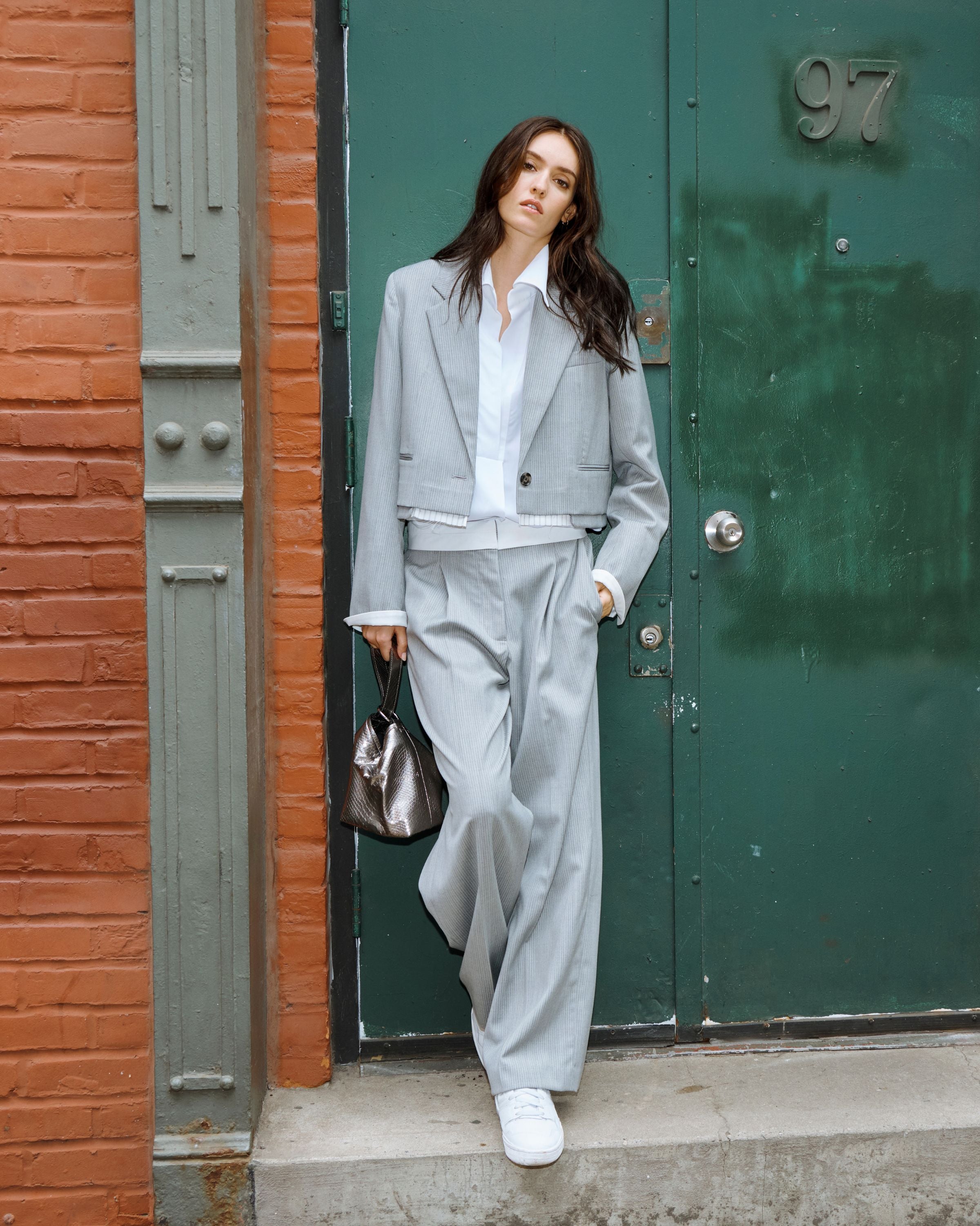 The menswear-inspired, Tribeca Trouser, is crafted in luxurious wool with relaxed clean lines. An exposed waistband curtain and a wide leg silhouette are complemented with feminine pleating.